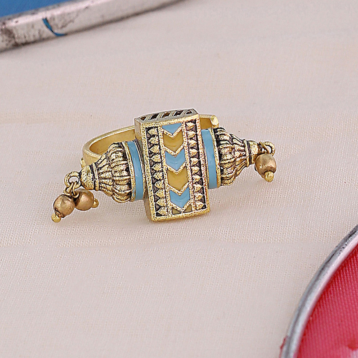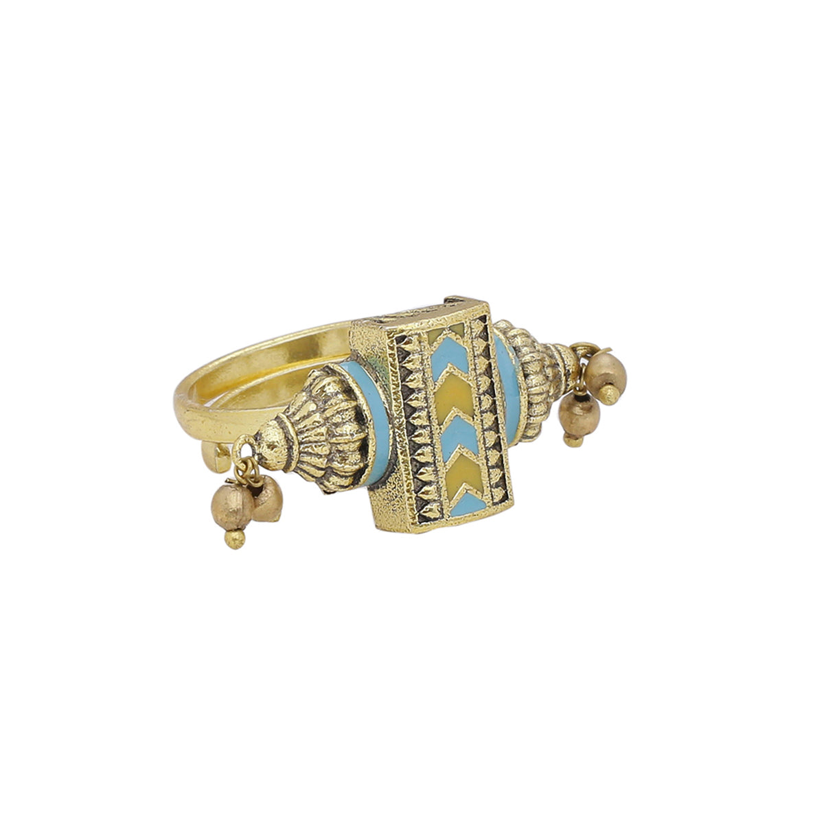 Lightly embellished statement ring inspired by the architecture and motifs of the fort of Gwalior. Enameled and oxidised gold plated, the brass ring is adjustable and can be paired with ethnic and Indo-Western attire.