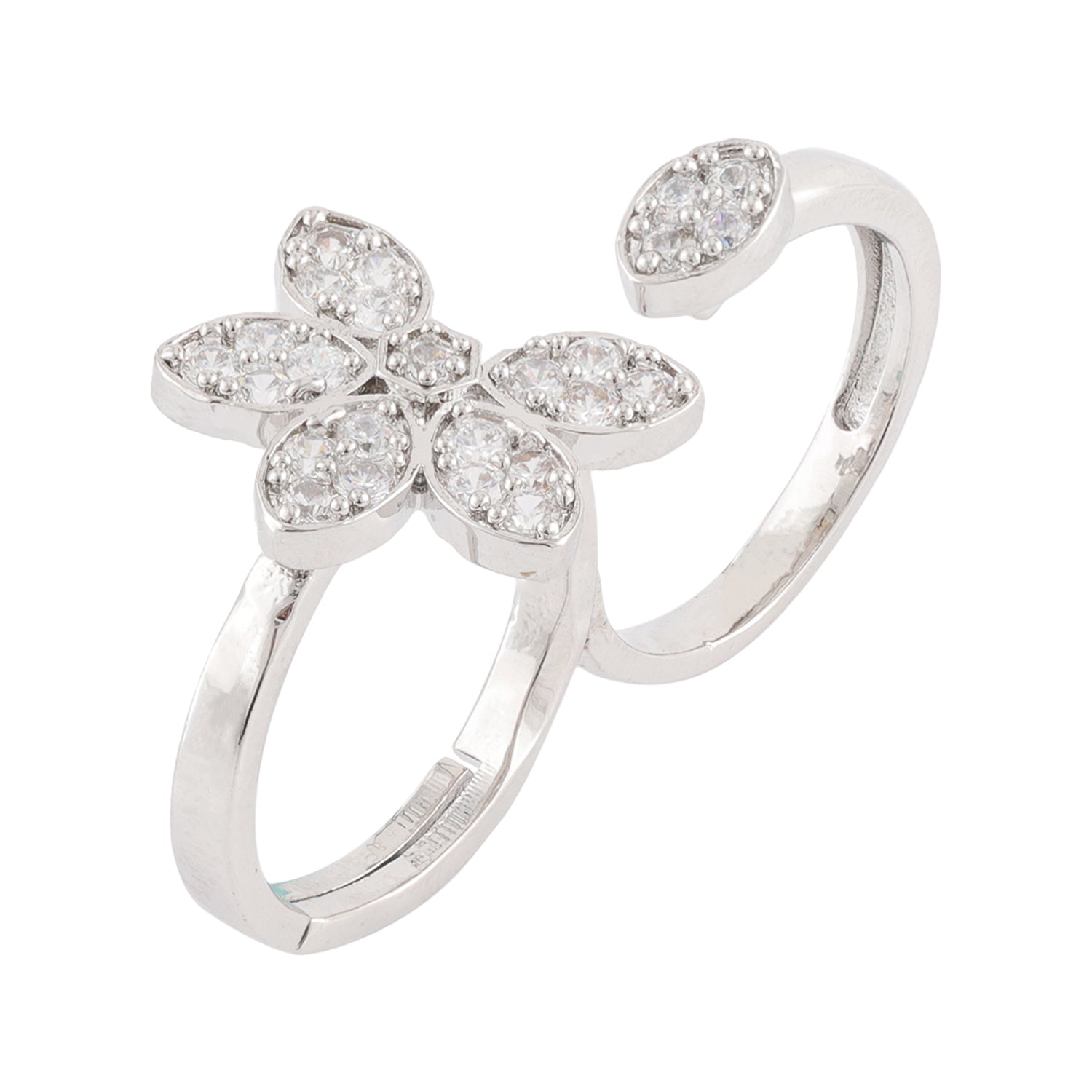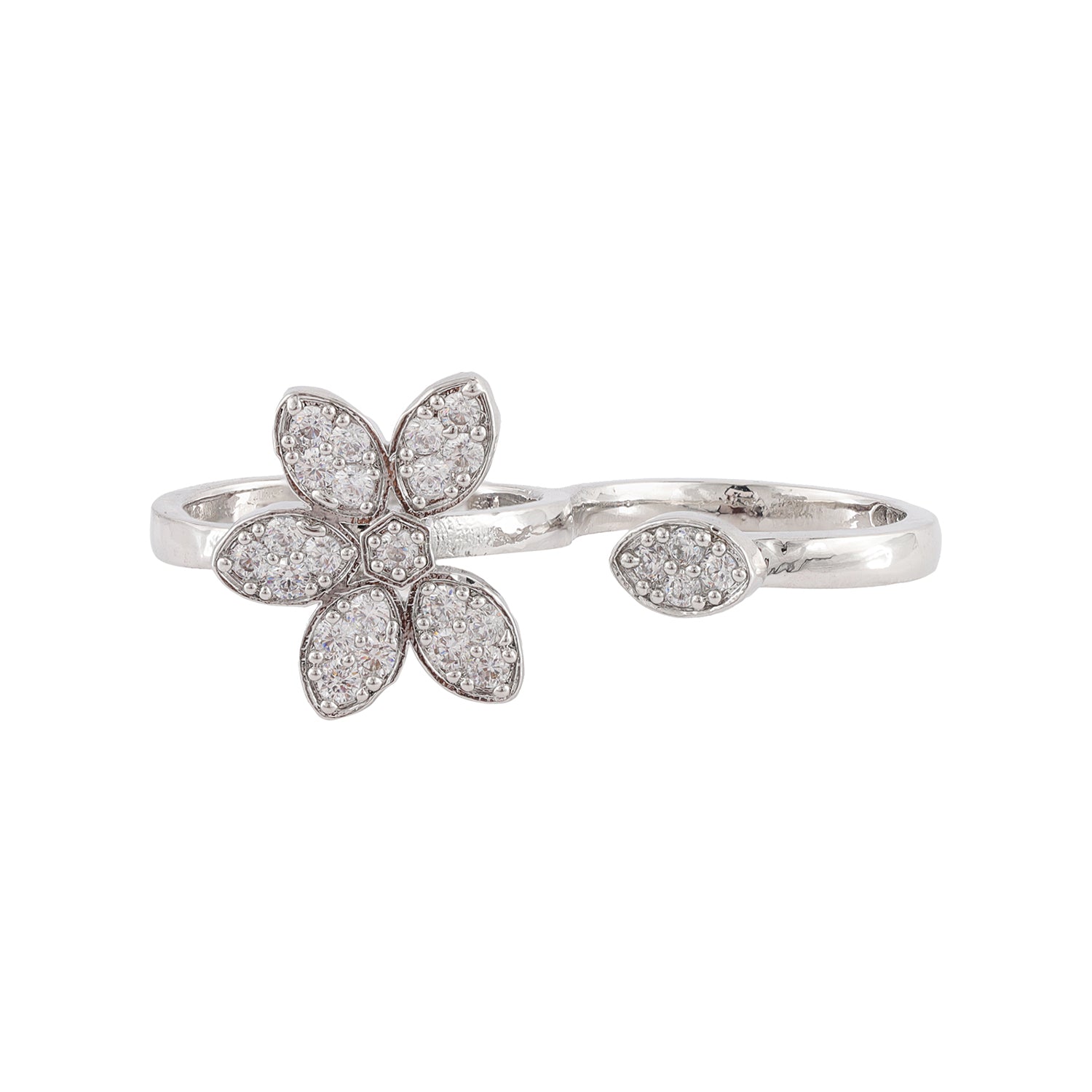Elevate your jewelry game with the Halo Essence Floral Front Open Two Finger Ring, a dazzling fusion of floral artistry and halo brilliance. Crafted in premium brass and finished with radiant white rhodium plating, this American diamond ring is a true showstopper. The dual-finger silhouette is adorned with shimmering CZ stones in a halo setting, echoing the timeless glamour favored by global fashion icons and royalty. Whether you're dressing for a cocktail soirée, wedding celebration, or simply adding sparkle to your everyday wear, this party ring offers unmatched versatility. Pair it with flowy sarees, fusion kurtas, or even a sleek black dress for a look that’s effortlessly chic. A thoughtful gift for women across occasions, Valentine’s Day, Diwali, Rakshabandhan, Christmas, or New Year, this royal ring is perfect for your sister, girlfriend, wife, or mother. It’s not just jewelry; it’s a statement of love, style, and timeless sophistication.