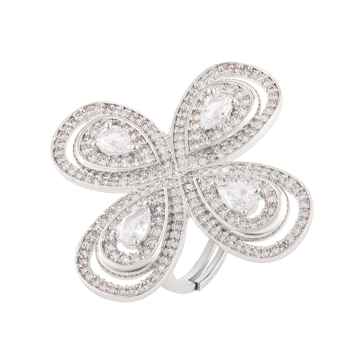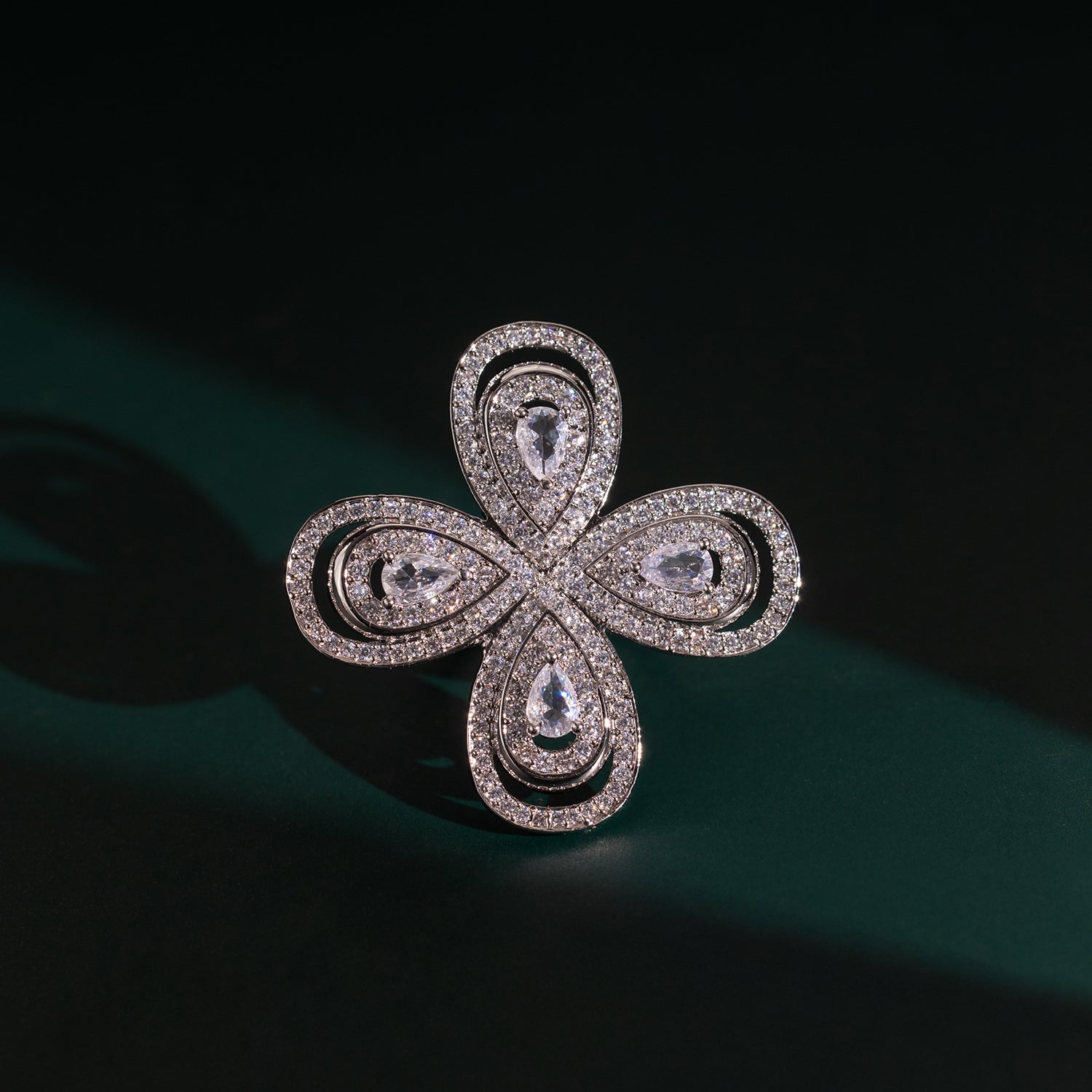 Step into the spotlight with the Halo Essence Glory Statement Ring, a radiant blend of timeless elegance and modern glamour. Crafted in high-quality brass and finished with a luminous white rhodium plating, this American diamond ring features a brilliant pear-cut CZ at its heart, encircled by a halo of petite shimmering stones that echo vintage charm with a contemporary twist. Inspired by the iconic halo diamond setting loved by fashionistas and royalty alike, this cocktail ring for women is part of the Halo Essence collection, designed to elevate your party look, wedding ensemble, or even everyday chic. Whether paired with a silk saree, a fusion kurta set, or a sleek evening gown, its versatile sparkle makes it a go-to accessory. A perfect gift for women—be it your sister, mother, wife, girlfriend, or best friend—this royal ring is ideal for occasions like Valentine’s Day, Diwali, Rakshabandhan, Christmas, or New Year. It’s not just a ring, it’s a statement of love, style, and celebration.