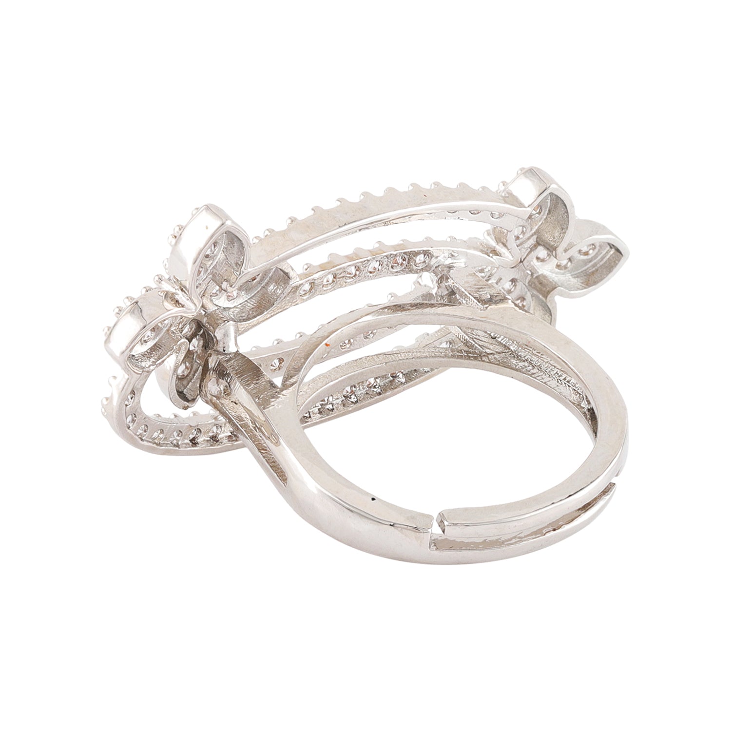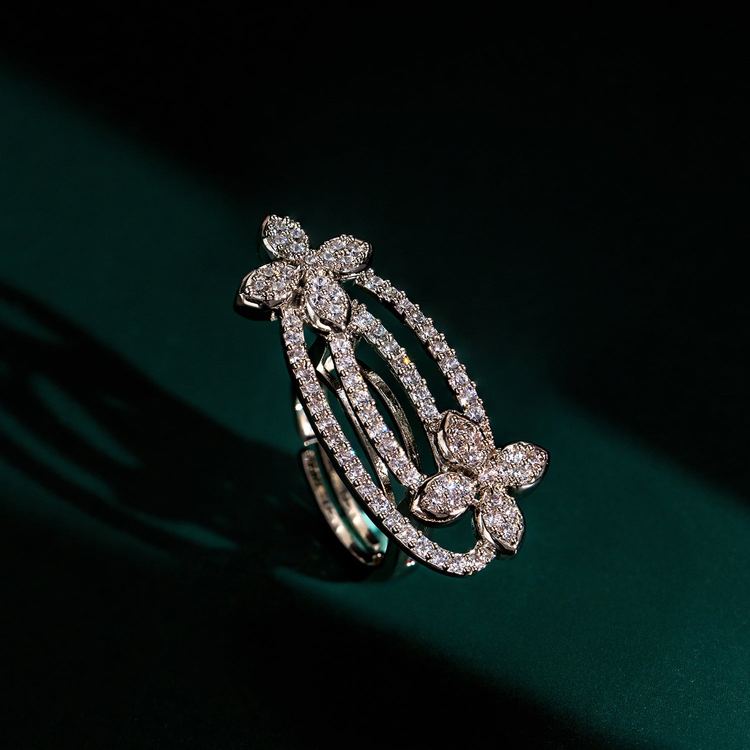 Step into the spotlight with the Halo Essence Luster Floral Statement Ring—a radiant fusion of timeless charm and modern sophistication. Crafted in high-quality brass and finished in luminous white rhodium, this American diamond ring showcases a dazzling floral motif, where a brilliant CZ center is encircled by a halo of petite stones that shimmer with every movement. Inspired by the iconic halo diamond setting loved by royalty and fashionistas alike, this cocktail ring for women is a celebration of elegance that transcends trends. Whether you're dressing up for a wedding, a festive soirée, or simply adding sparkle to your everyday wear, this versatile piece pairs beautifully with ethnic ensembles, fusion looks, or chic western outfits. A thoughtful gift for Valentine’s Day, Rakshabandhan, Diwali, or Christmas—it’s perfect for your sister, wife, girlfriend, mother, or that special someone who deserves a touch of royalty.