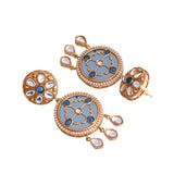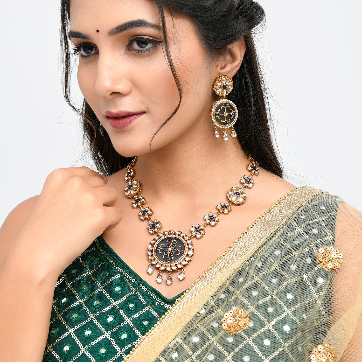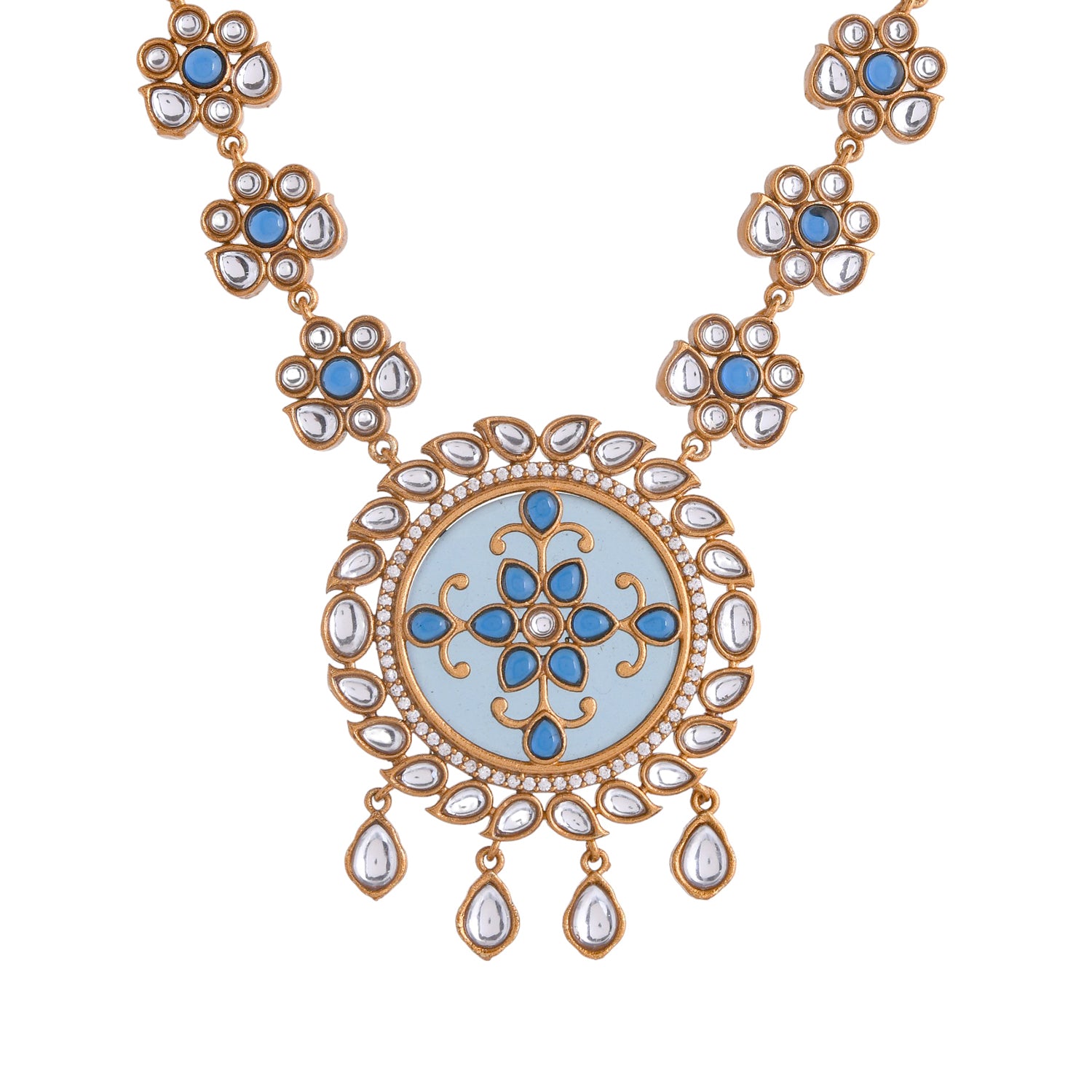 Hasli Elegant Long Blue Floral Kundan Studded Golden Necklace Set
