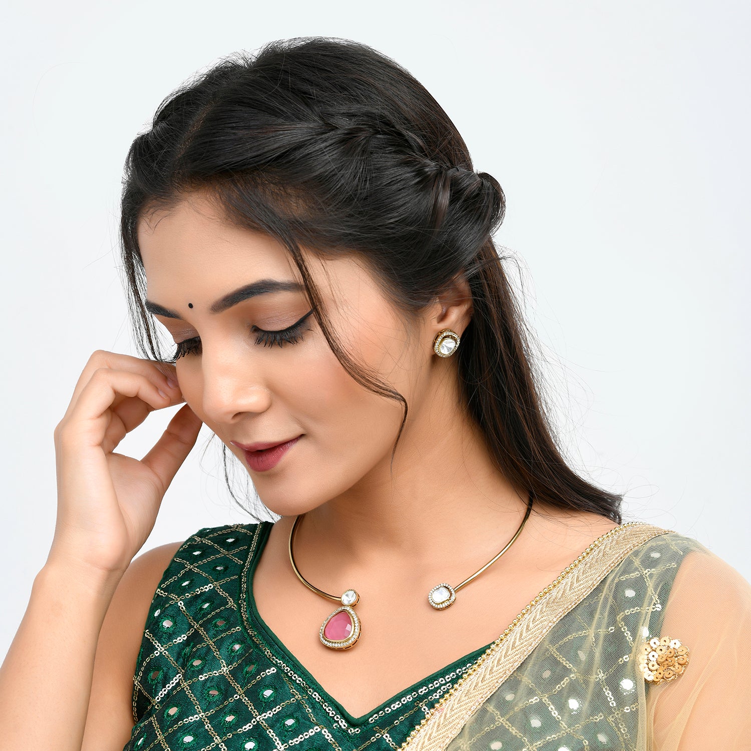 Crafted from high-quality brass, this exquisite Hasli Collection necklace set features a gold-tone necklace adorned with a captivating kundan stone pendant. The central pink stone is surrounded by intricate kundan work, creating a stunning focal point. The set includes matching earrings, each showcasing a single kundan stone encased in brass. Elevate your ensemble with this timeless piece that seamlessly blends tradition and contemporary style.