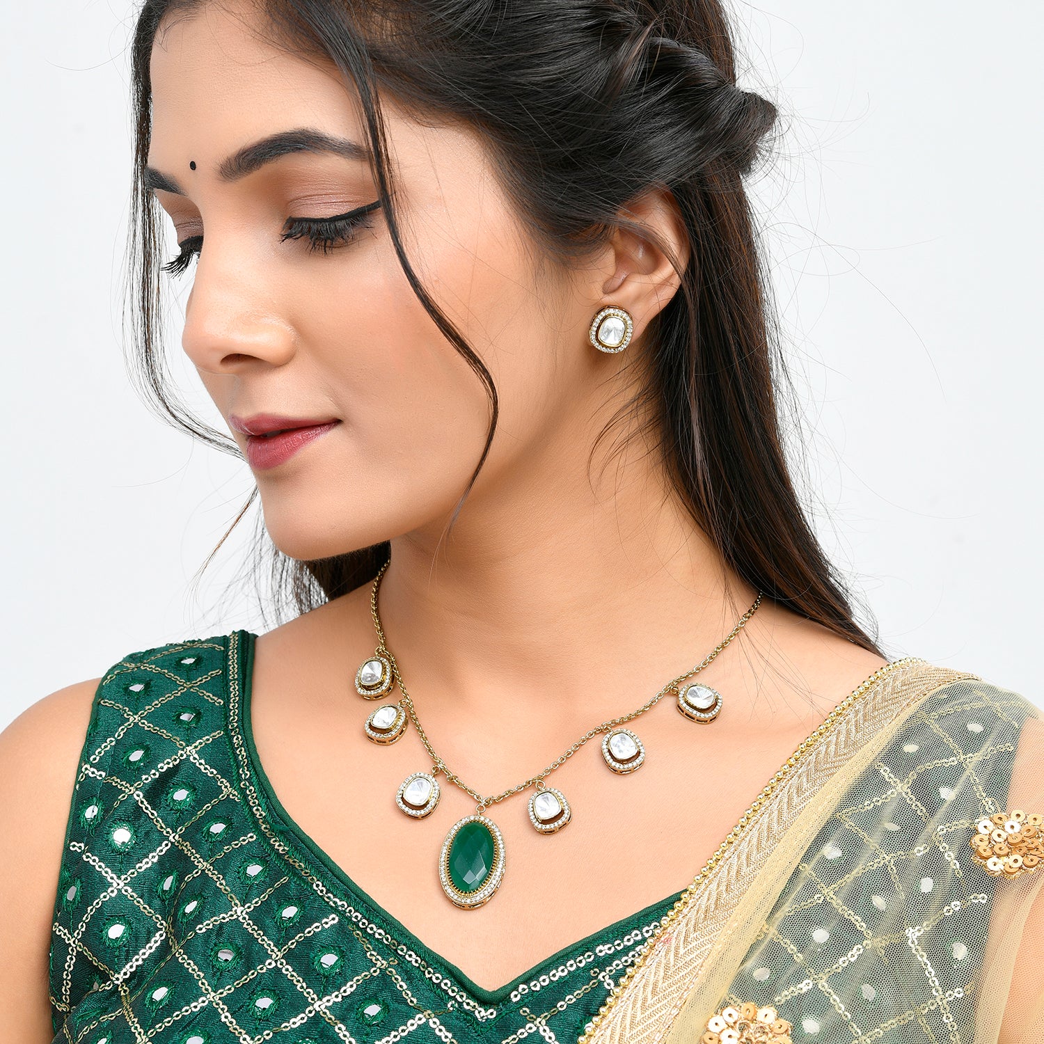 Elevate your style with our exquisite “Hasli” collection. Crafted from high-quality brass, this necklace set showcases intricate kundan work. The central pendant features a captivating green stone, surrounded by delicate white kundan stones. The matching earrings complete the ensemble, making it a timeless choice for special occasions. Embrace tradition and elegance with this regal jewelry set.