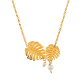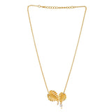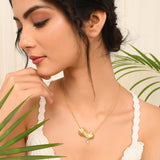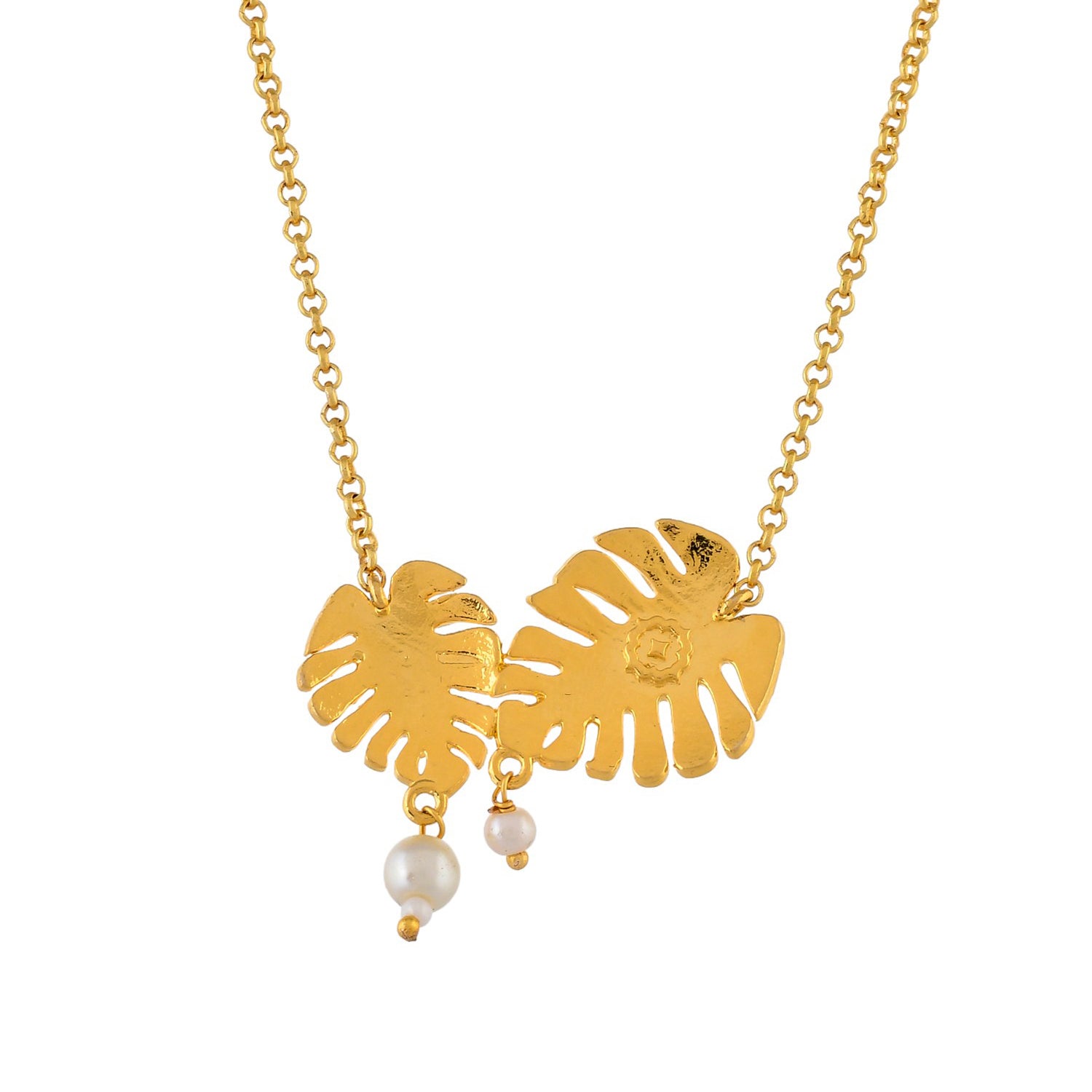 The beautiful and dainty tropical elements have inspired this beachy overlapping palm leaves motif necklace, which has been fashioned out of brass. Lightly embellished and gold plated, the necklace can be paired with just about everything.