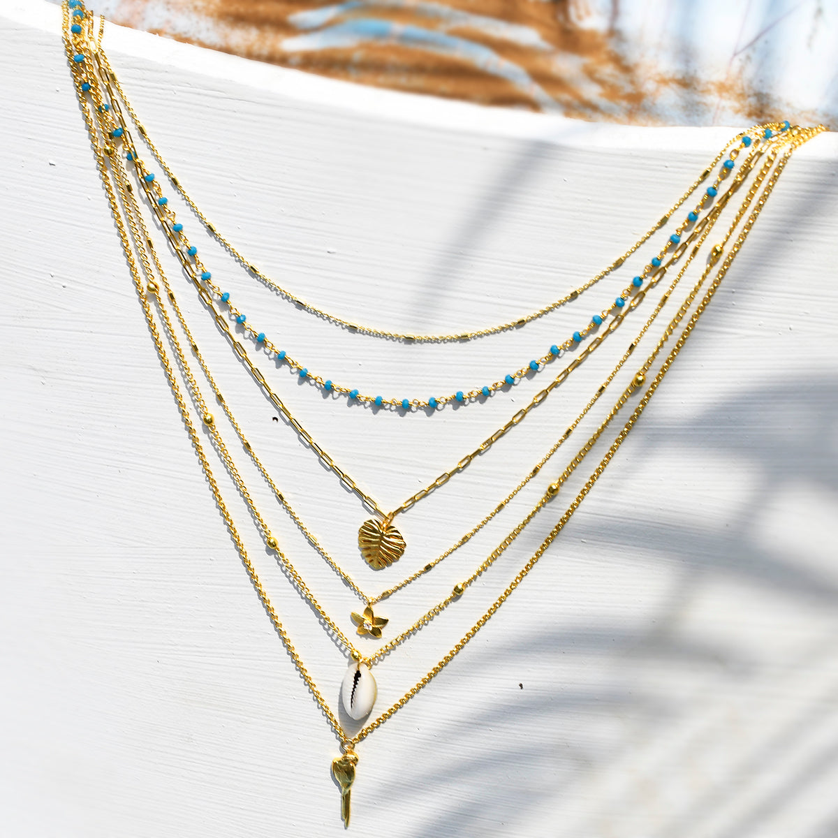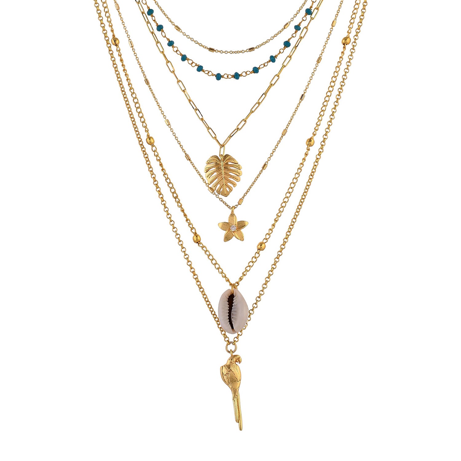 The beautiful and dainty tropical elements have inspired this beachy motifs layered necklace, which has been fashioned out of brass. Embellished with a single white, real seashell and gold plated, the necklace can be paired with just about everything.