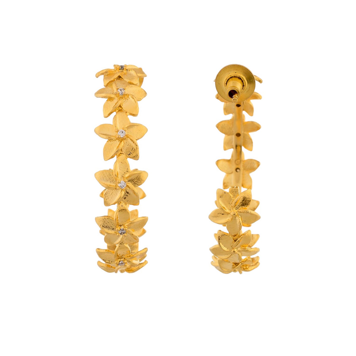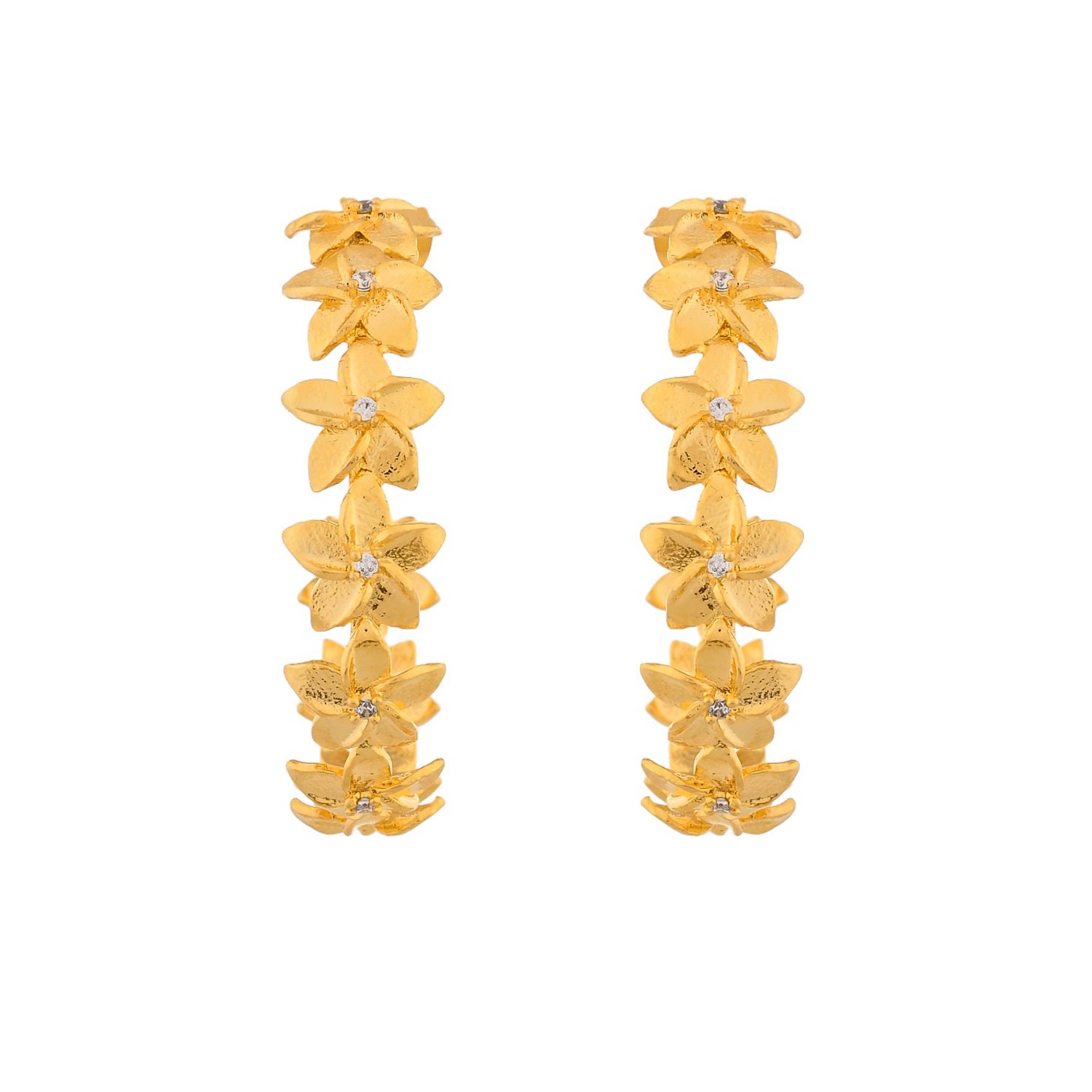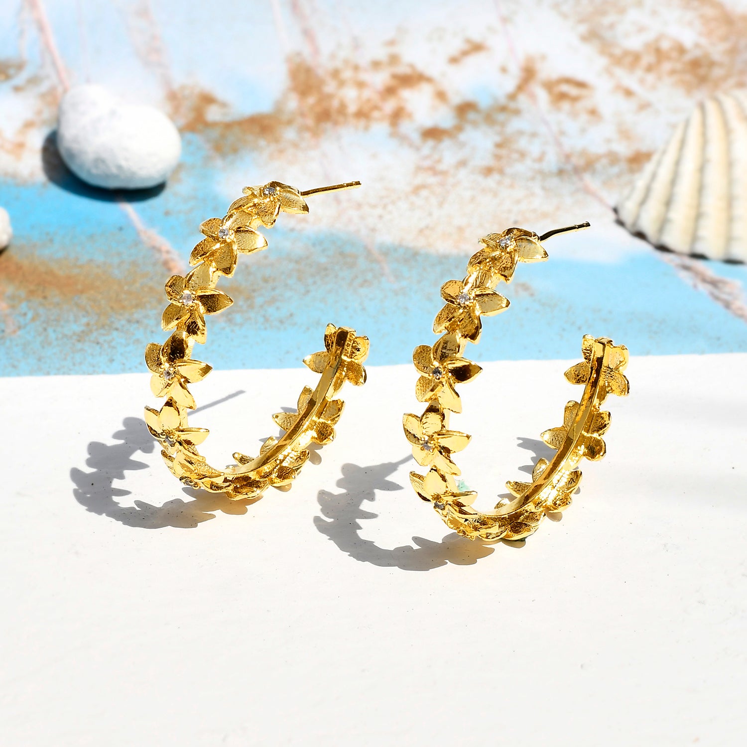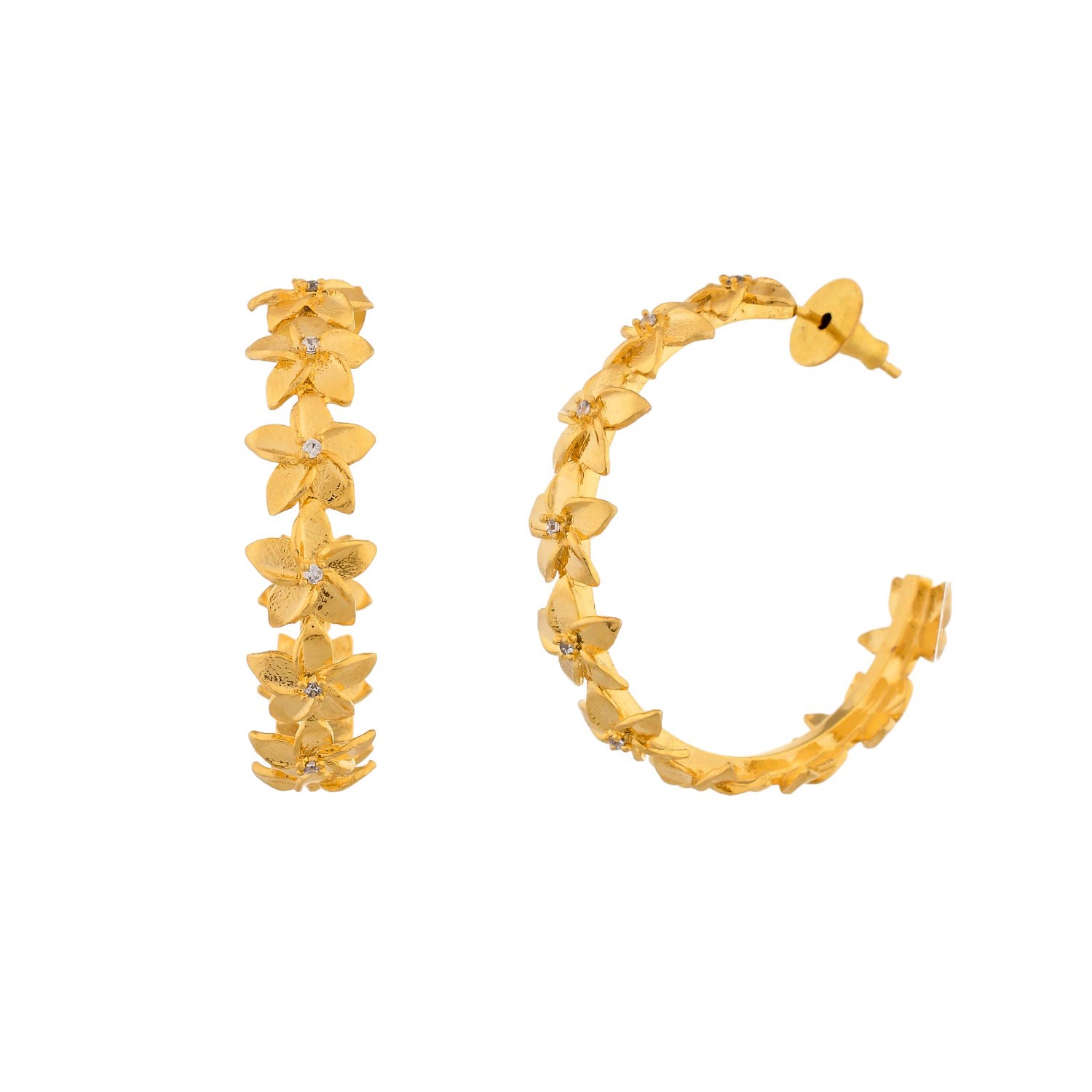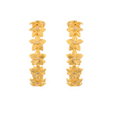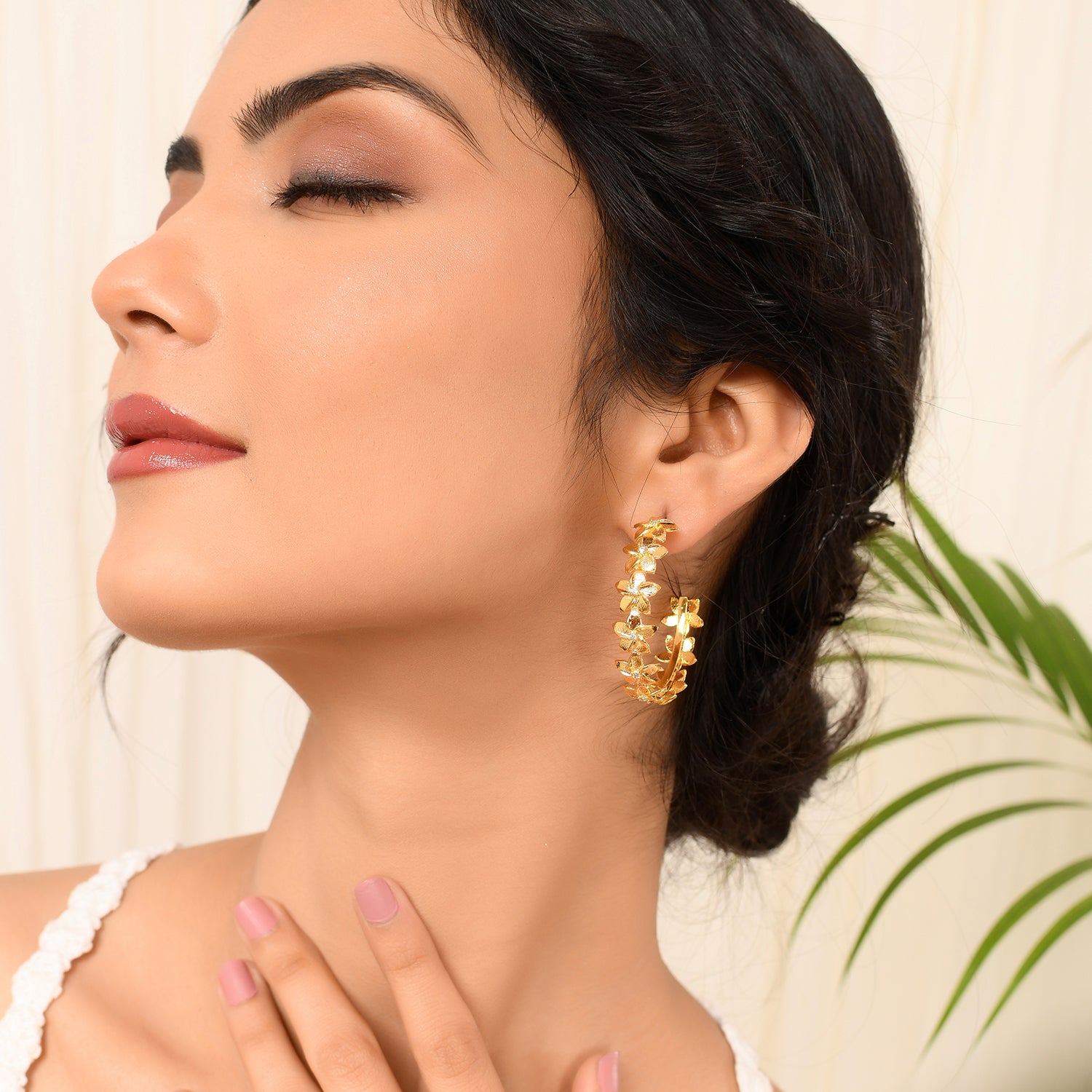 Inspired by the beaches, tropics and their many fascinating elements, these hoop style earrings feature multiple beach flower motifs. Made from brass and yellow gold plated, the chunky earrings promise to be a comfortable wear at all times and can be paired with just about everything.
