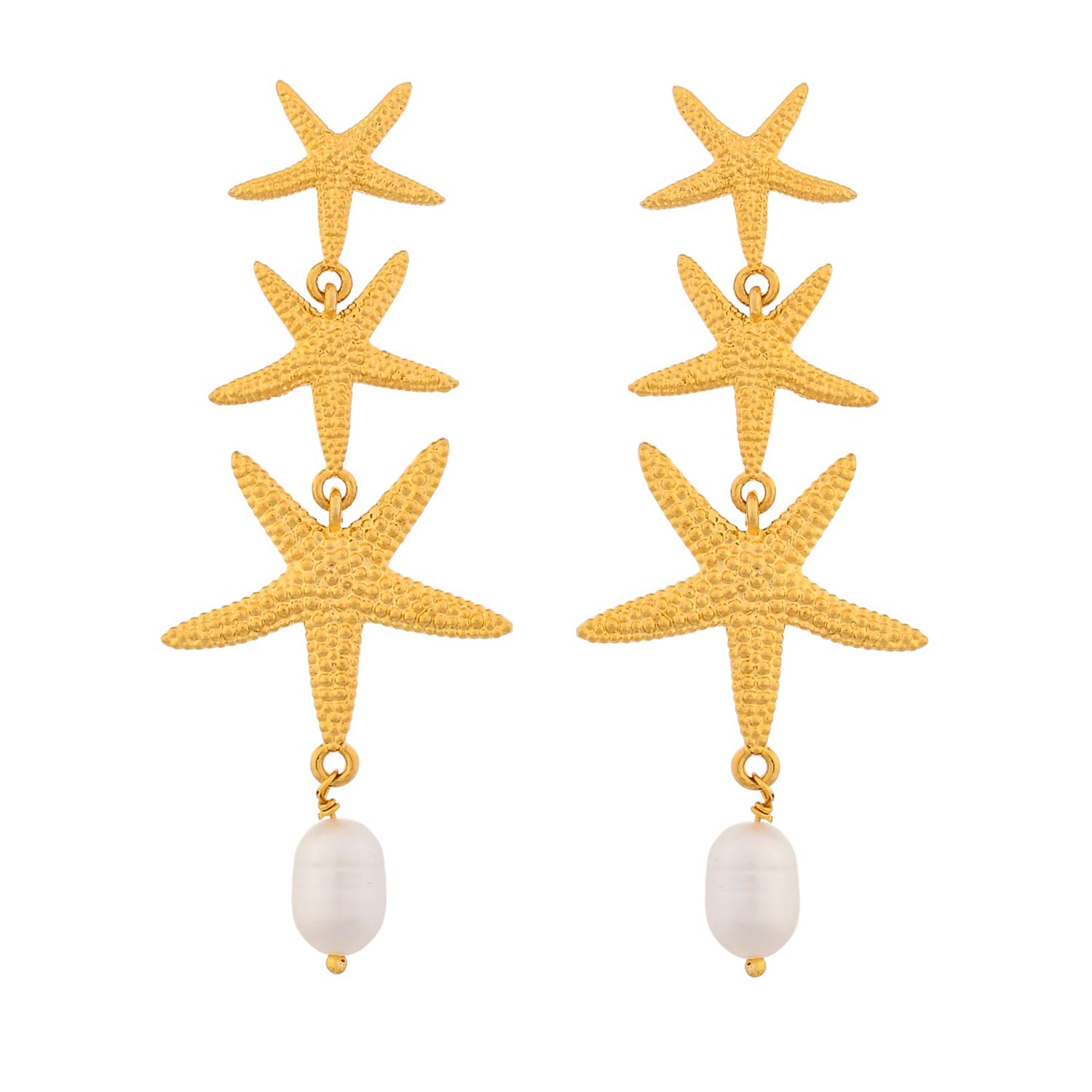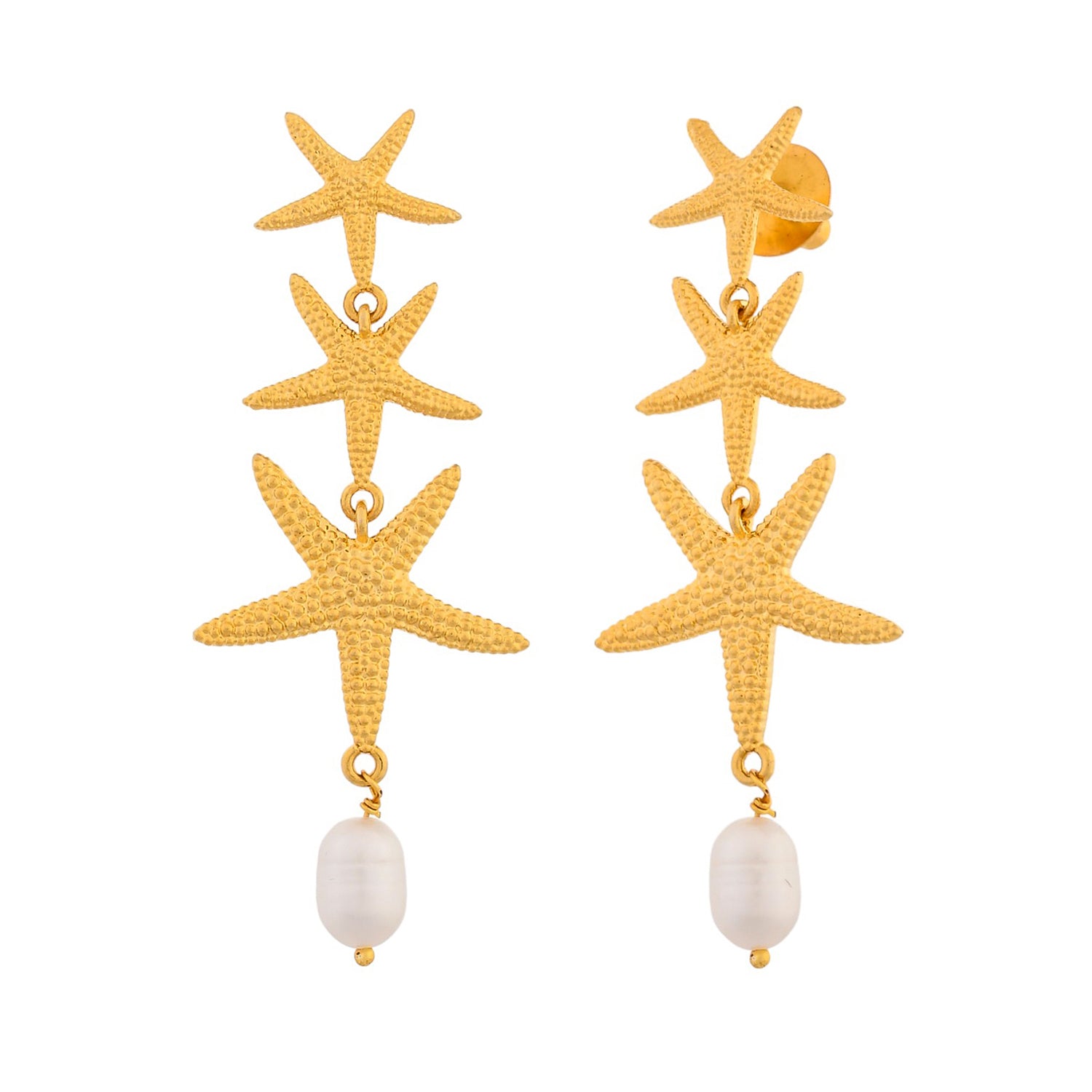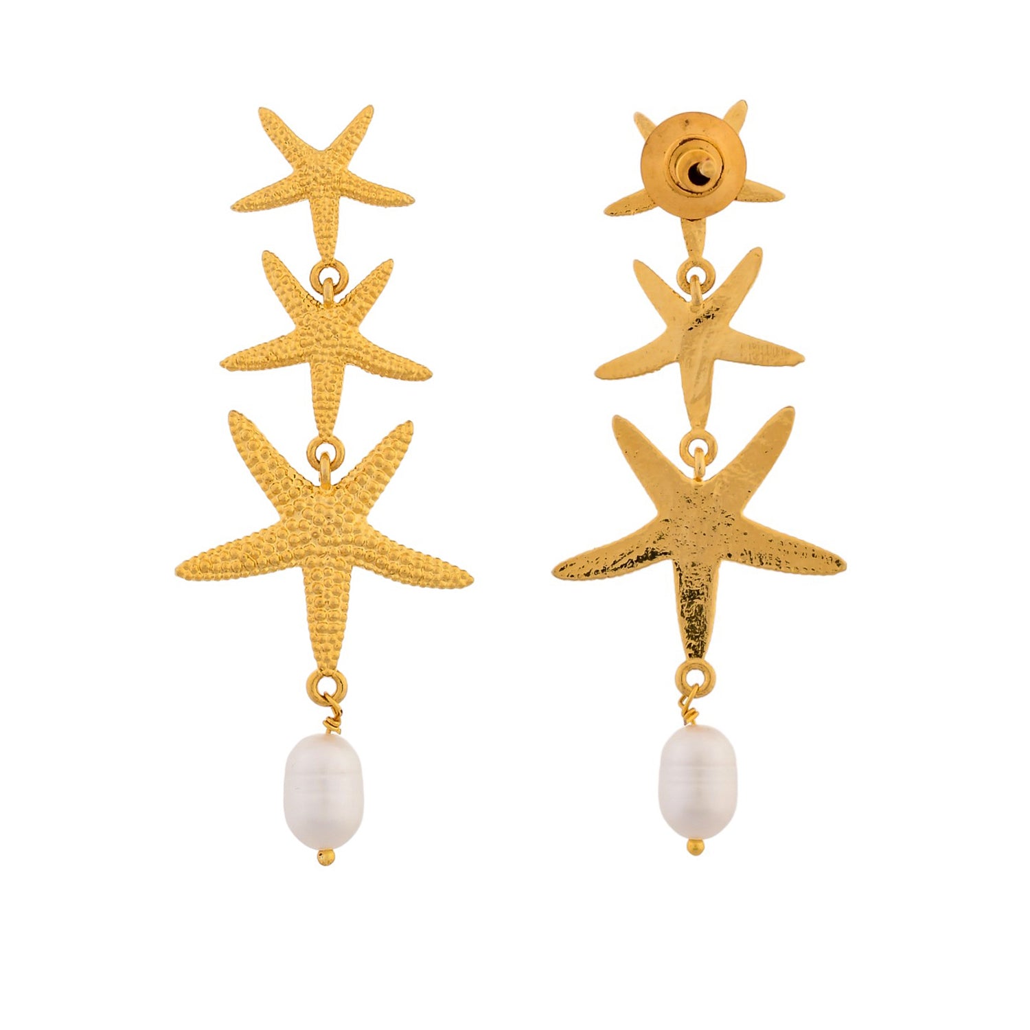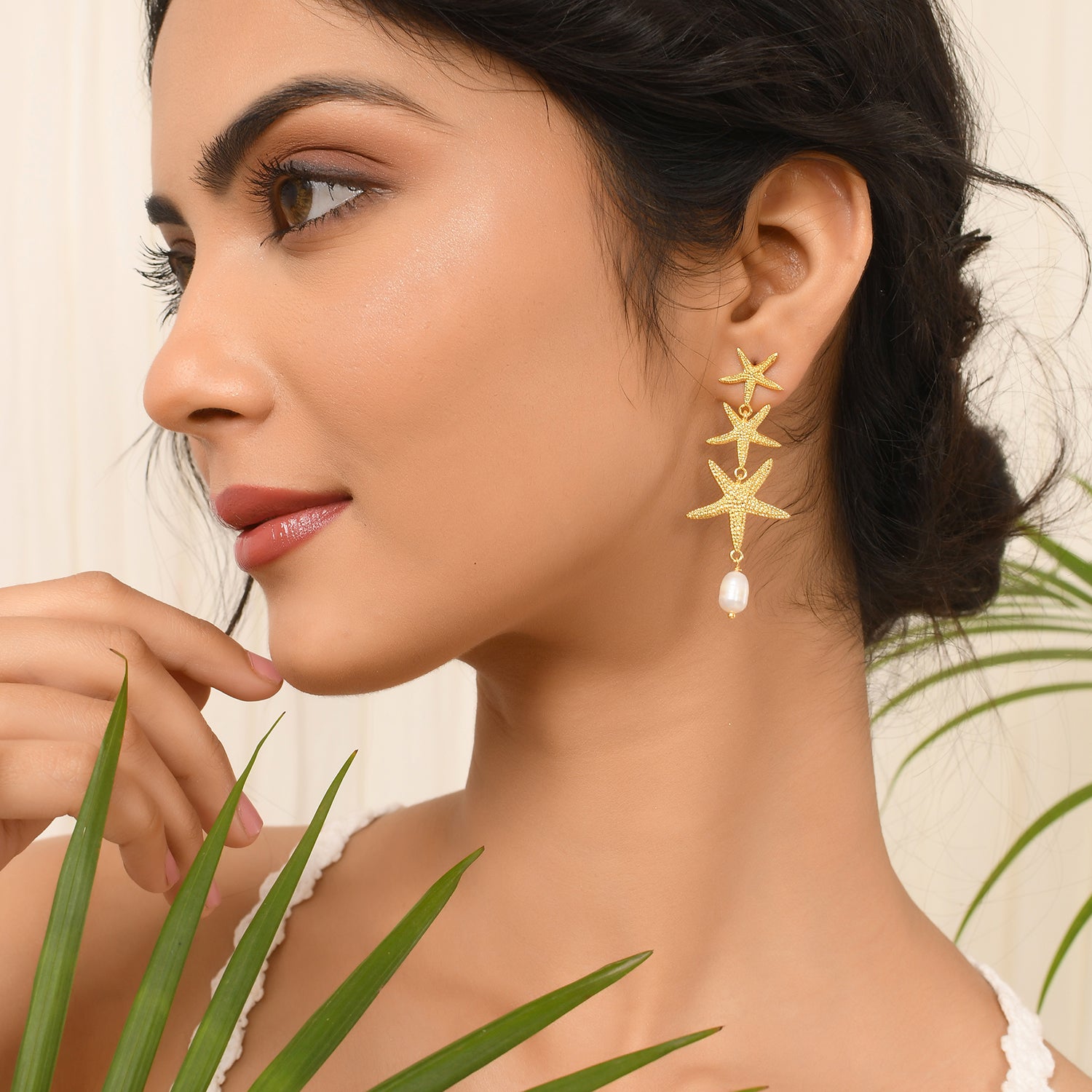 Dainty and charming white pearls embellished drop earrings, inspired by the tropics and their lovely elements. Shaped into starfish motifs, the pair has been fashioned out of brass. Yellow gold plating adds to the charm of these comfortable and versatile earrings.
