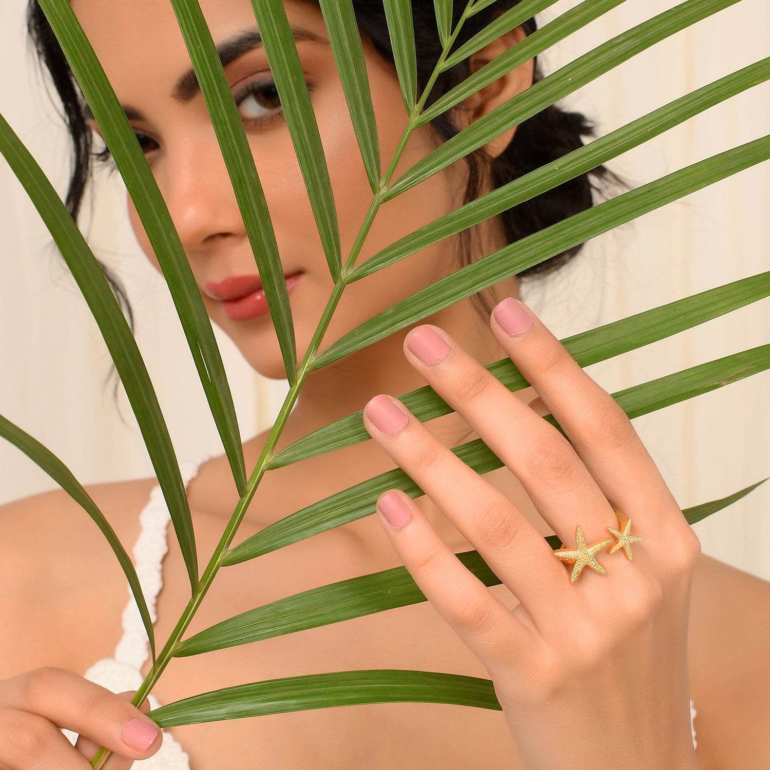 The lovely and fascinating tropical and beach elements have inspired this starfish motifs ring, which is eye-catching and charming. Made from brass, the adjustable ring has been given a yellow gold plating that adds to its allure. Adjustable for maximum comfort and versatile.