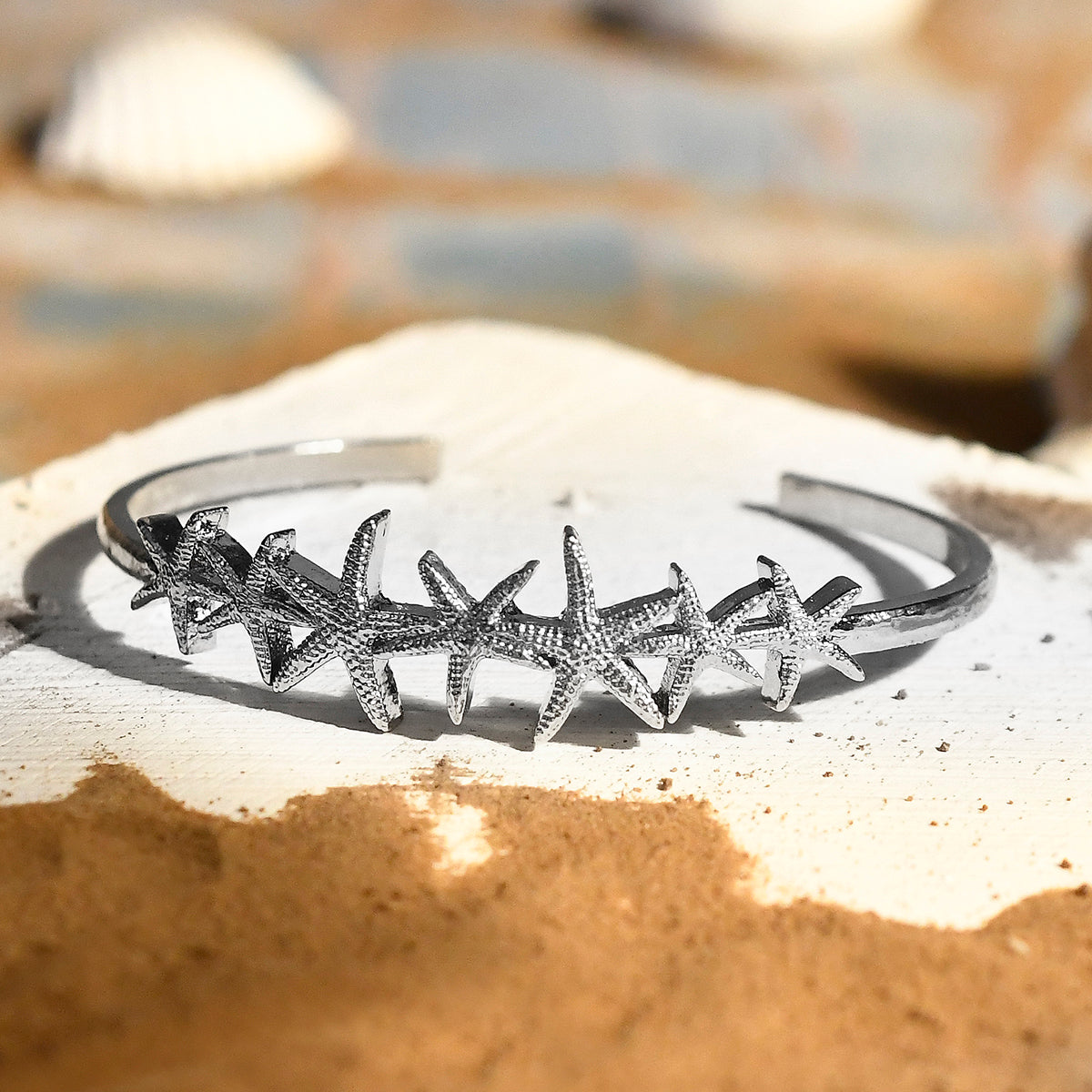 Inspired by the beaches, tropics and their many fascinating elements, this cuff bracelet has been adorned with multiple starfish motifs. Made from brass and White Rhodium plated, the dainty bracelet is adjustable for maximum comfort and can be paired with just about everything.