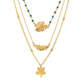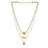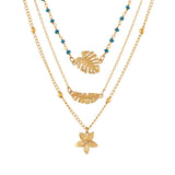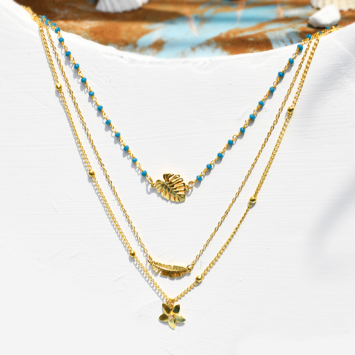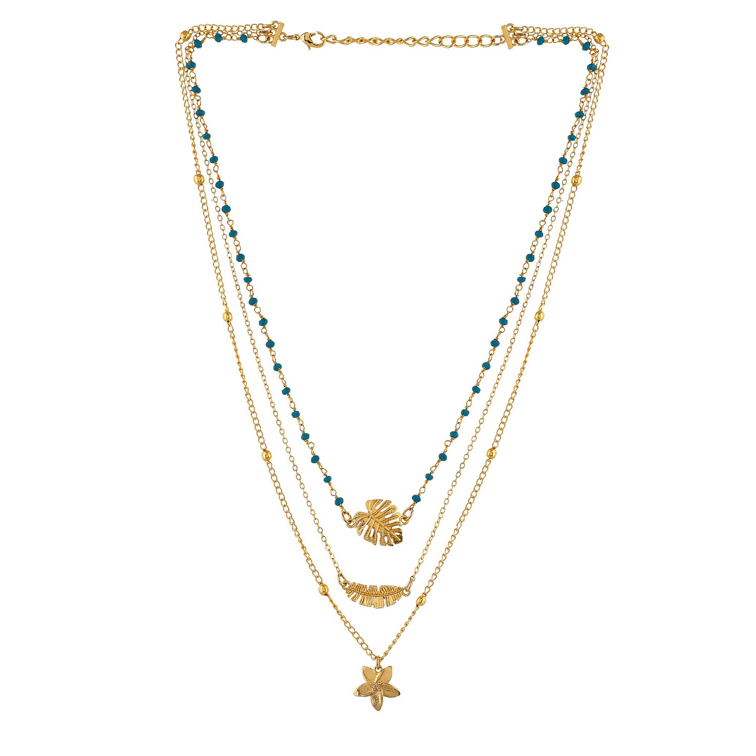 The beautiful and dainty tropical elements have inspired this beachy floral and palm leaves motifs three-strand necklace, which has been fashioned out of brass. Lightly embellished and gold plated, the necklace can be paired with just about everything.