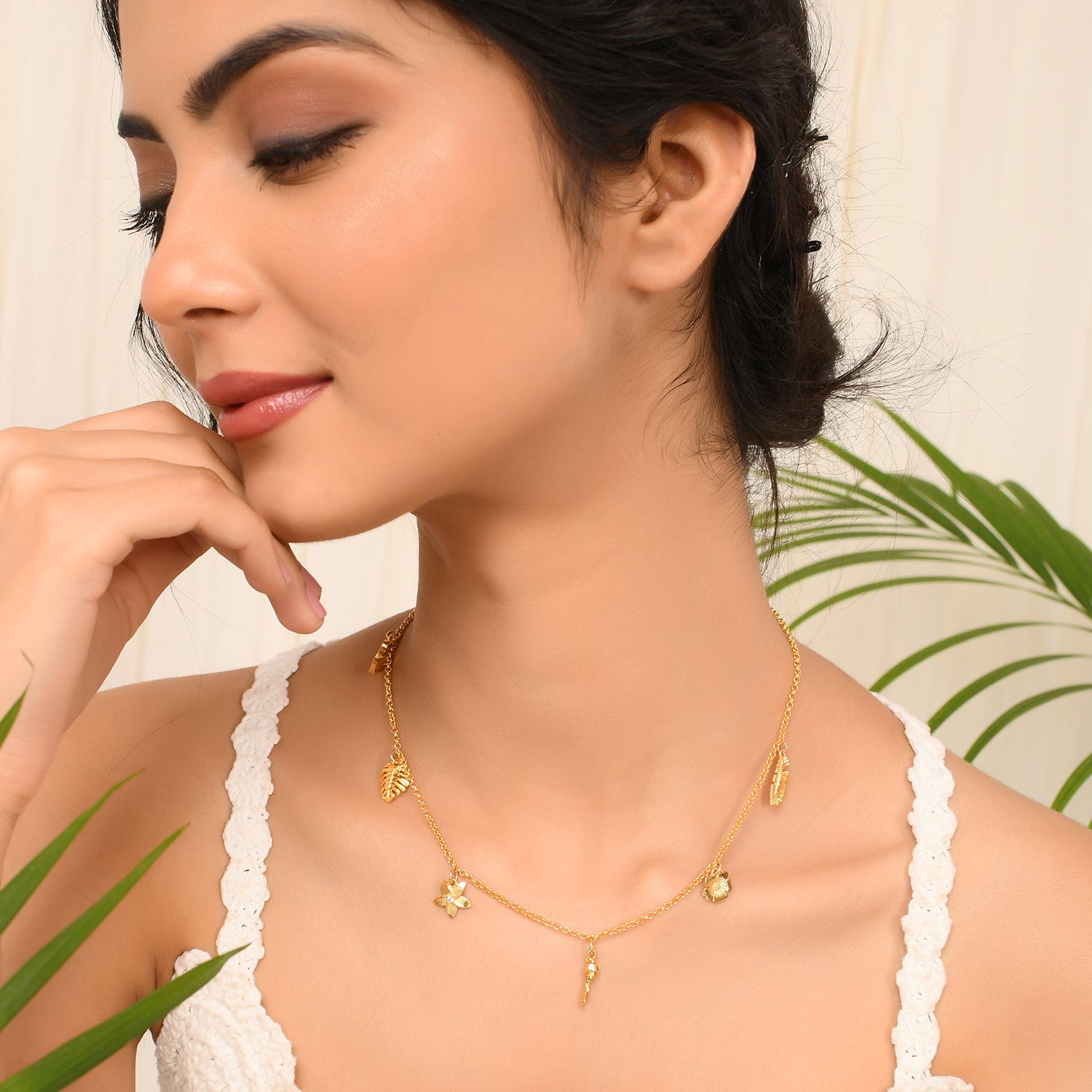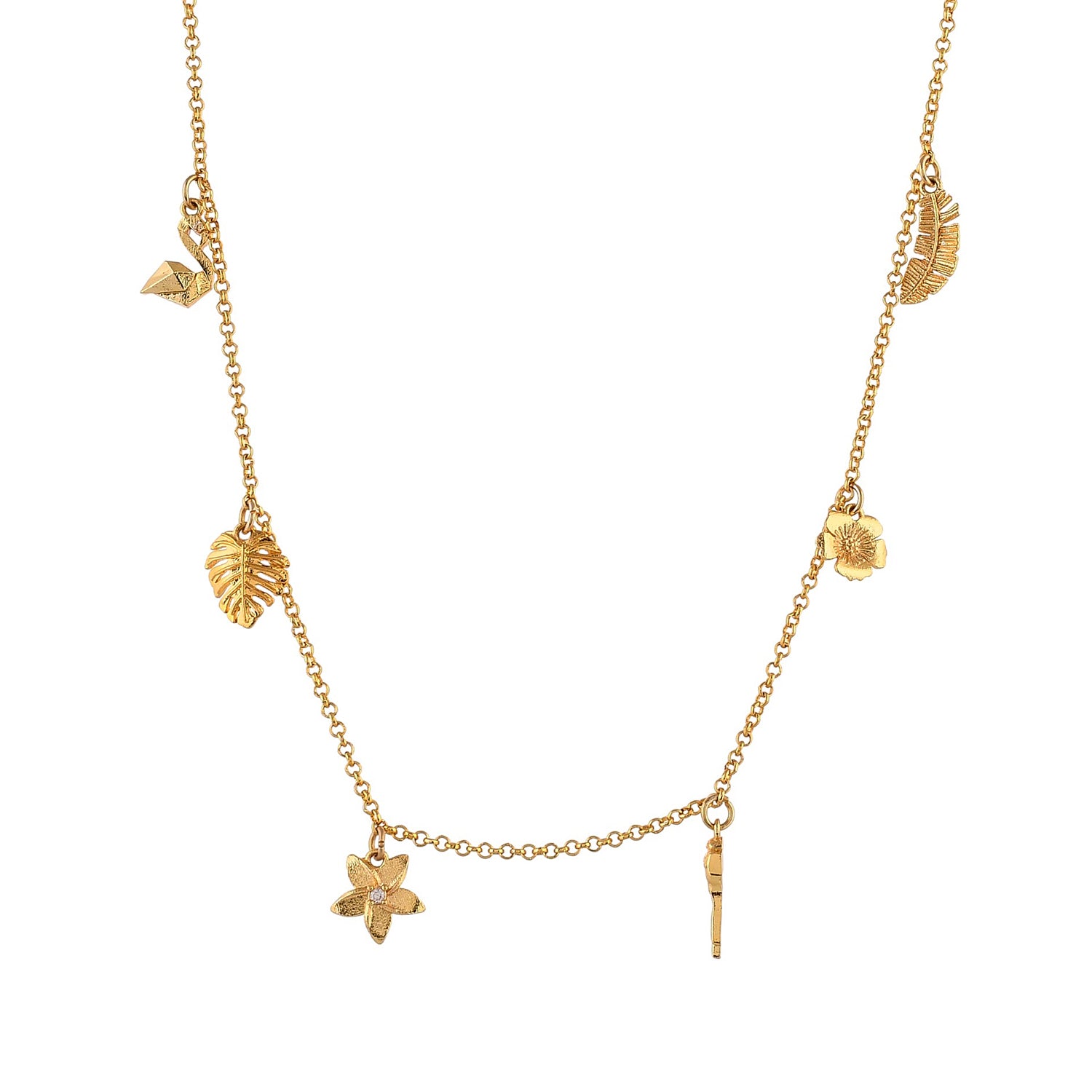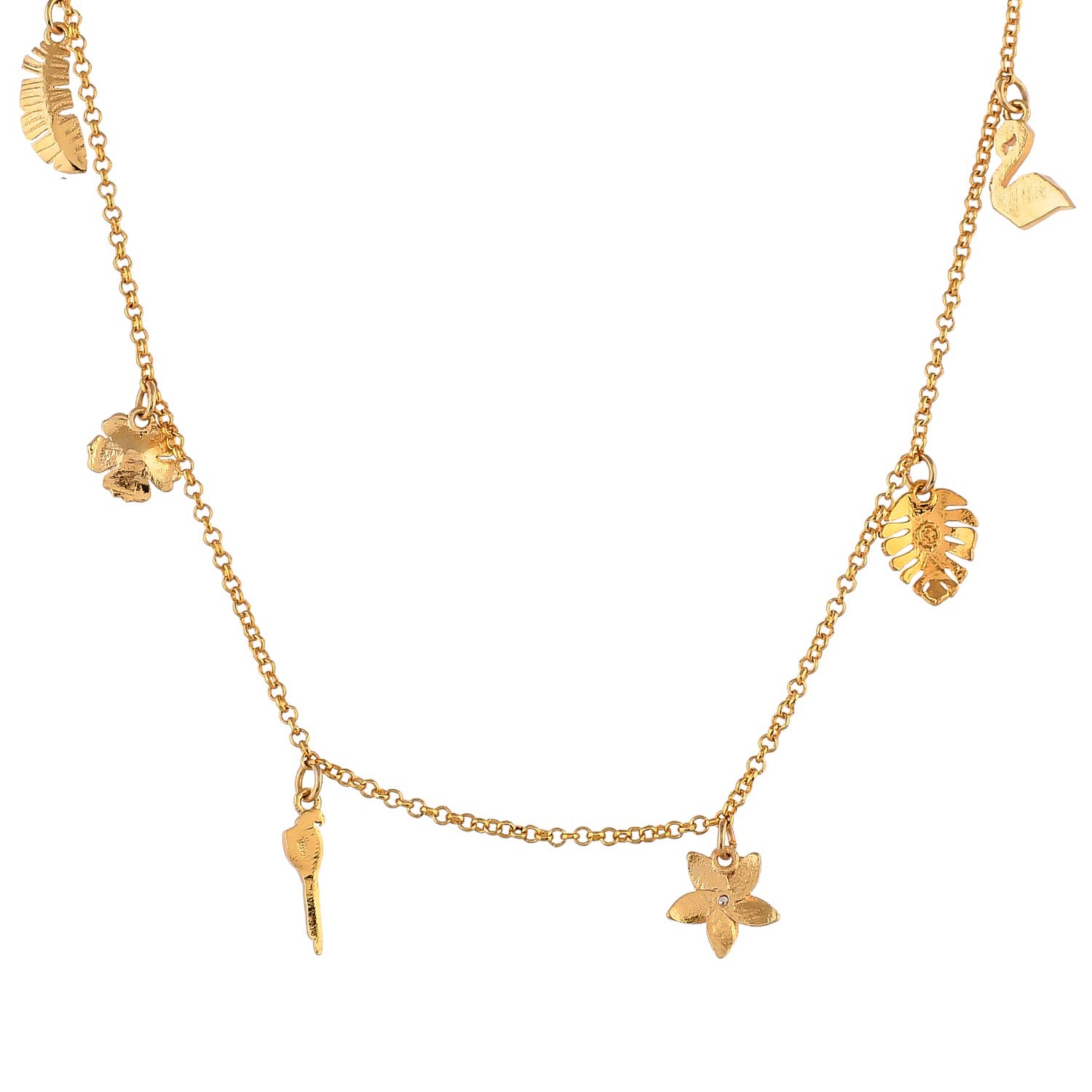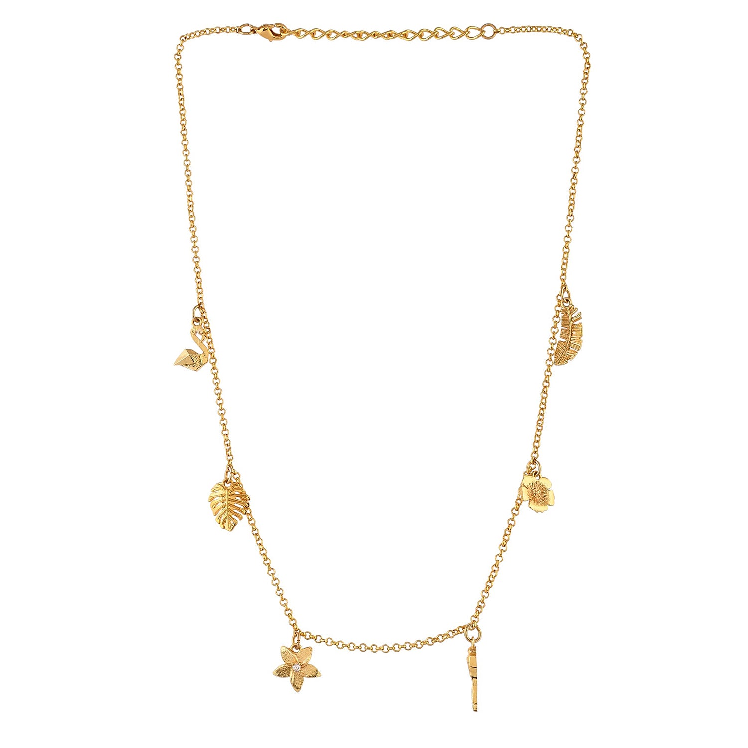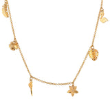 A gorgeous and dainty necklace, inspired by the tropics and beaches. Made from brass and lightly embellished, the necklace features numerous tropical charms. The gold plated necklace can be paired with just about everything, especially beachwear.