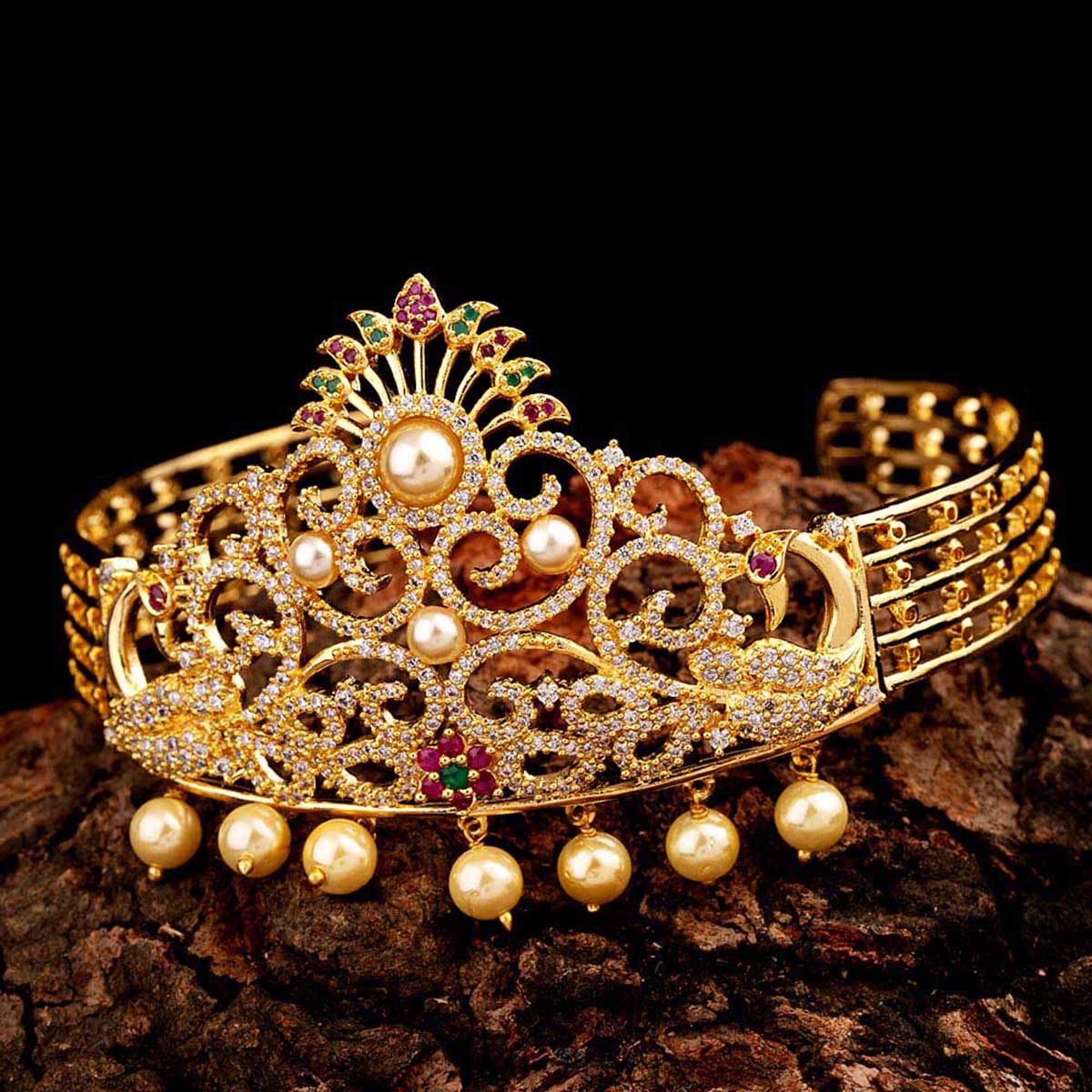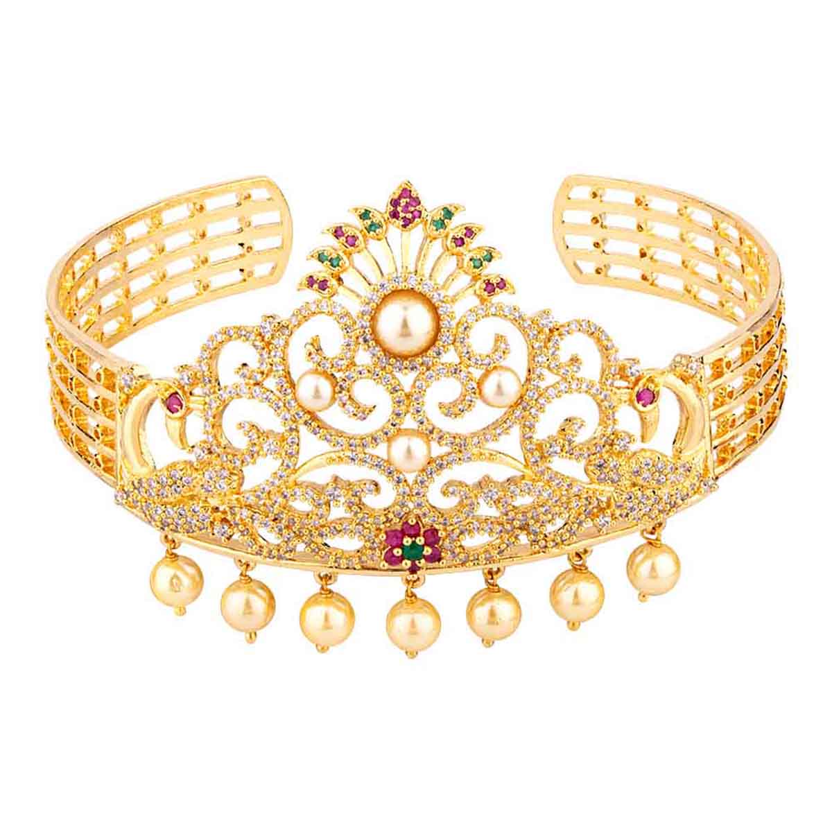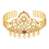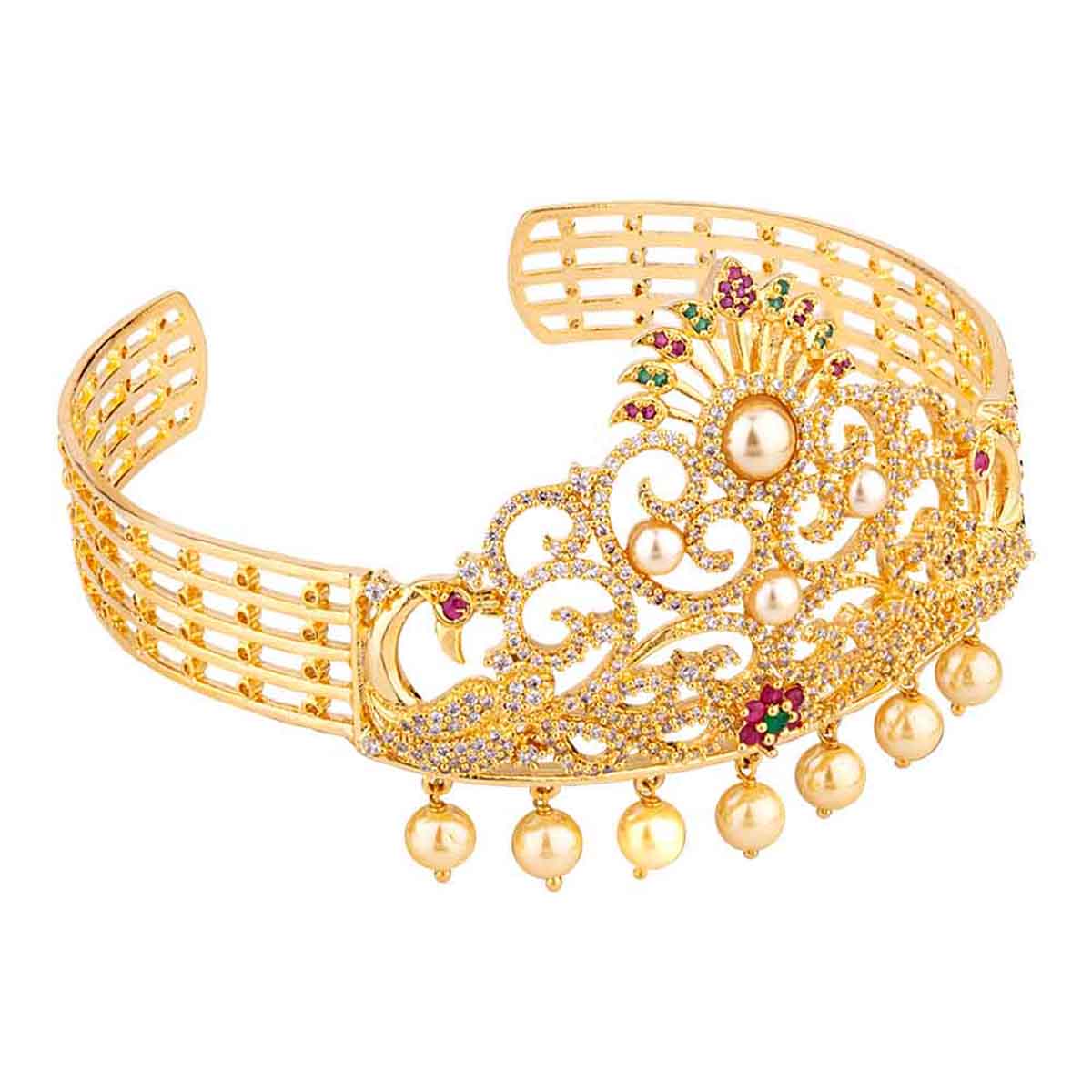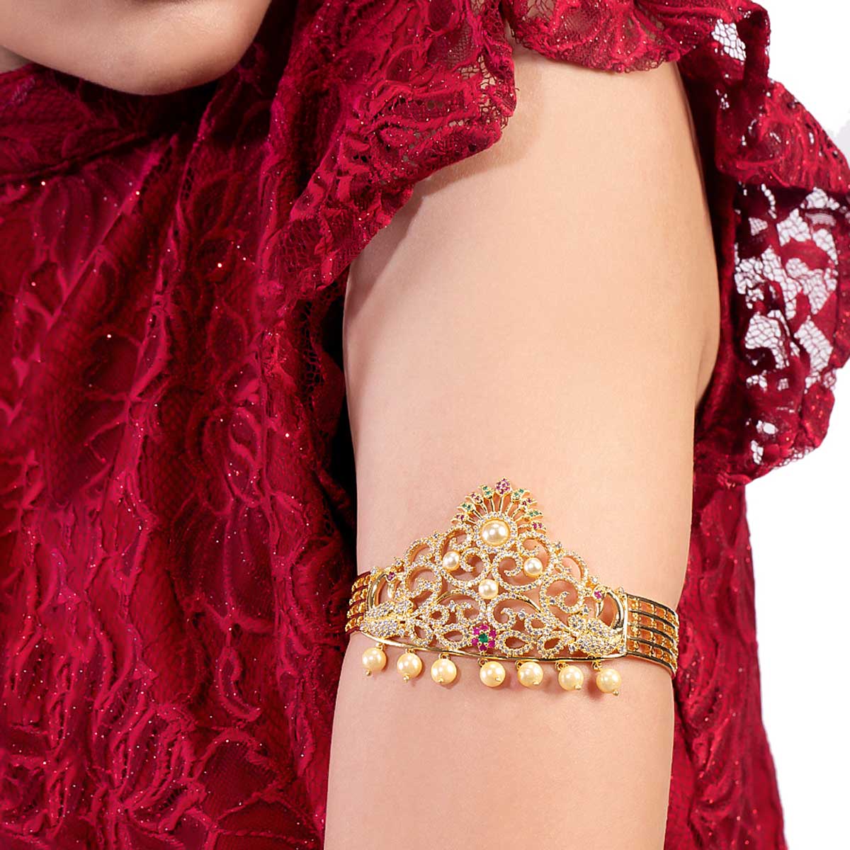 Yellow gold plated armlet, fashioned out of brass. Heavily embellished with faux pearls and American Diamond gems. Wear with a traditional silk saree.
