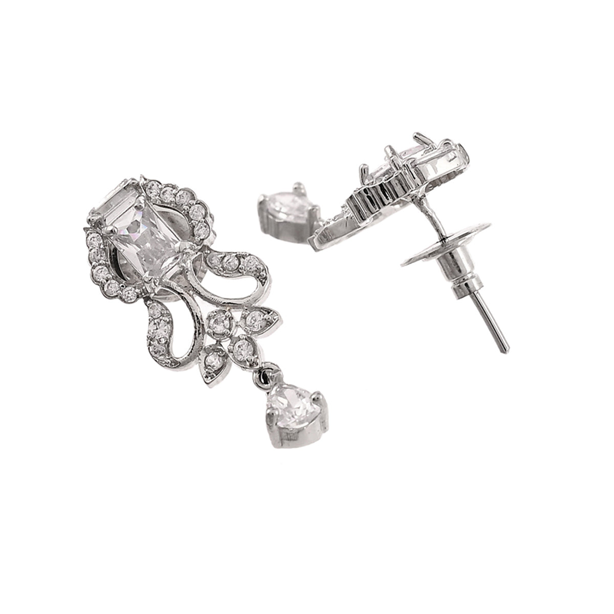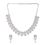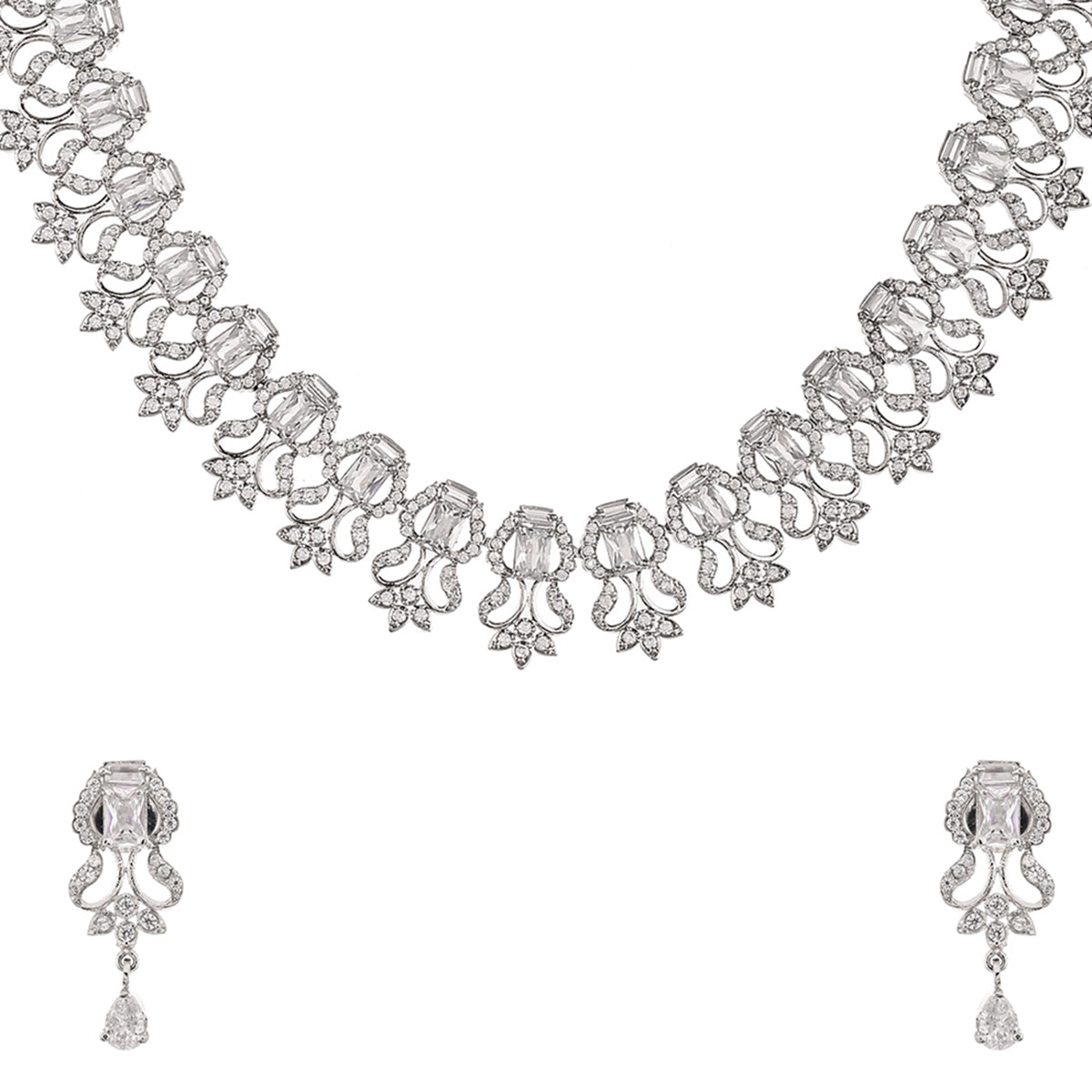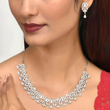 Heavily embellished with cubic zirconia gemstones in a classic cluster setting, this jewellery set has been fashioned out of brass. Silver plating adds to the charm of the necklace and drop earrings, which promise to be a comfortable wear at all times. Pair the set with a cocktail dress or formal evening gown.