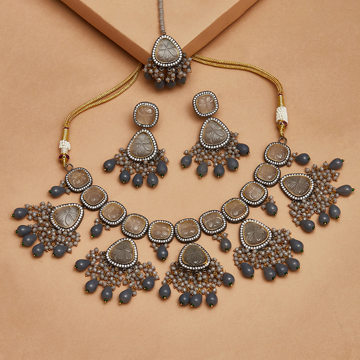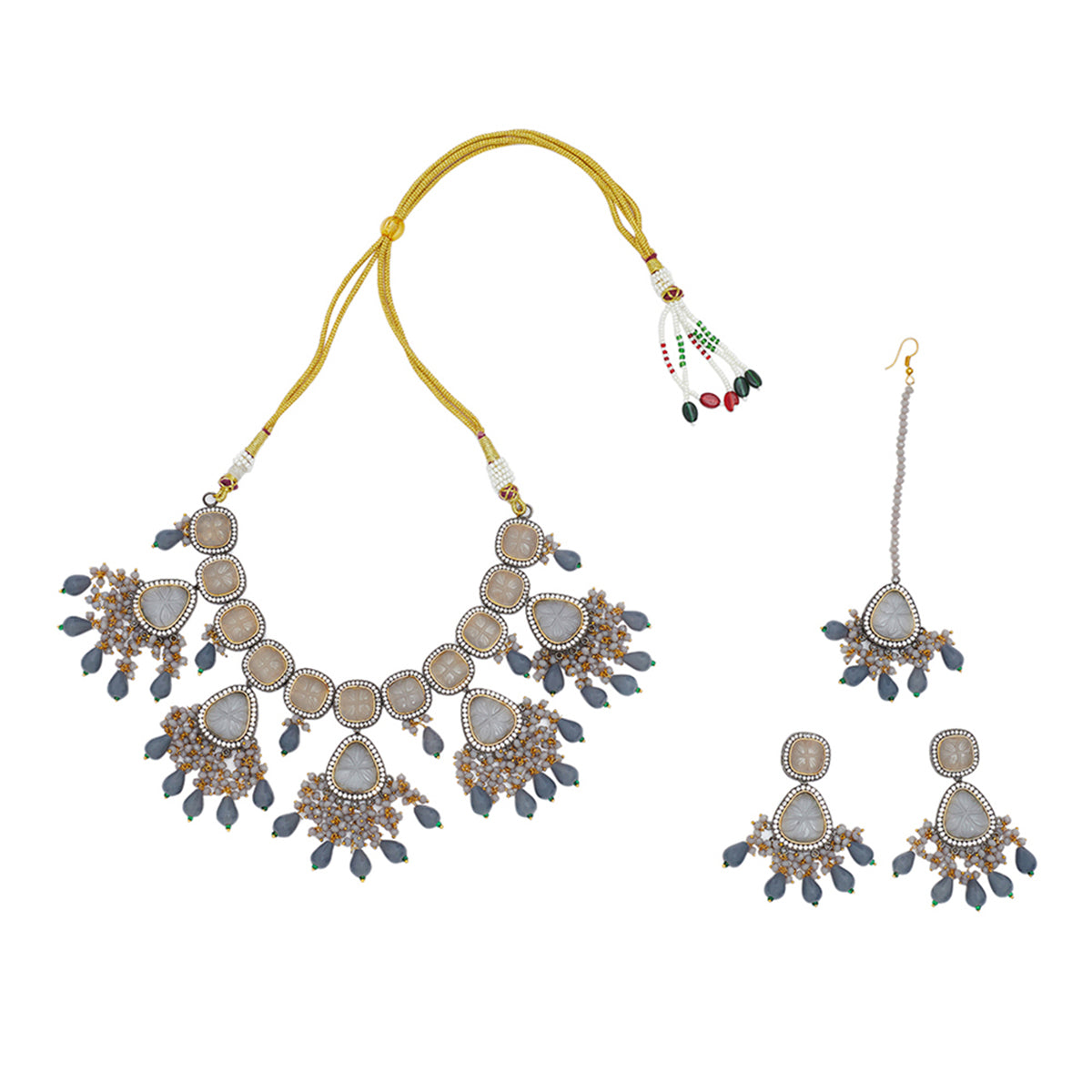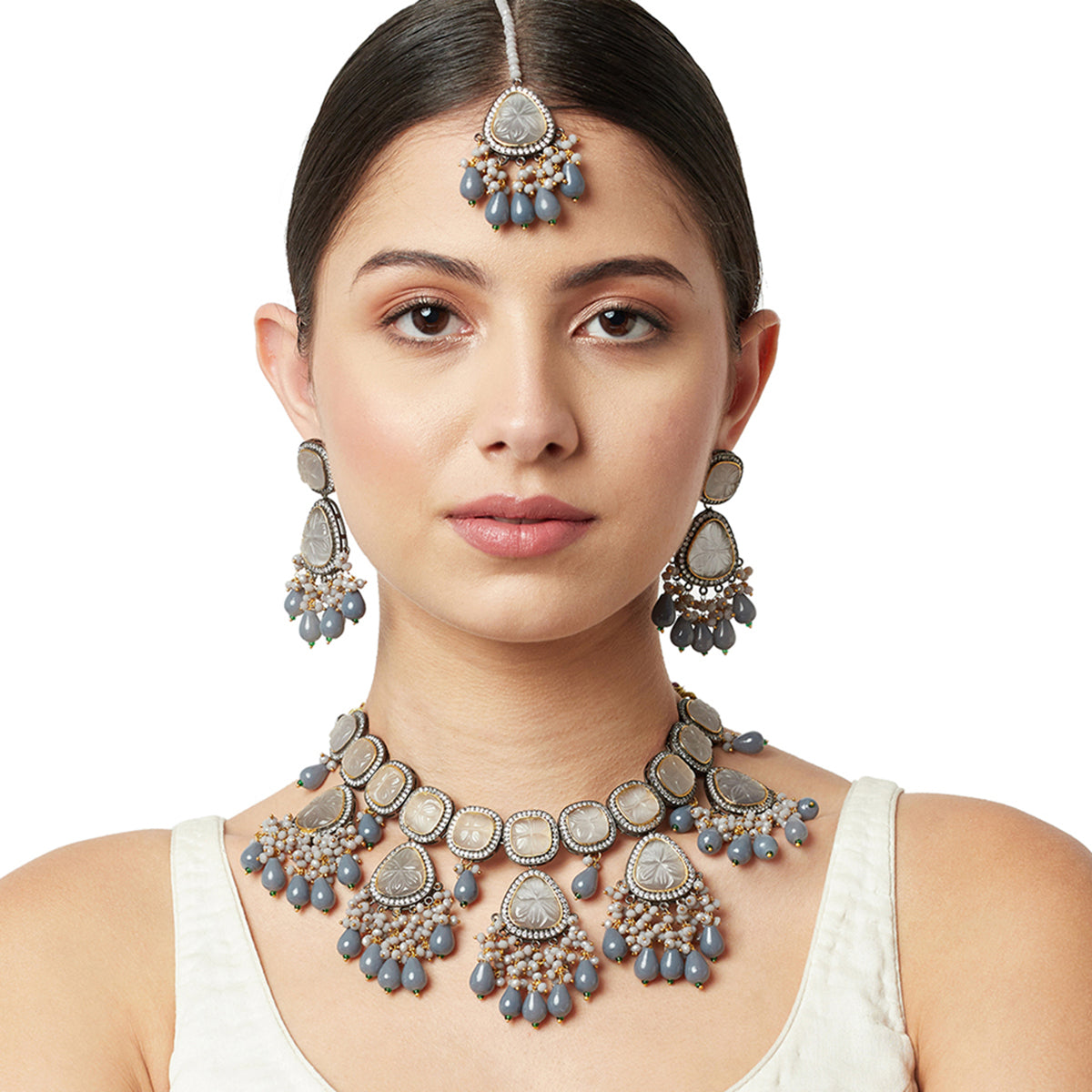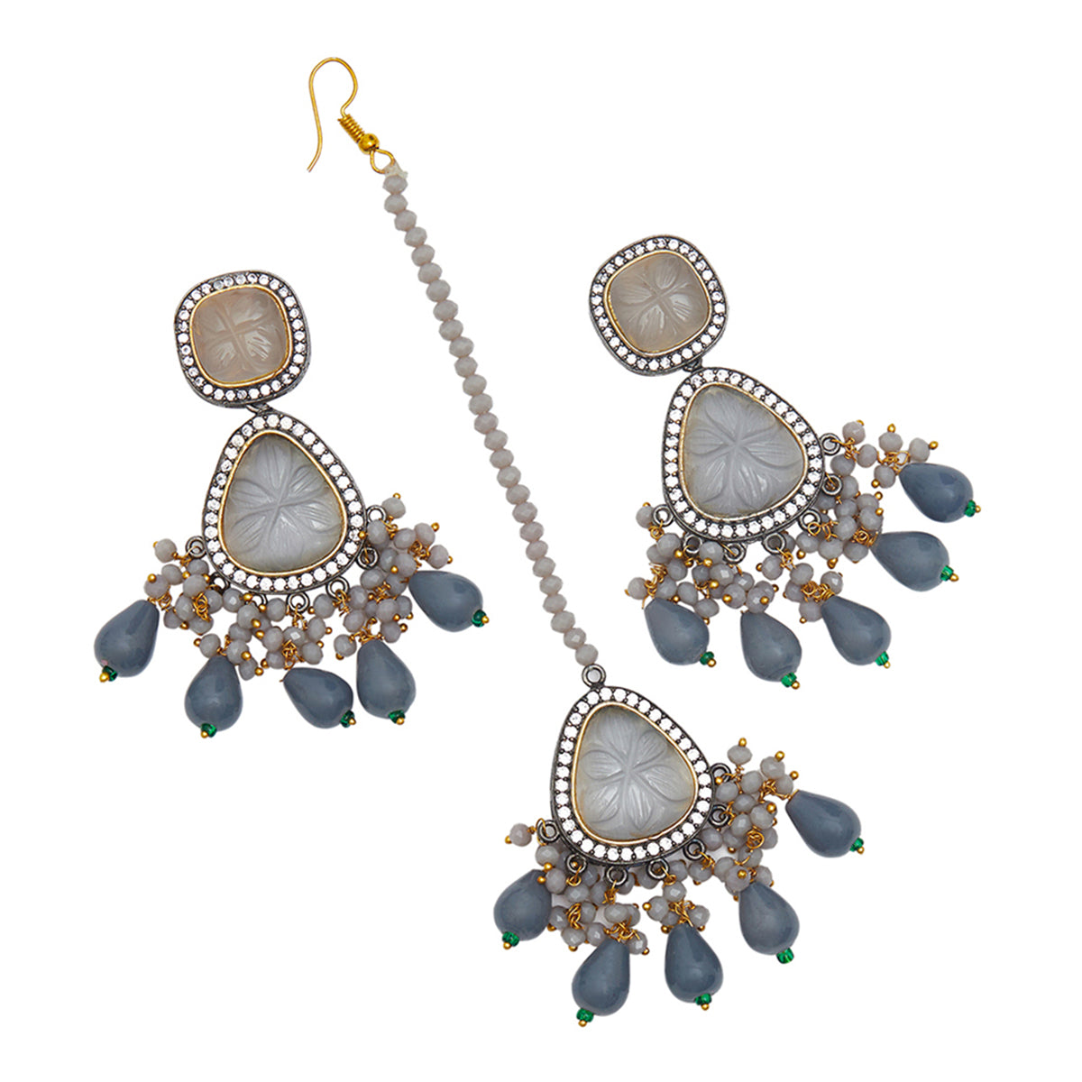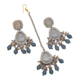 An ethnic style maang tika set, made from brass and two tone plated. The set has been heavily embellished with CZ gemstones in various cuts. Faux pearls and kundan add to the allure of this royal set, which will look splendid when paired with a traditional saree or lehenga outfit.