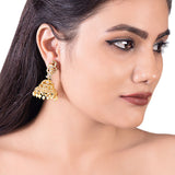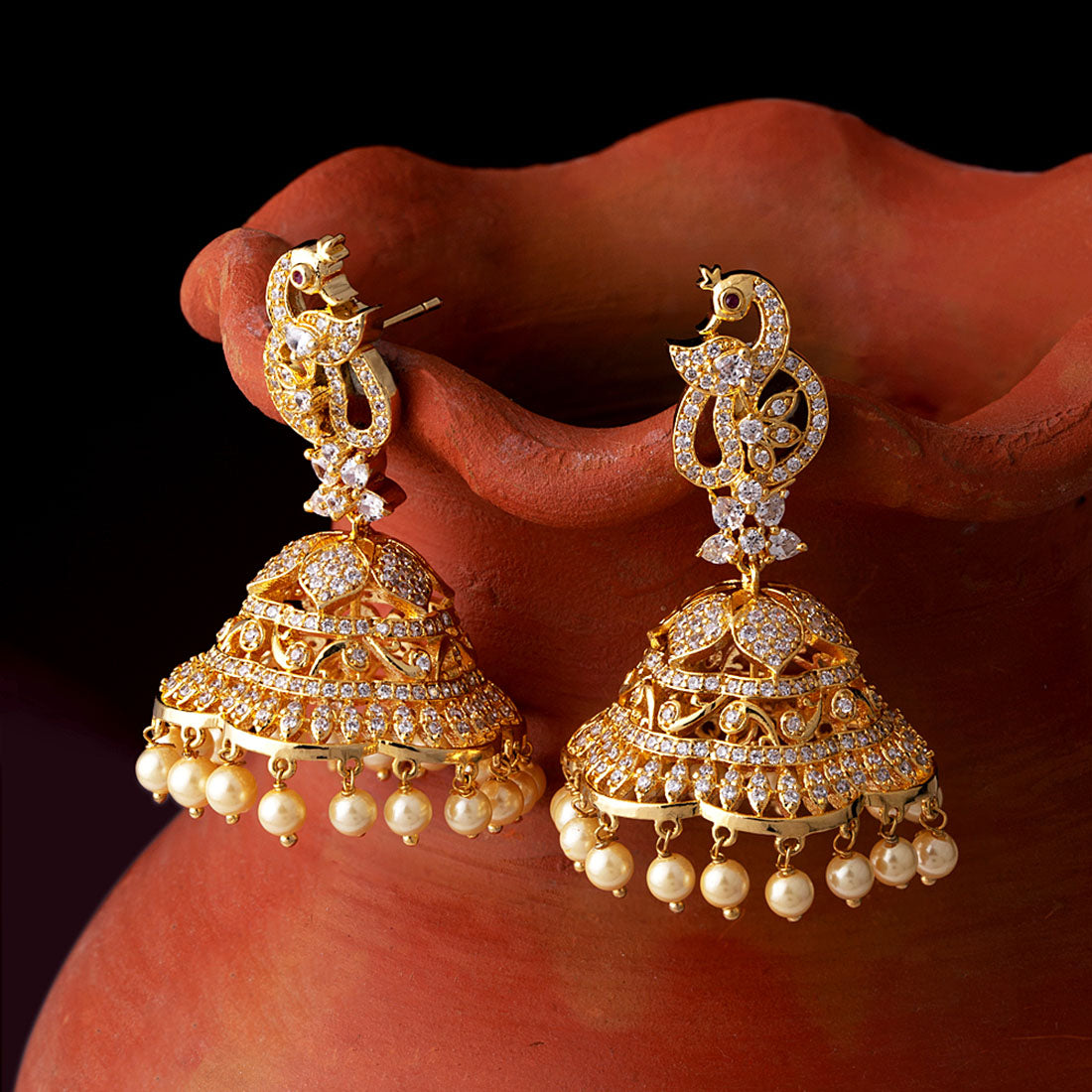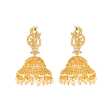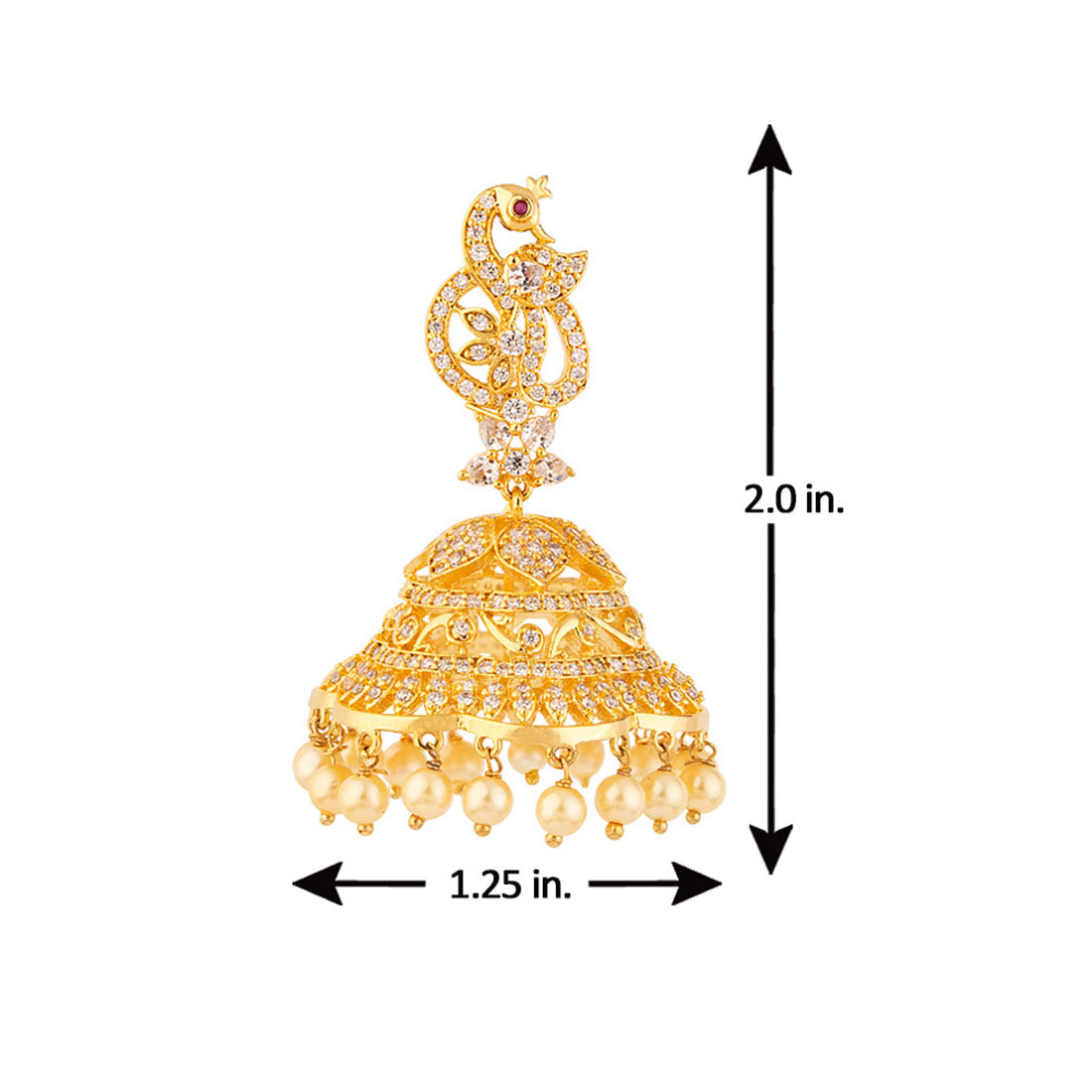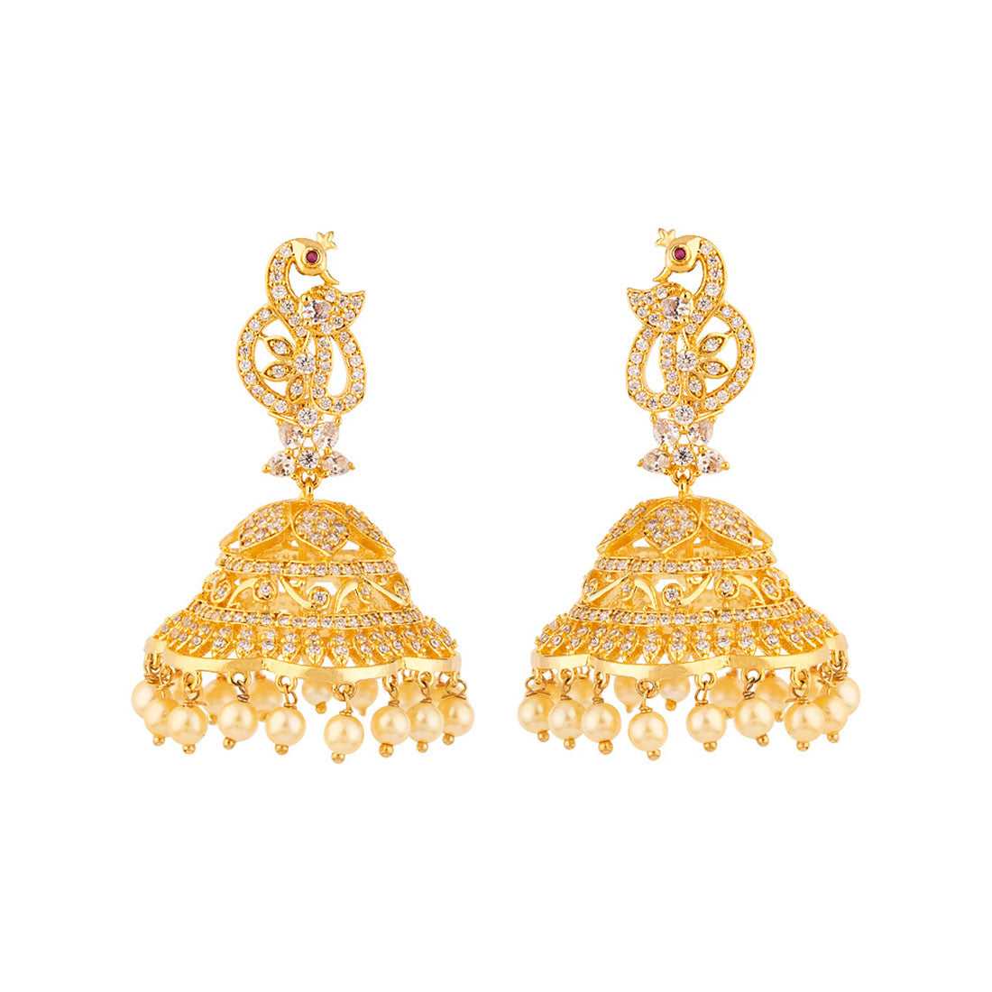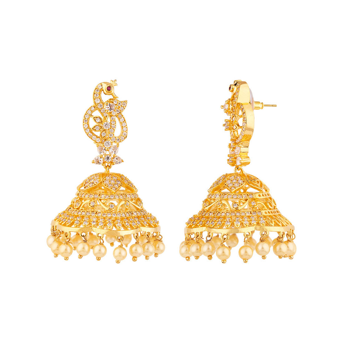 Brass jhumka earrings with yellow gold plating. Embellished with American Diamond gems and faux pearls. Pair with ethnic attire.