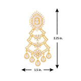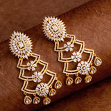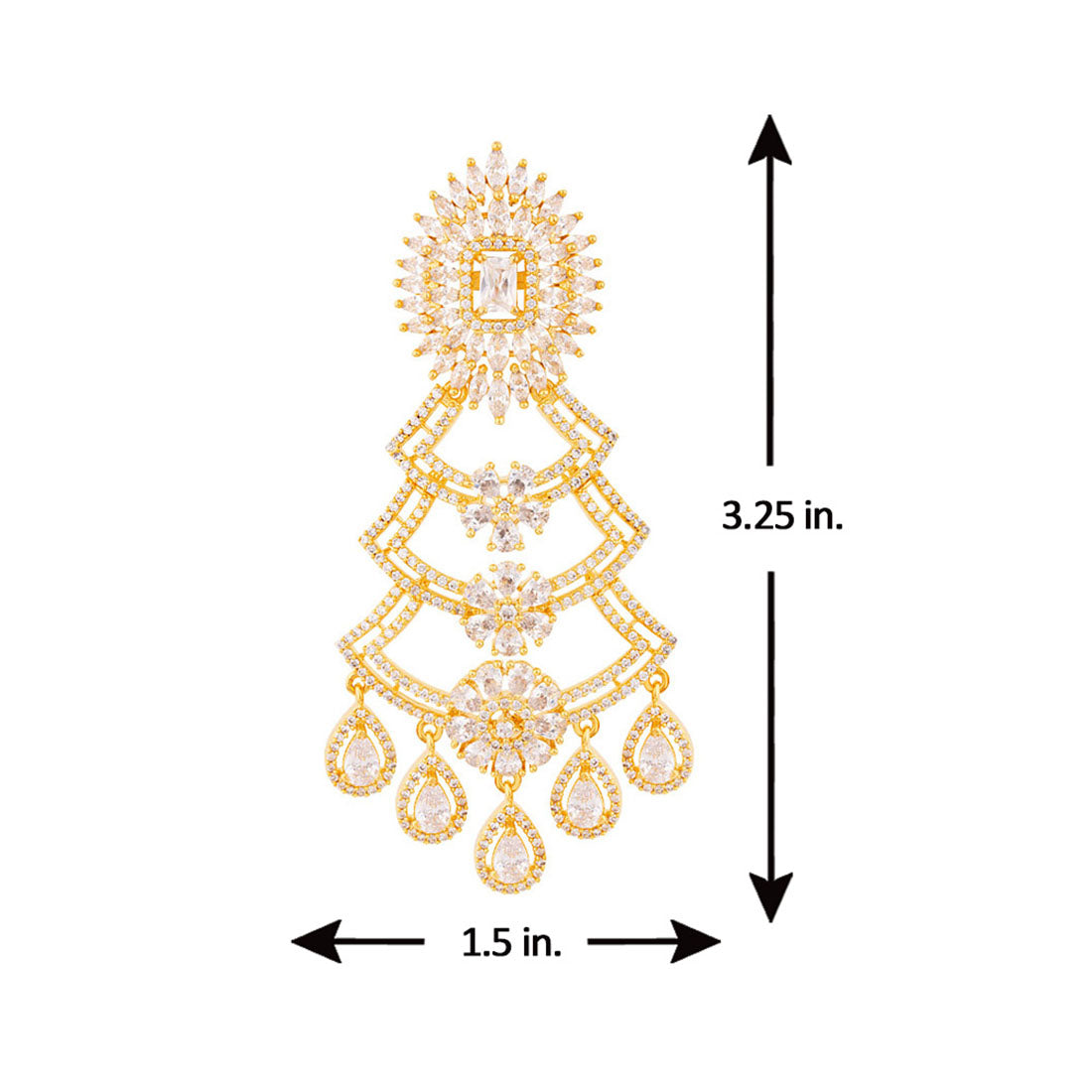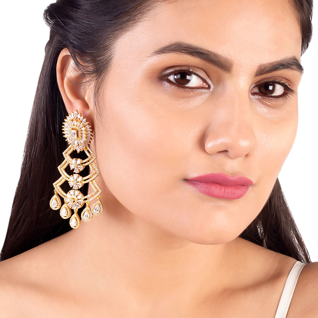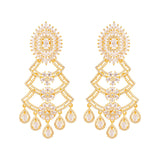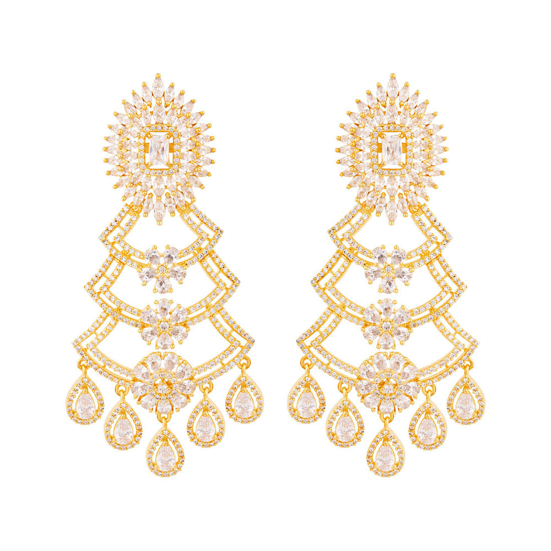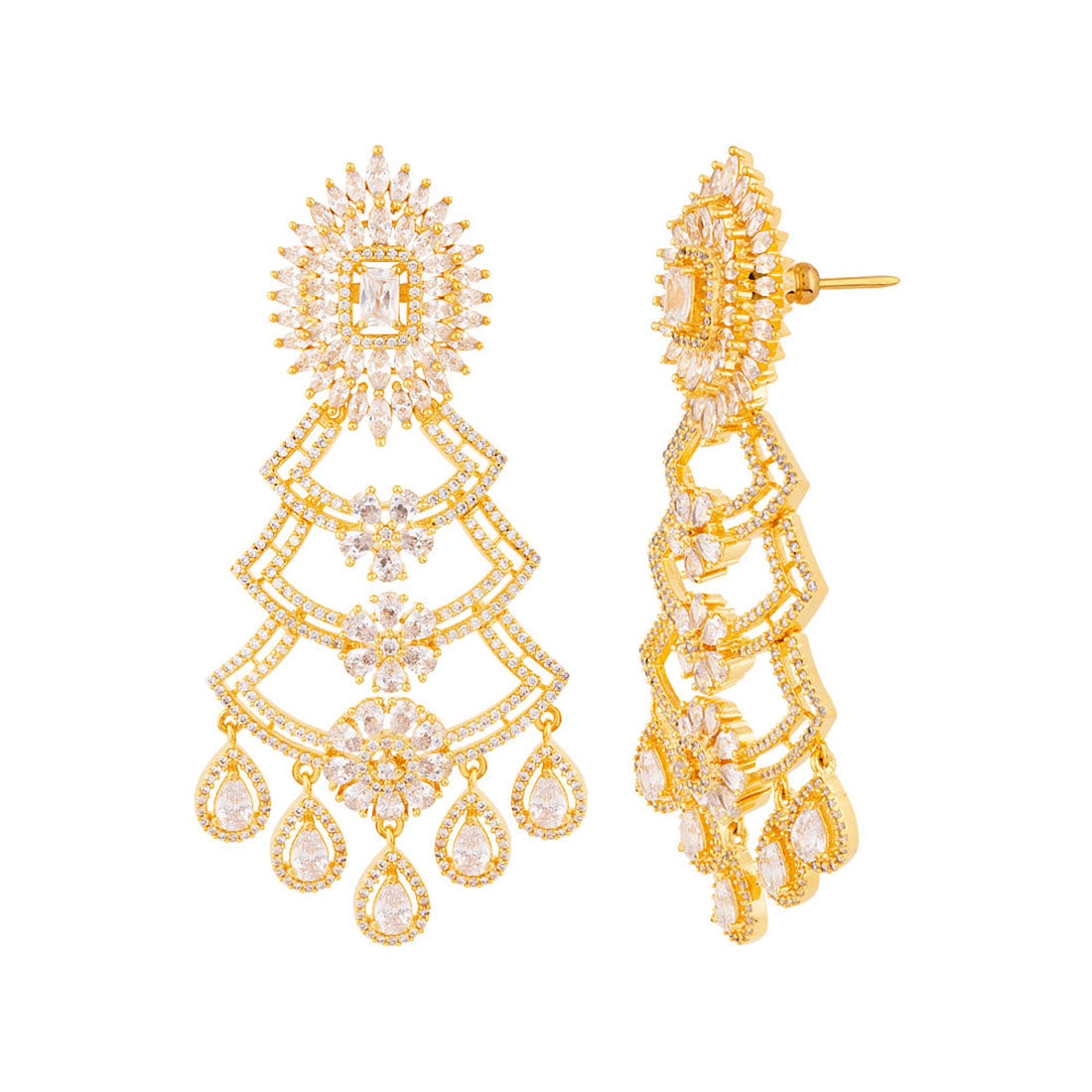 Layered drop earrings made from brass and yellow gold plated. American Diamond gems embellished and a good match for formal Indian looks.