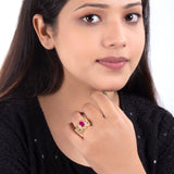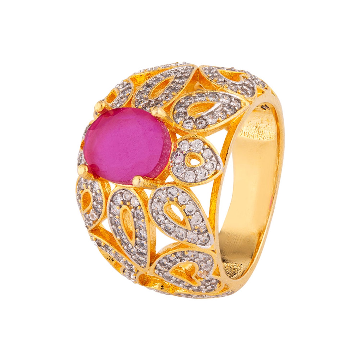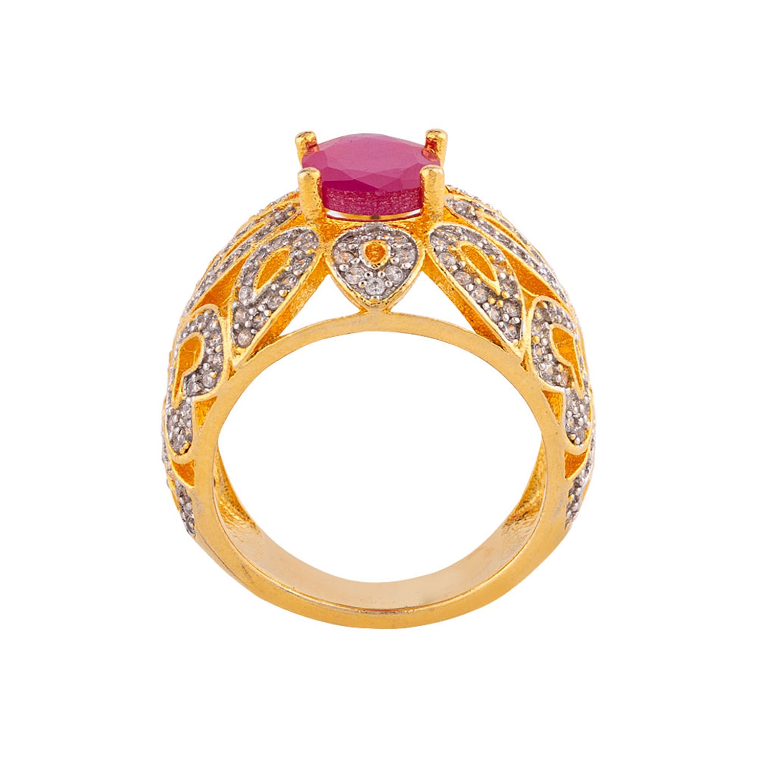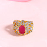 Cocktail ring made from brass and heavily embellished with zircon gemstones. Two tone plated. Good for formal looks.