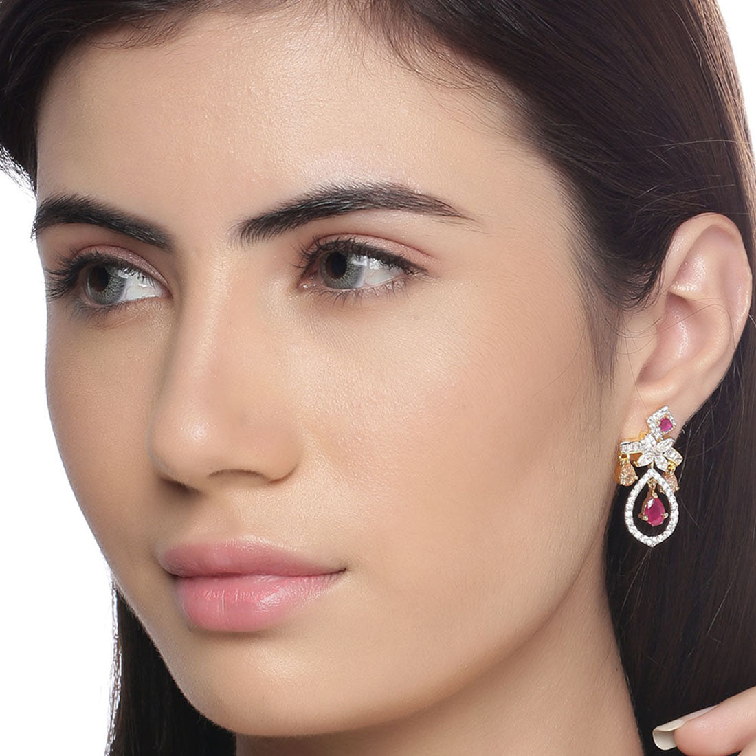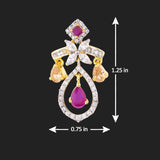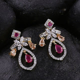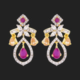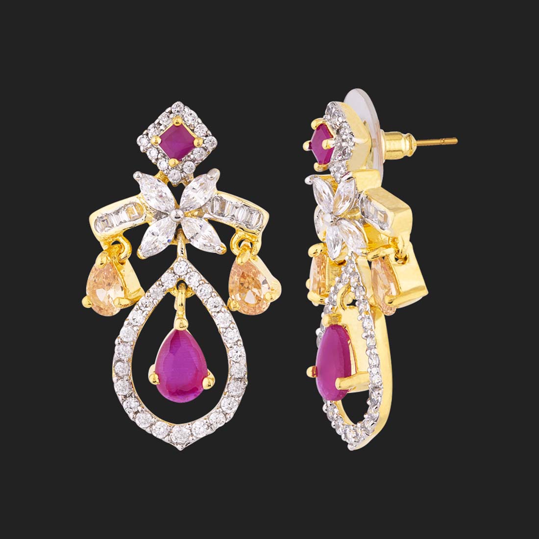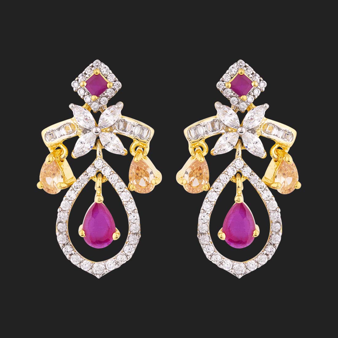 Cocktail drop earrings, inspired by heritage jewelry of royals. Made from brass, the two tone plated earrings have been embellished with well-cut cubic zirconia gems. Wear with formal attire.
