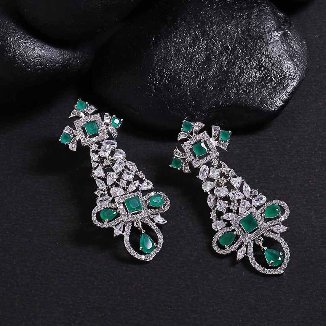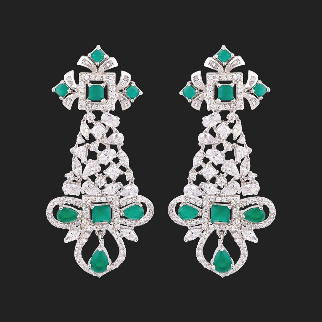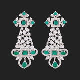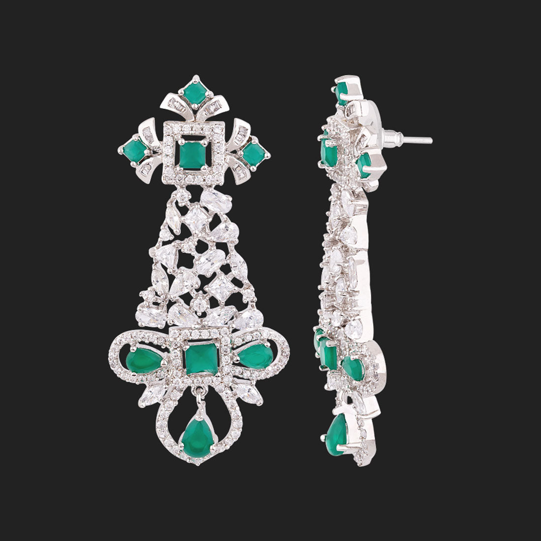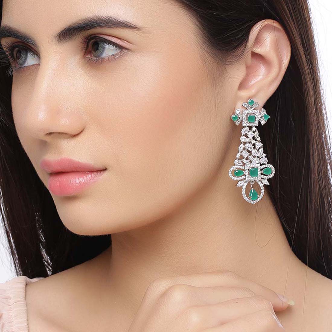 Green and white zircons embellished drop earrings inspired by the antique jewelry of royals. Made from brass and silver plated. Wear with a cocktail gown.