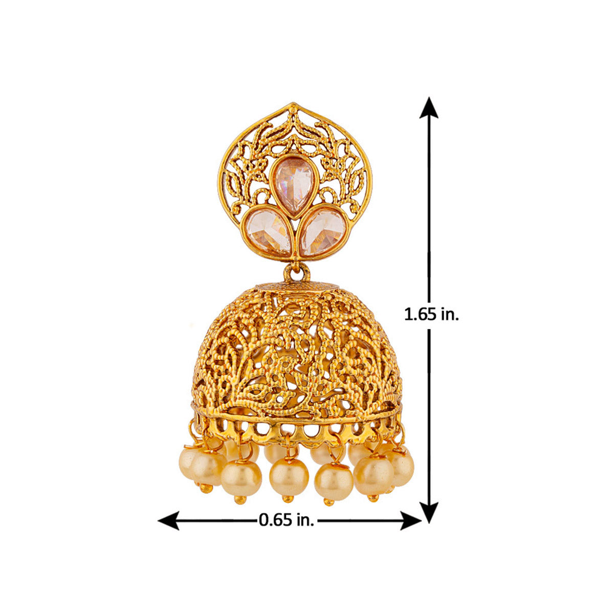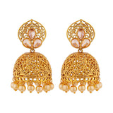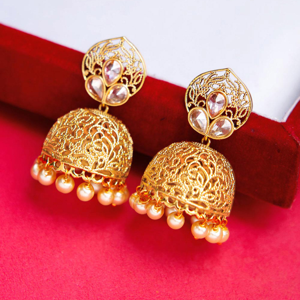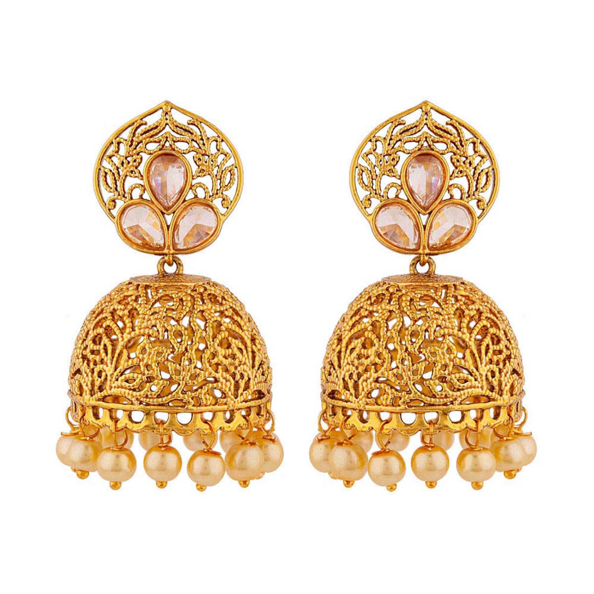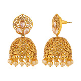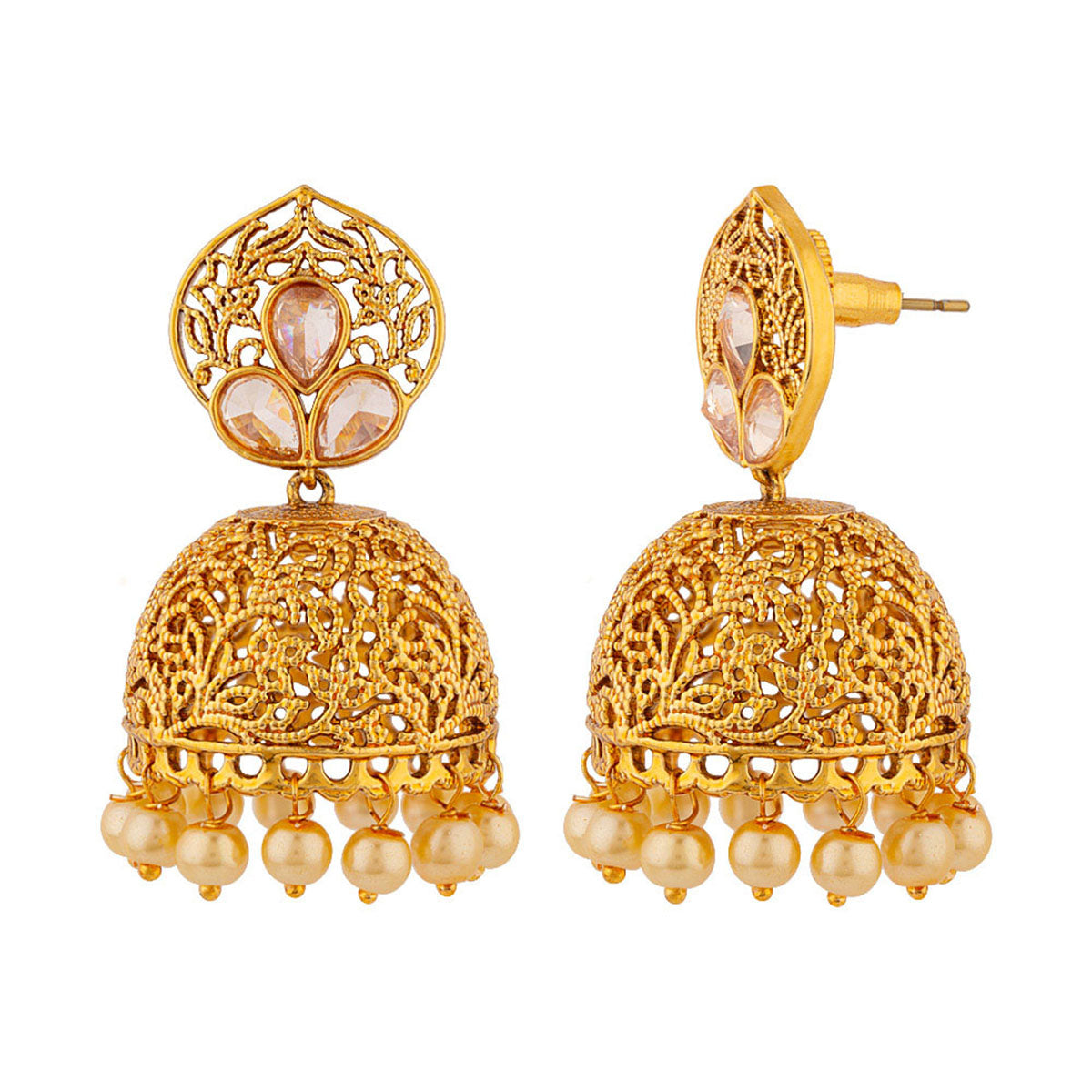 Classic dome shaped jhumkis with pearl and kundan detailing. Crafted with premium brass for a vintage look.