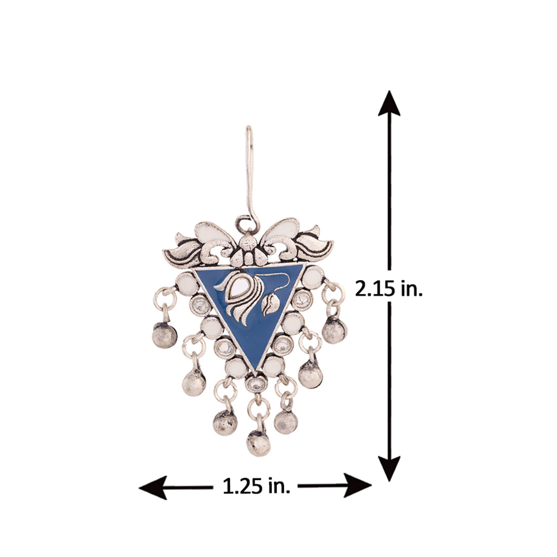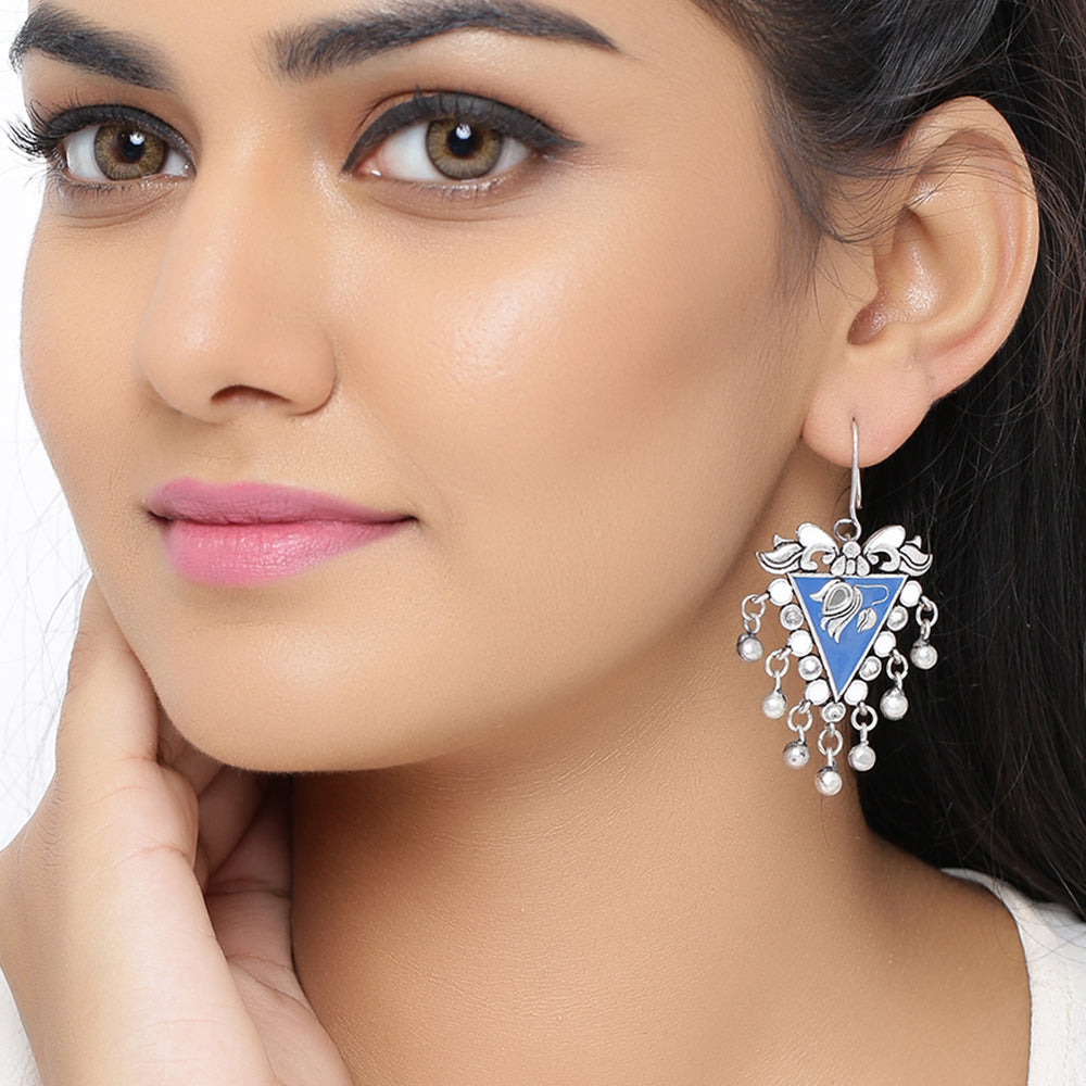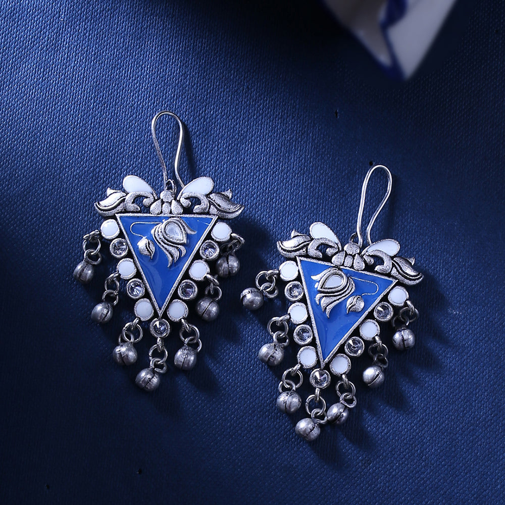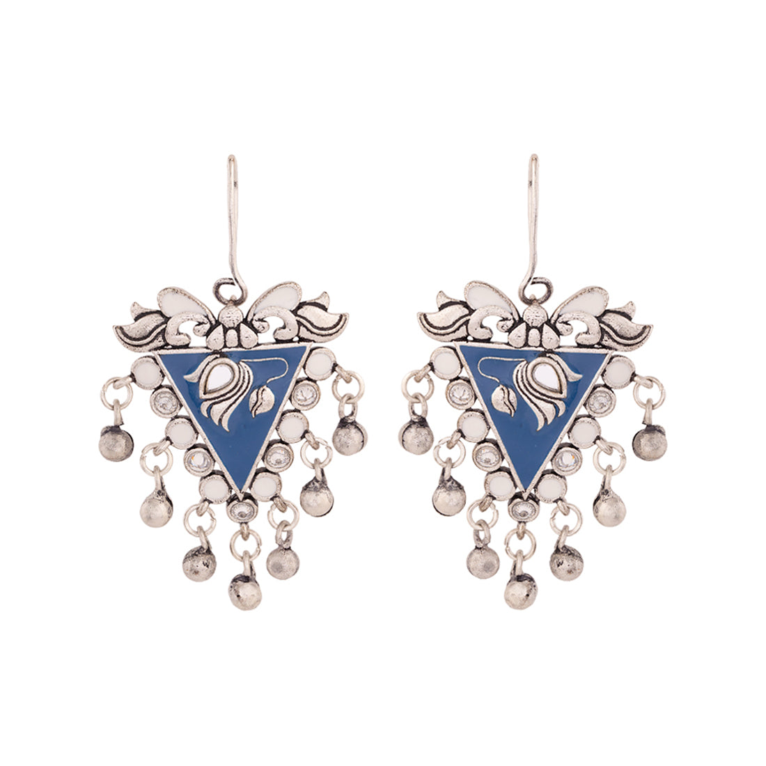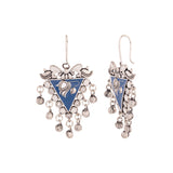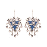 Enameled triangle earrings with oxidised silver plating. Made from brass and lightly embellished. Pair with a summer dress.