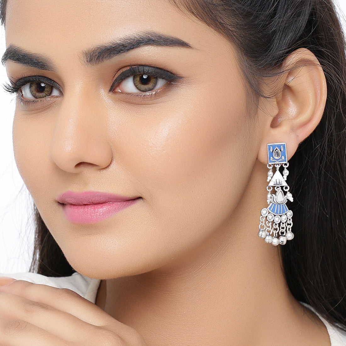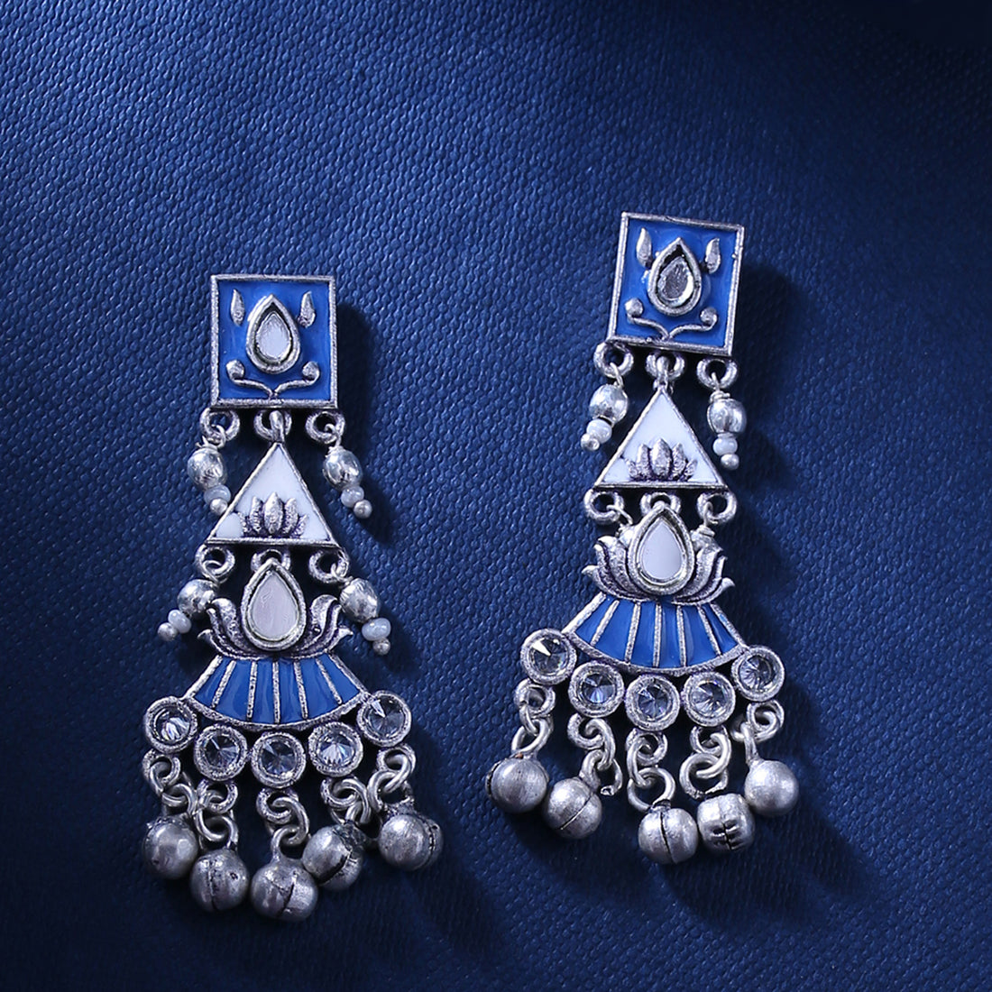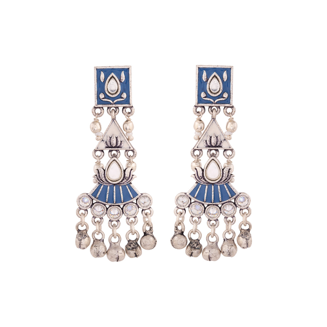 Ethnic inspired brass earrings with oxidised silver plating. Enameled, lightweight and very versatile. This piece of jewelry comes with the Voylla assurance of quality and durability.
