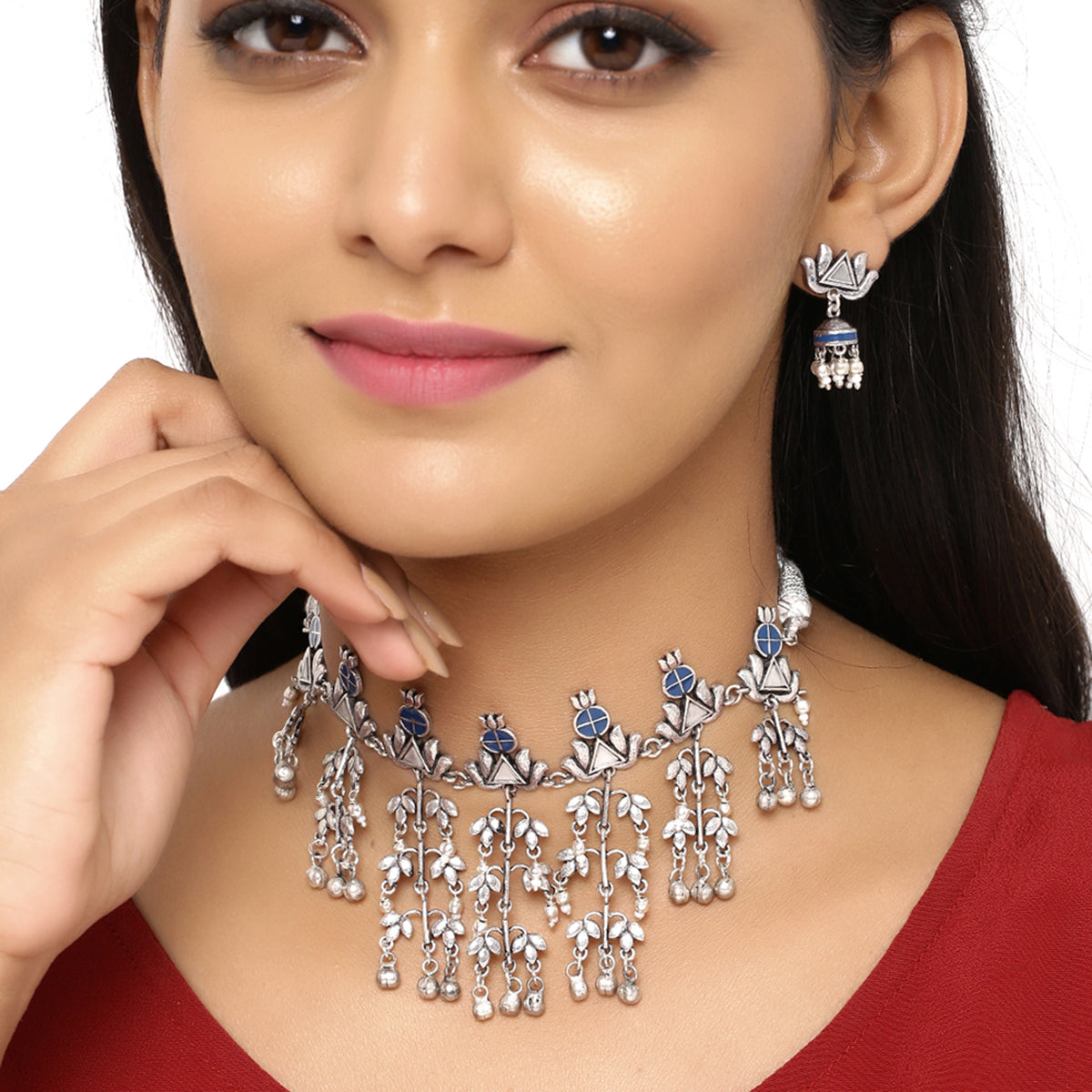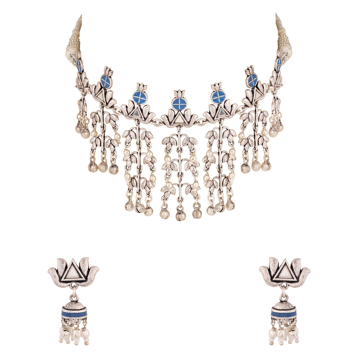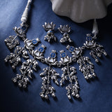 Filigree floral necklace set with oxidised silver plating. Made from brass and enameled. Pair with a trendy saree. This piece of jewelry comes with the Voylla assurance of quality and durability. Caring for your fashion jewelry: We, at Voylla, take care of every piece of jewelry so that you don't spend hours caring for them.