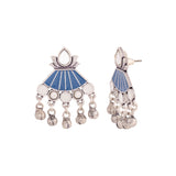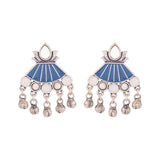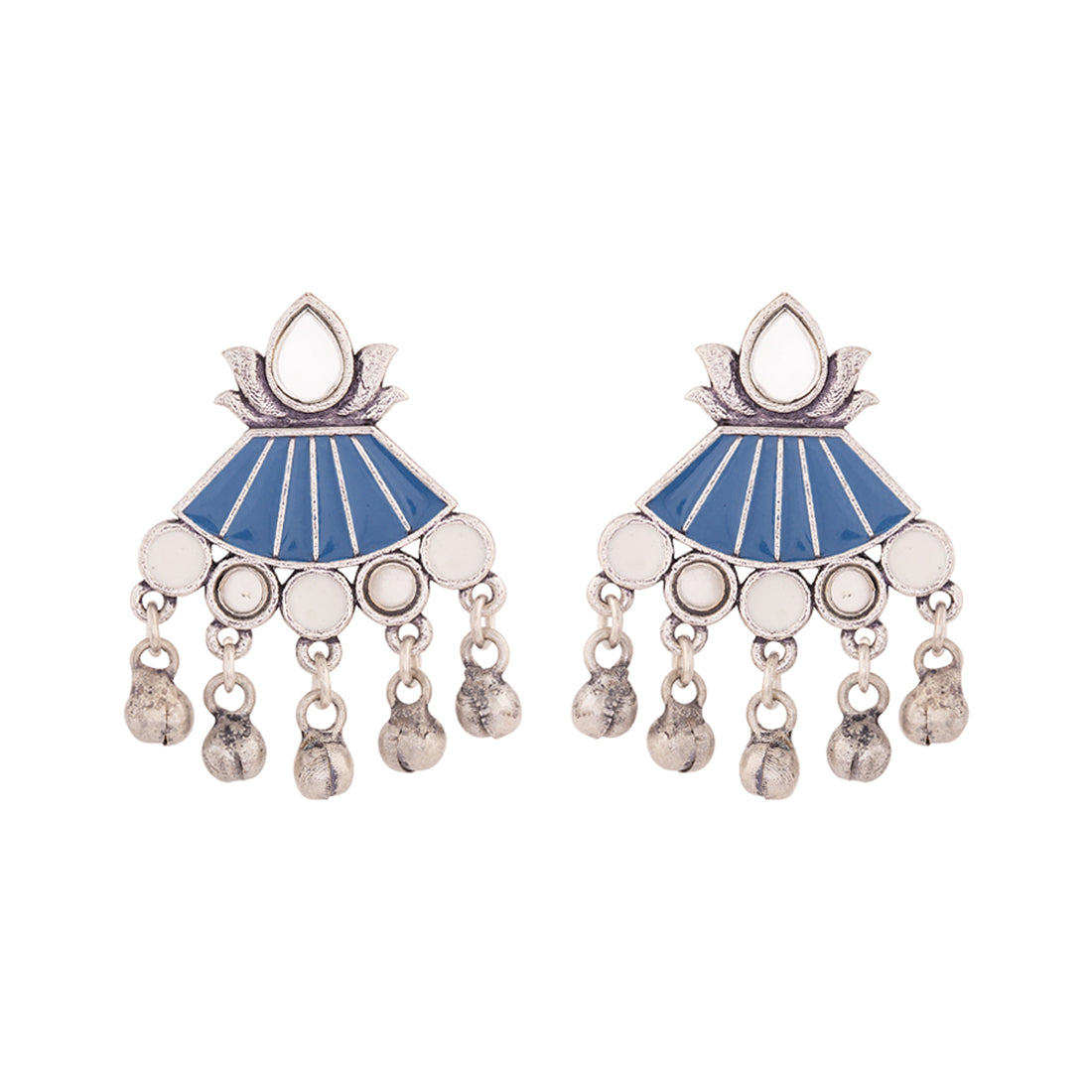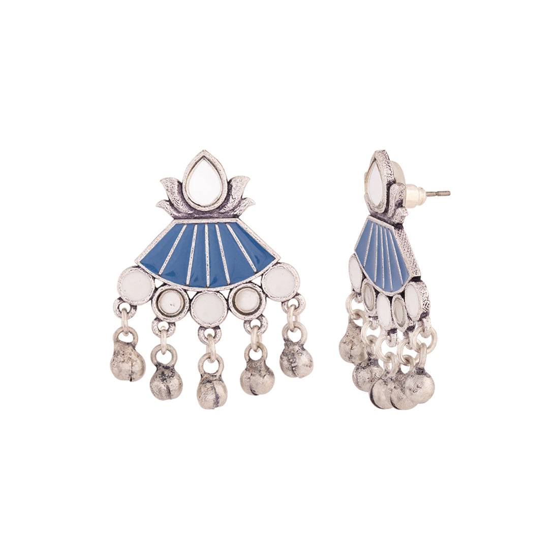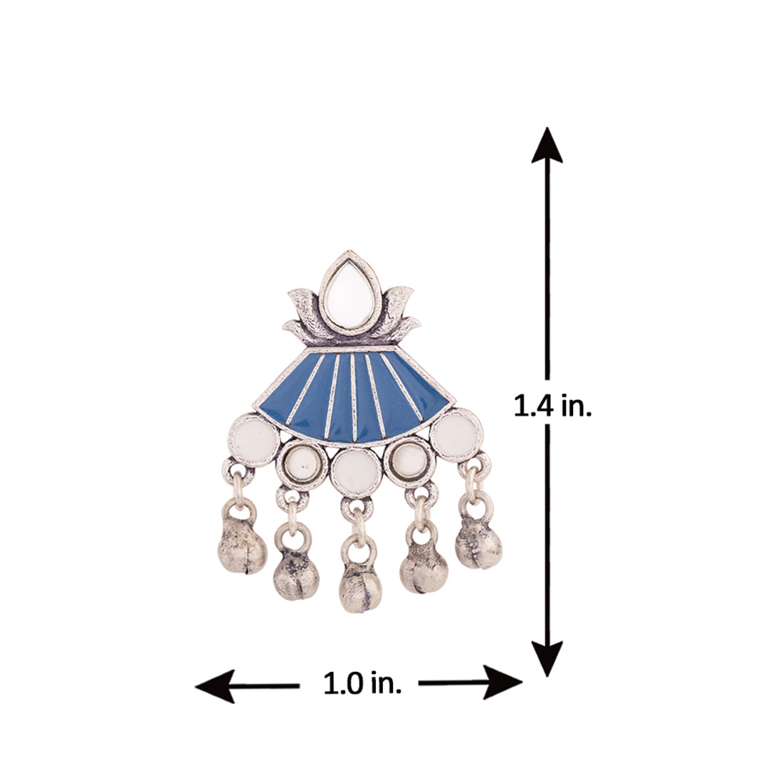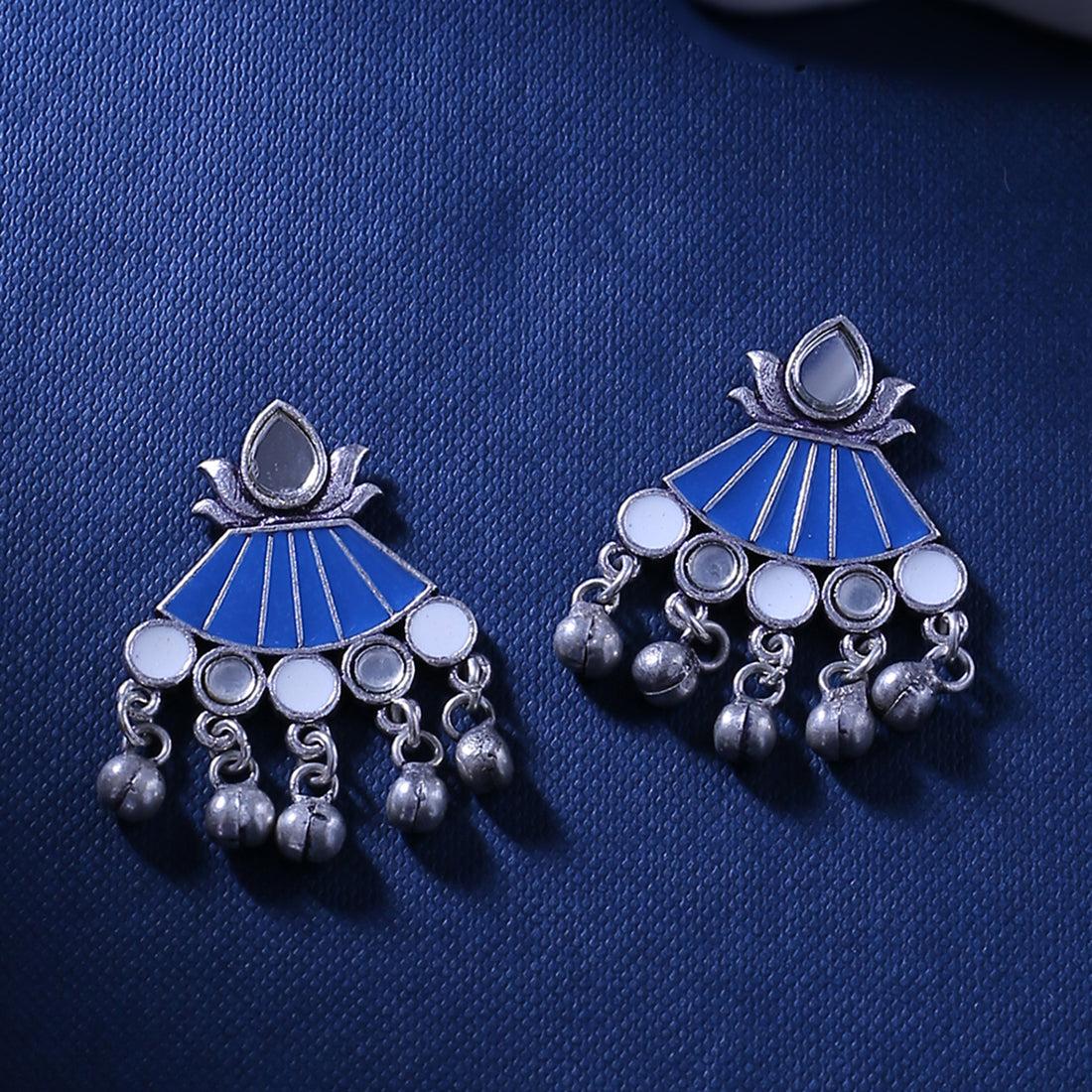 Lightly embellished small drop earrings made from brass. Oxidised silver plated and enameled. A good match for ethnic looks.