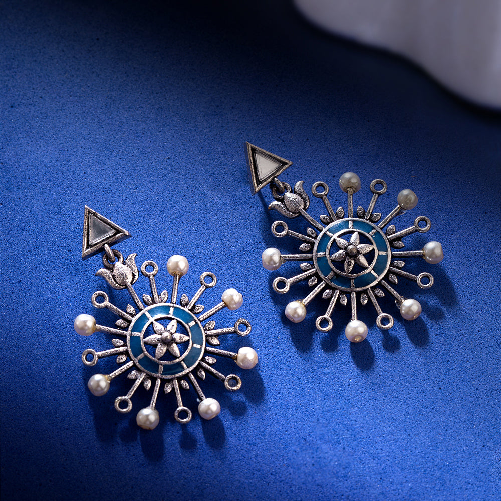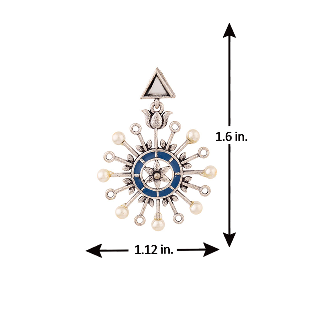Pin wheel motif earrings fashioned out of brass. Oxidised silver plated, enameled and light embellished with faux pearls. Good for casual looks.
