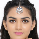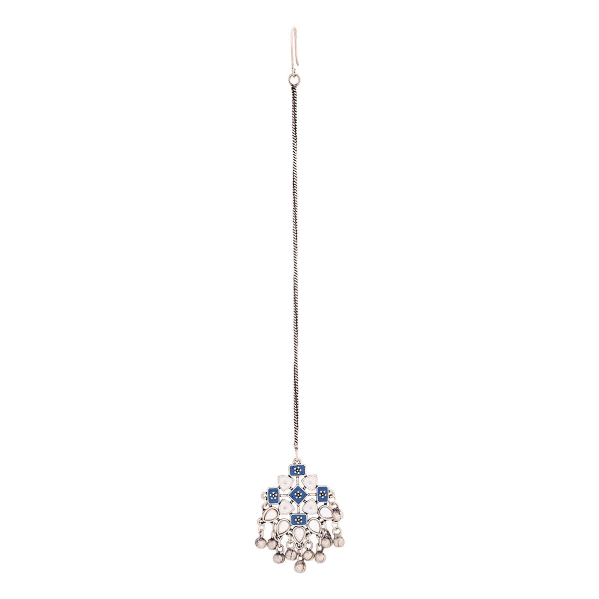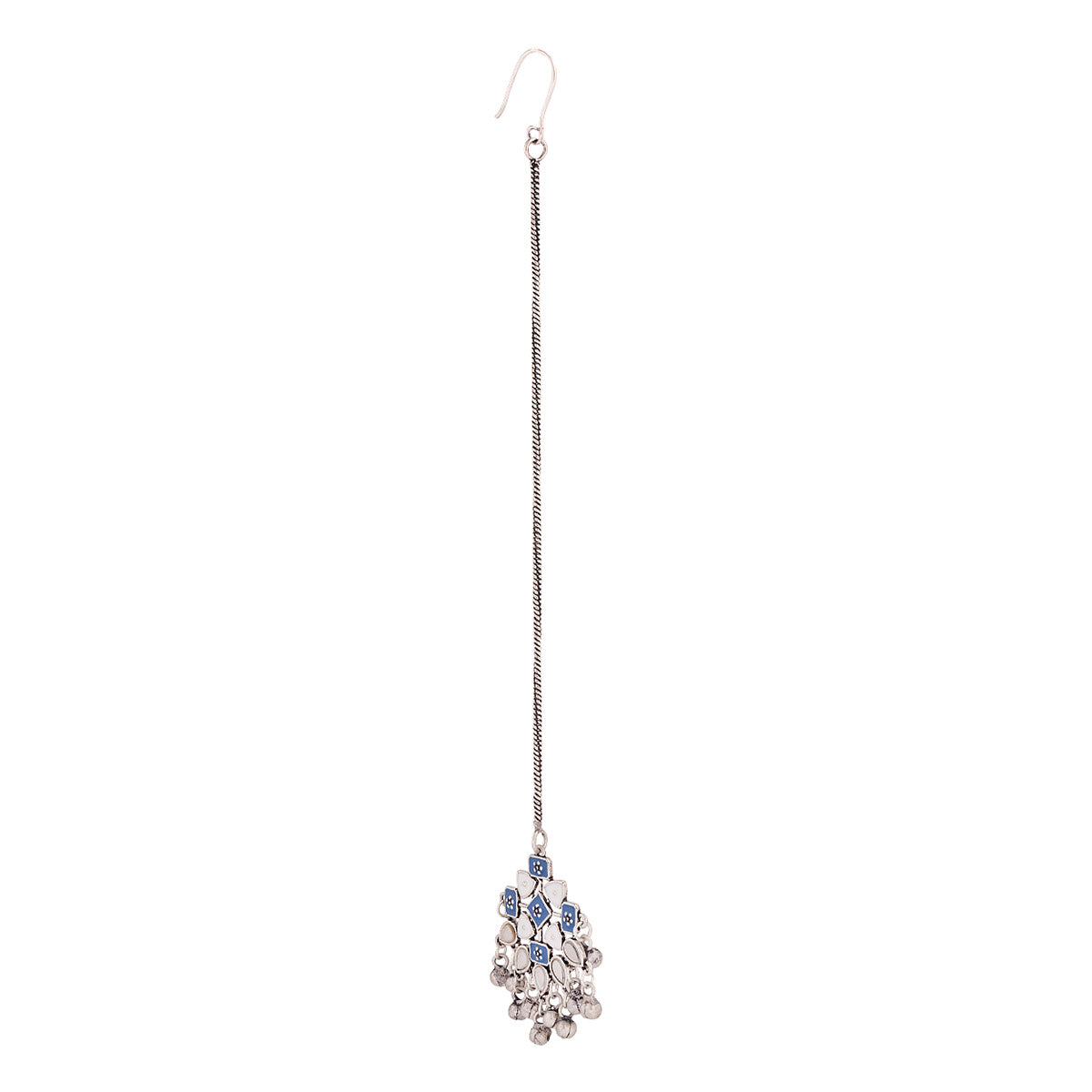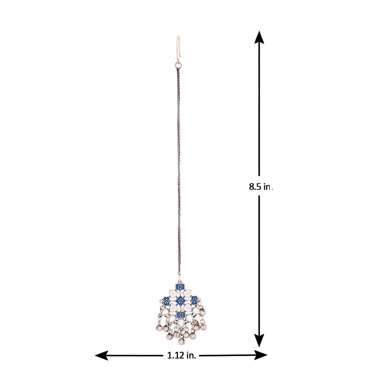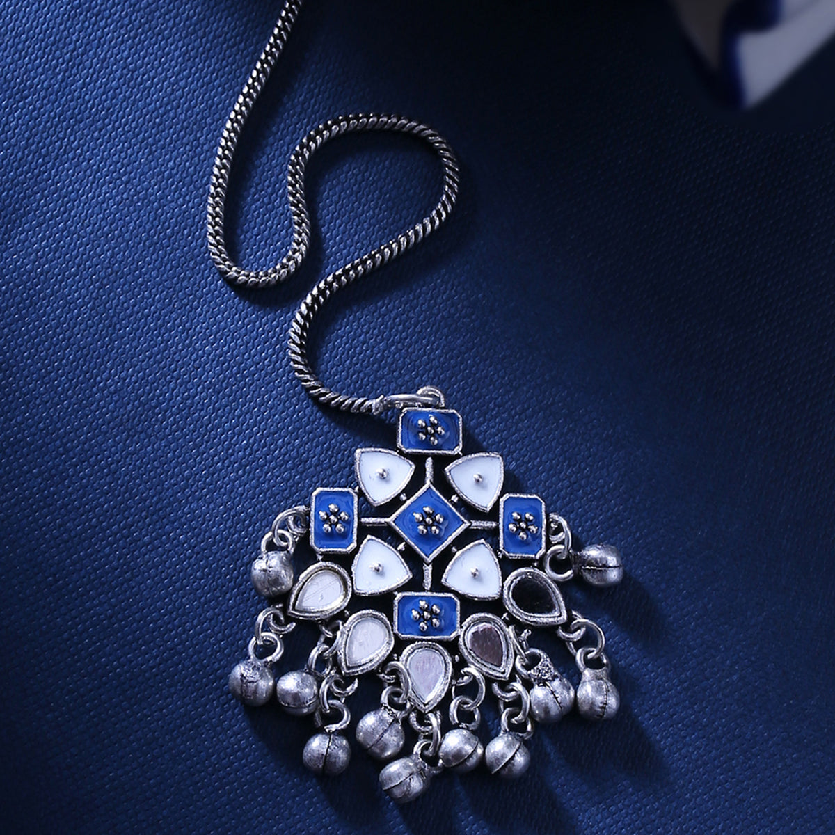 Statement maang tika made from brass and oxidised silver plated. Enameled and lightly embellished. Wear with ethnic attire.