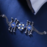Tribal motifs statement bracelet made from brass. Oxidised silver plated and enameled. Wear with ethnic attire or an Indo-Western dress. This piece of jewelry comes with the Voylla assurance of quality and durability. Caring for your fashion jewelry: We, at Voylla, take care of every piece of jewelry so that you don't spend hours caring for them.