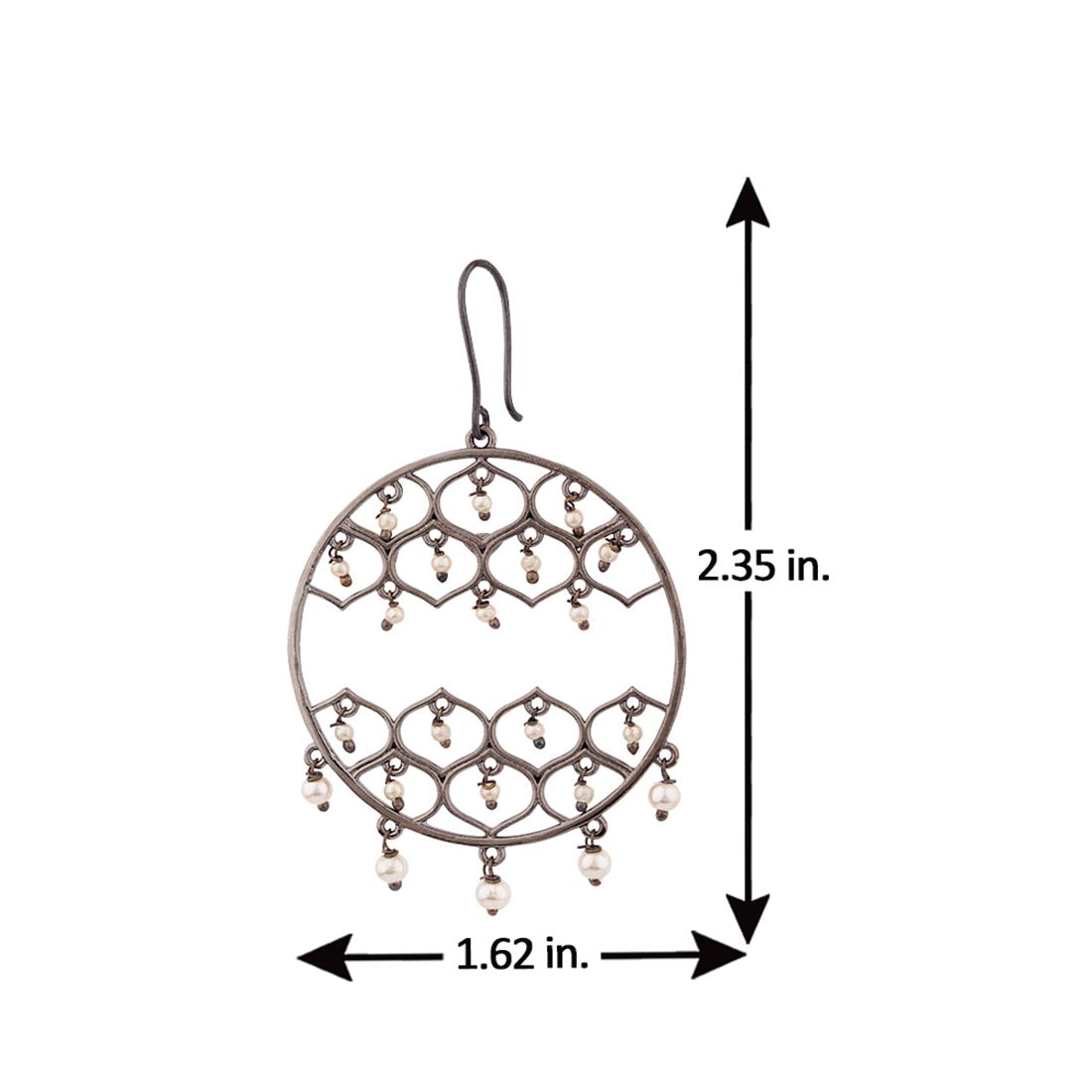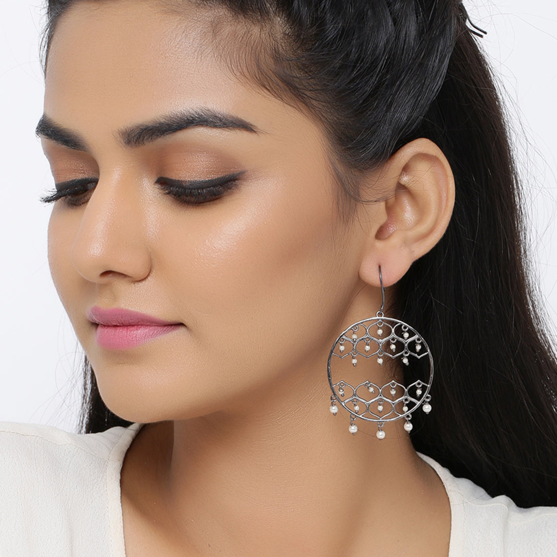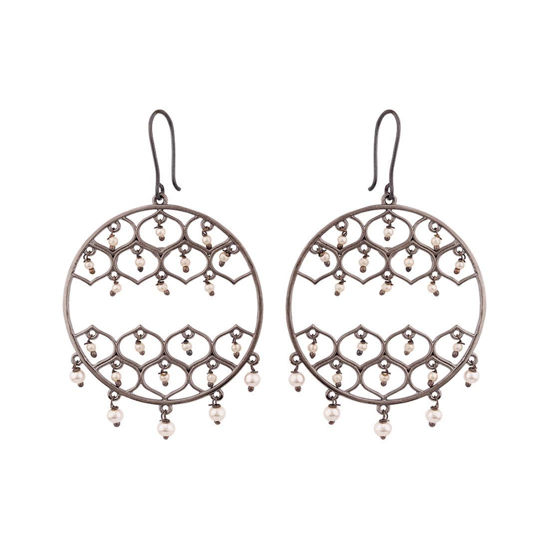Filigree hoop earrings made from brass. Embellished with faux pearls and black rhodium plated. Pair with casual attire. This piece of jewelry comes with the Voylla assurance of quality and durability.