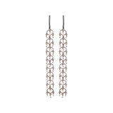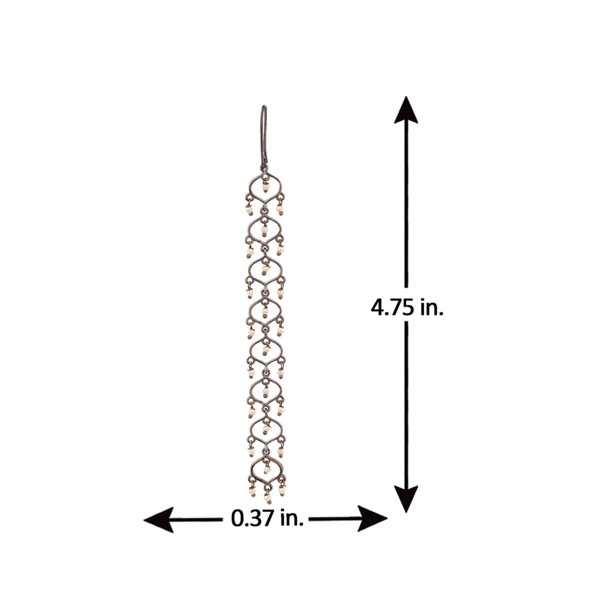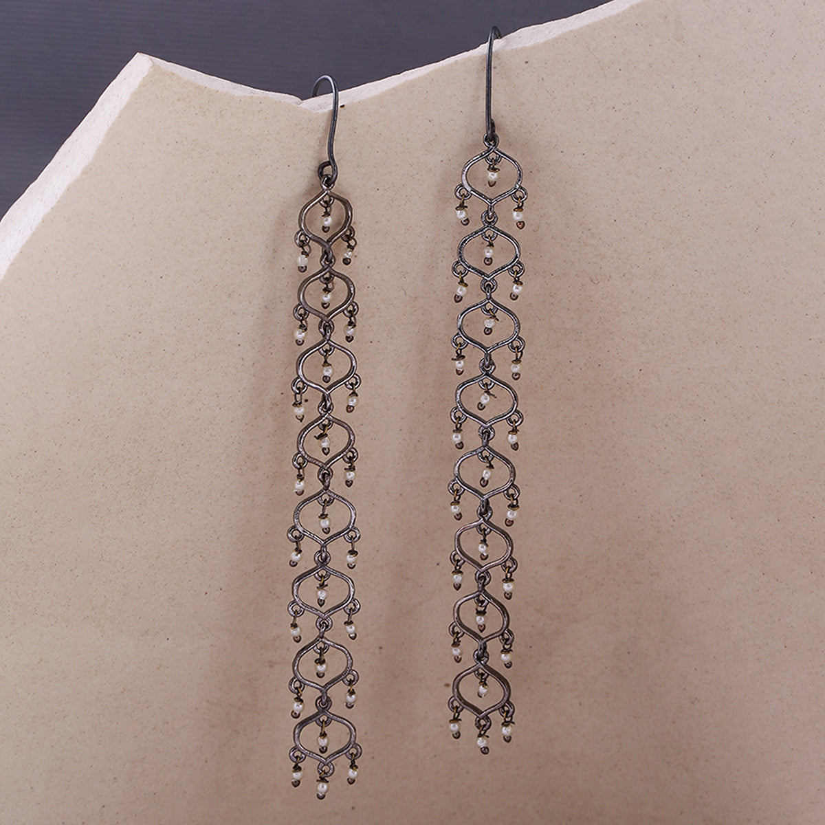 Long drop earrings made from brass and black rhodium plated. Faux pearls embellished. Pair with a summer dress.