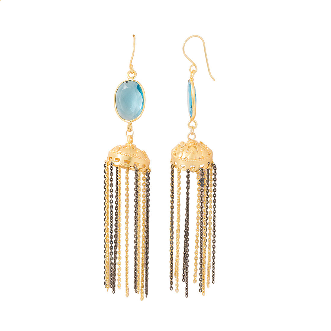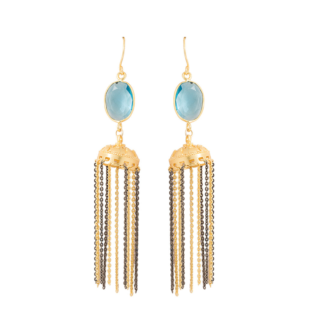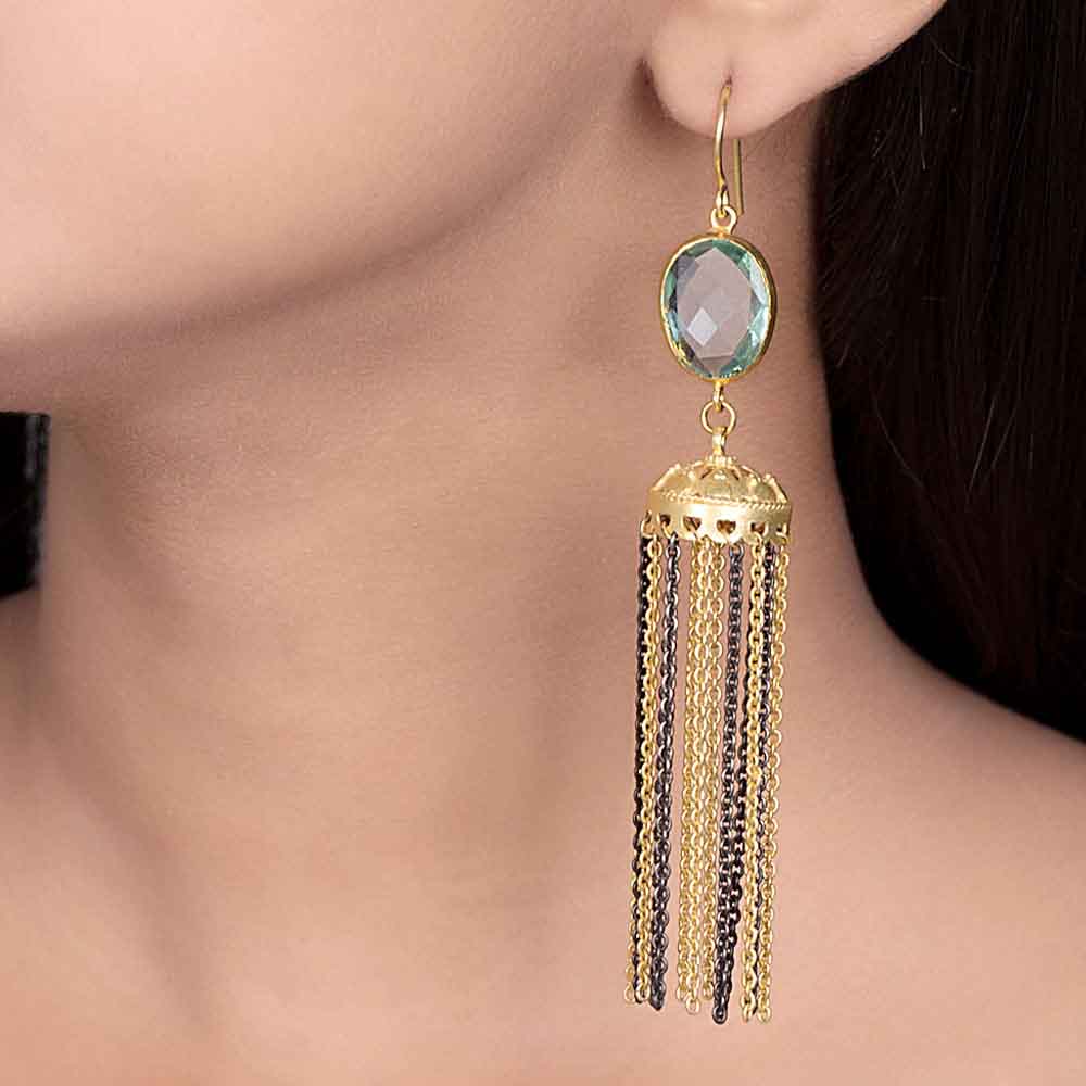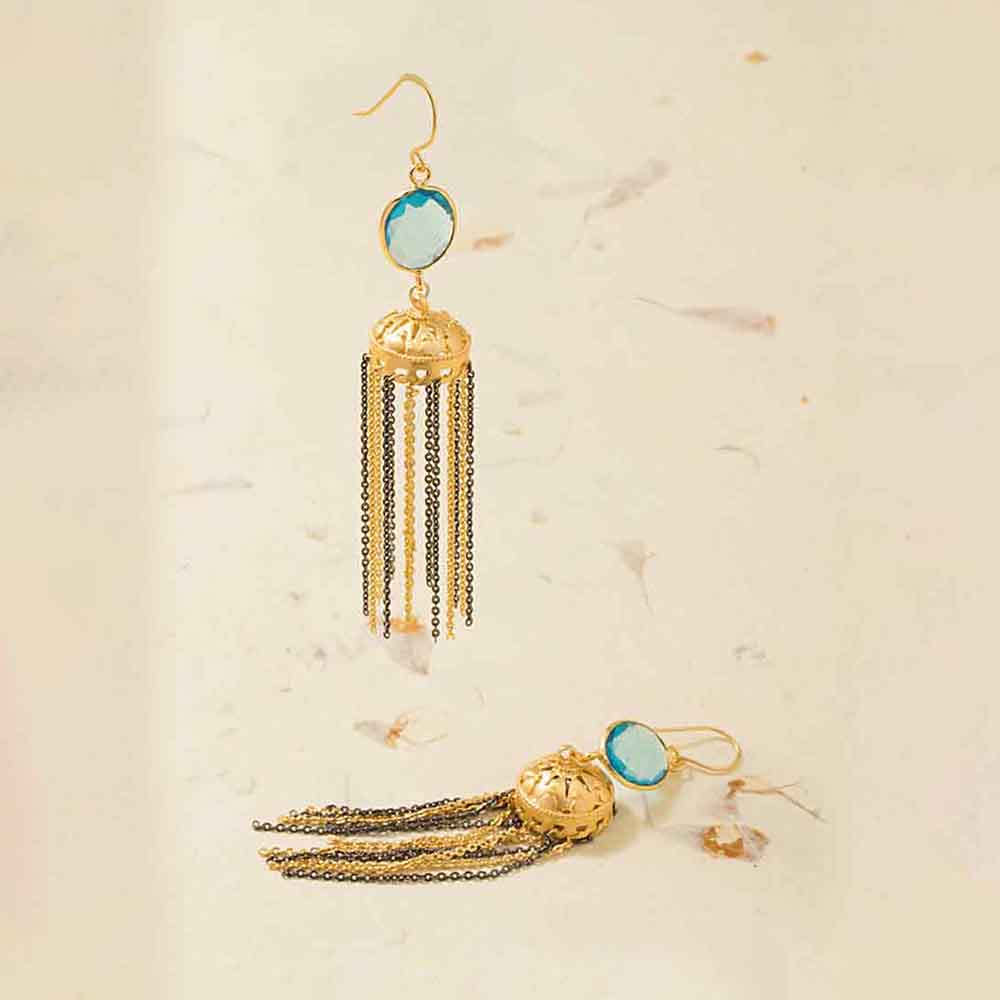 Present a new style of fashion and style with this statement earrings pair. These delicate earrings come in jhumki style and are adorned with blue topaz stone. It will amplify your looks by a high leap if you wear it with a matching attire.