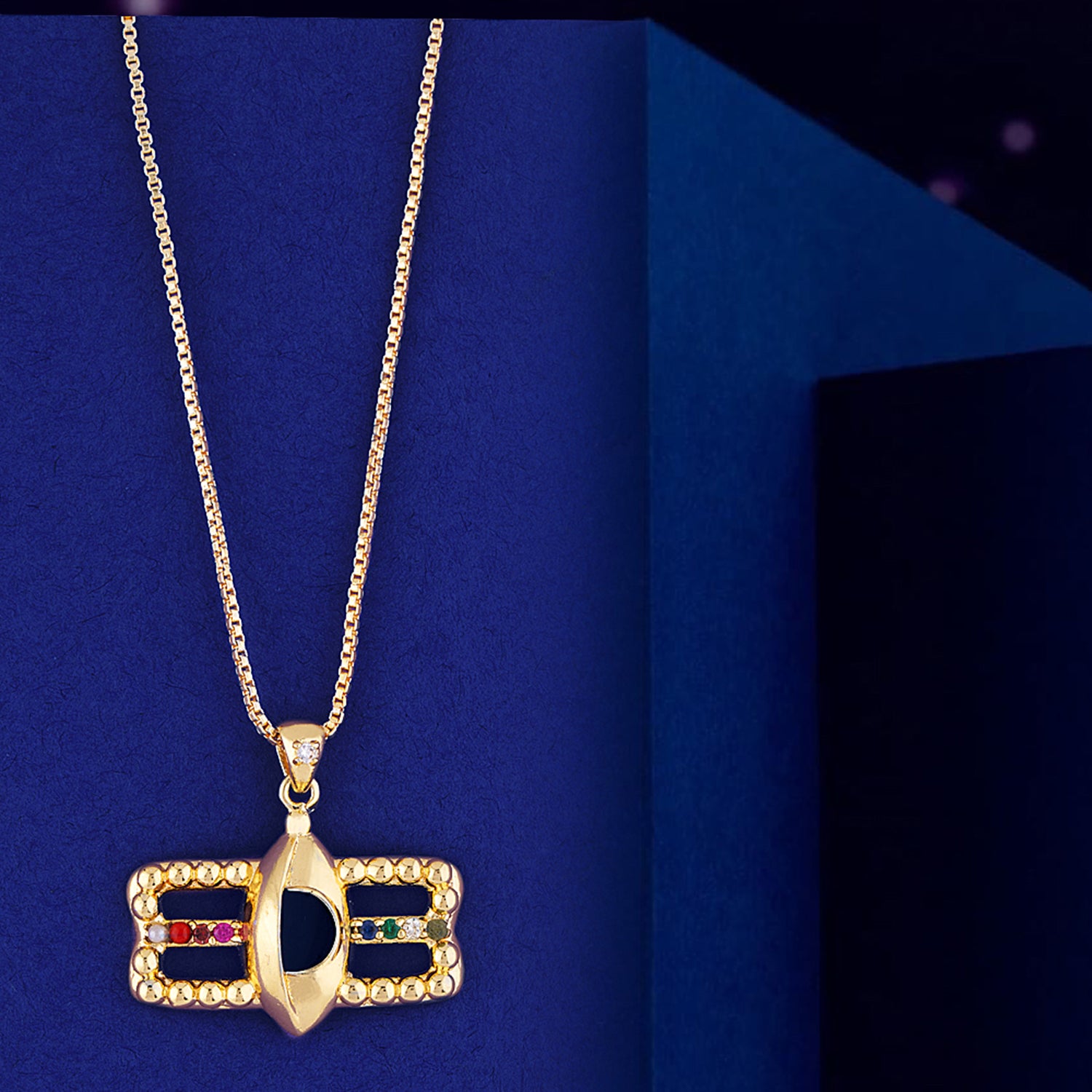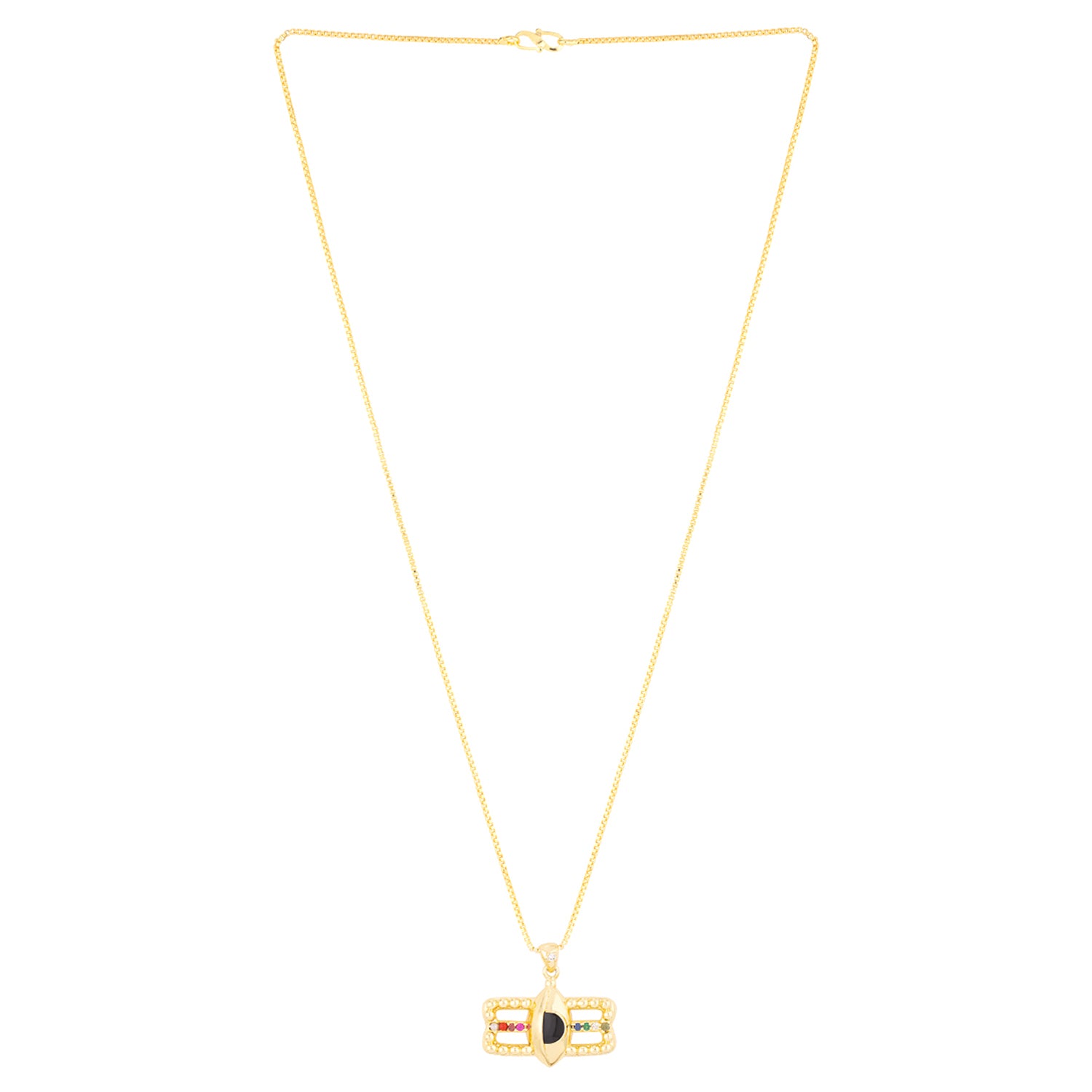 Chandrashekar motif pendant, fashioned out of brass and yellow gold plated. Lightly embellished and threaded in a thin rope chain. Good for everyday wear.