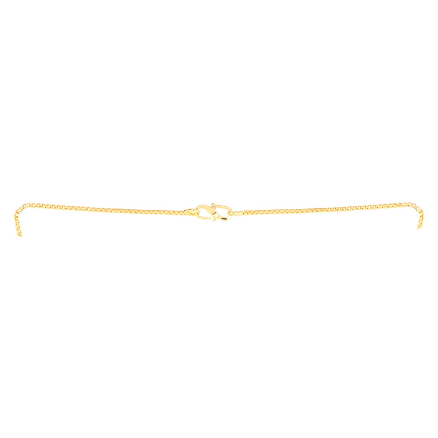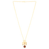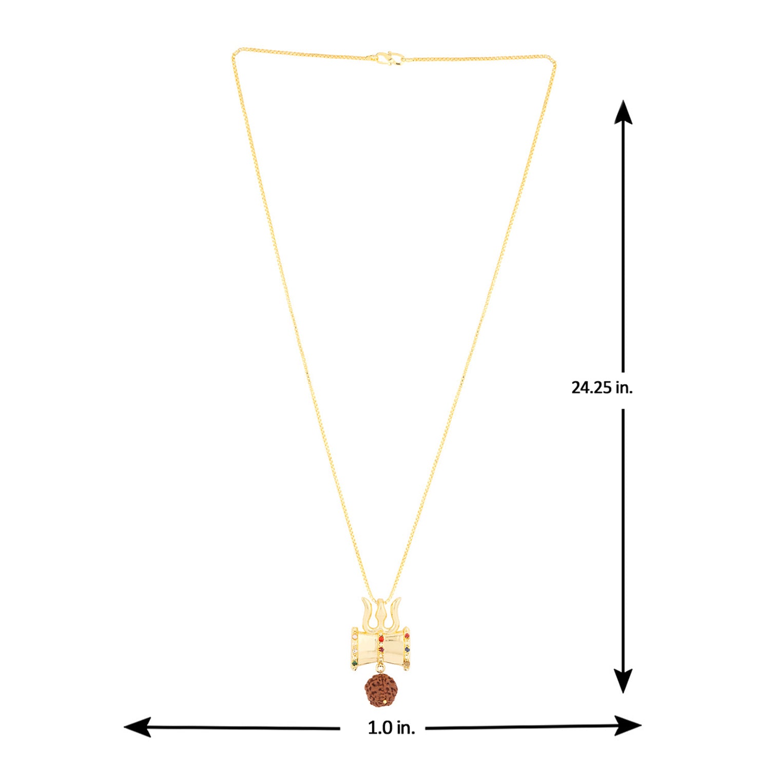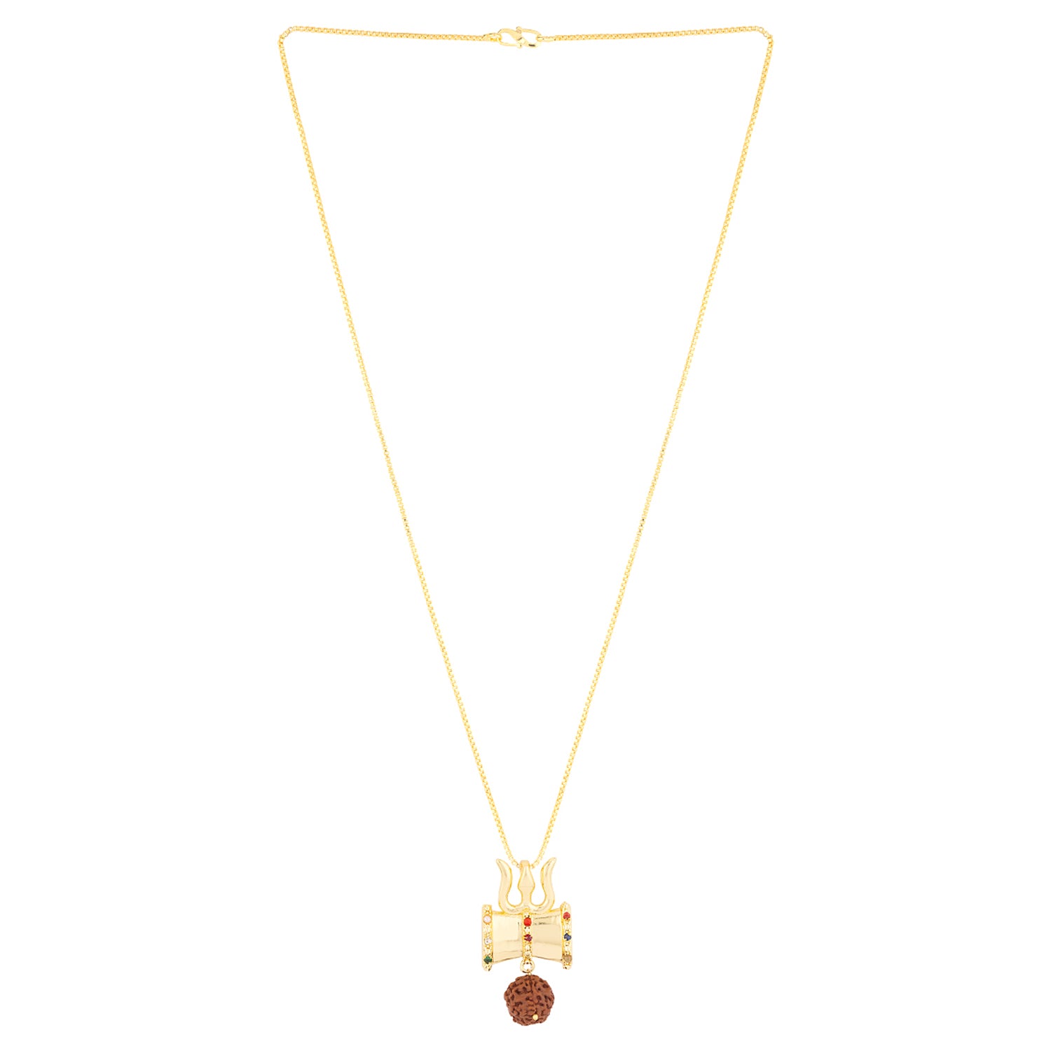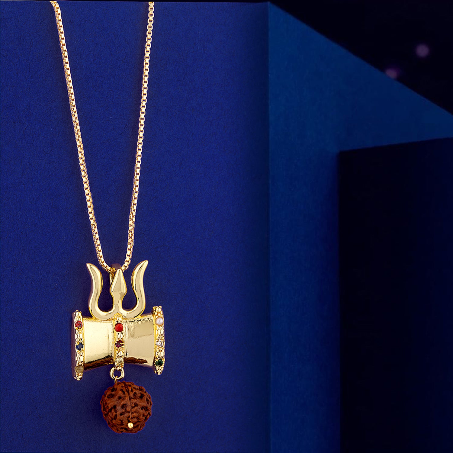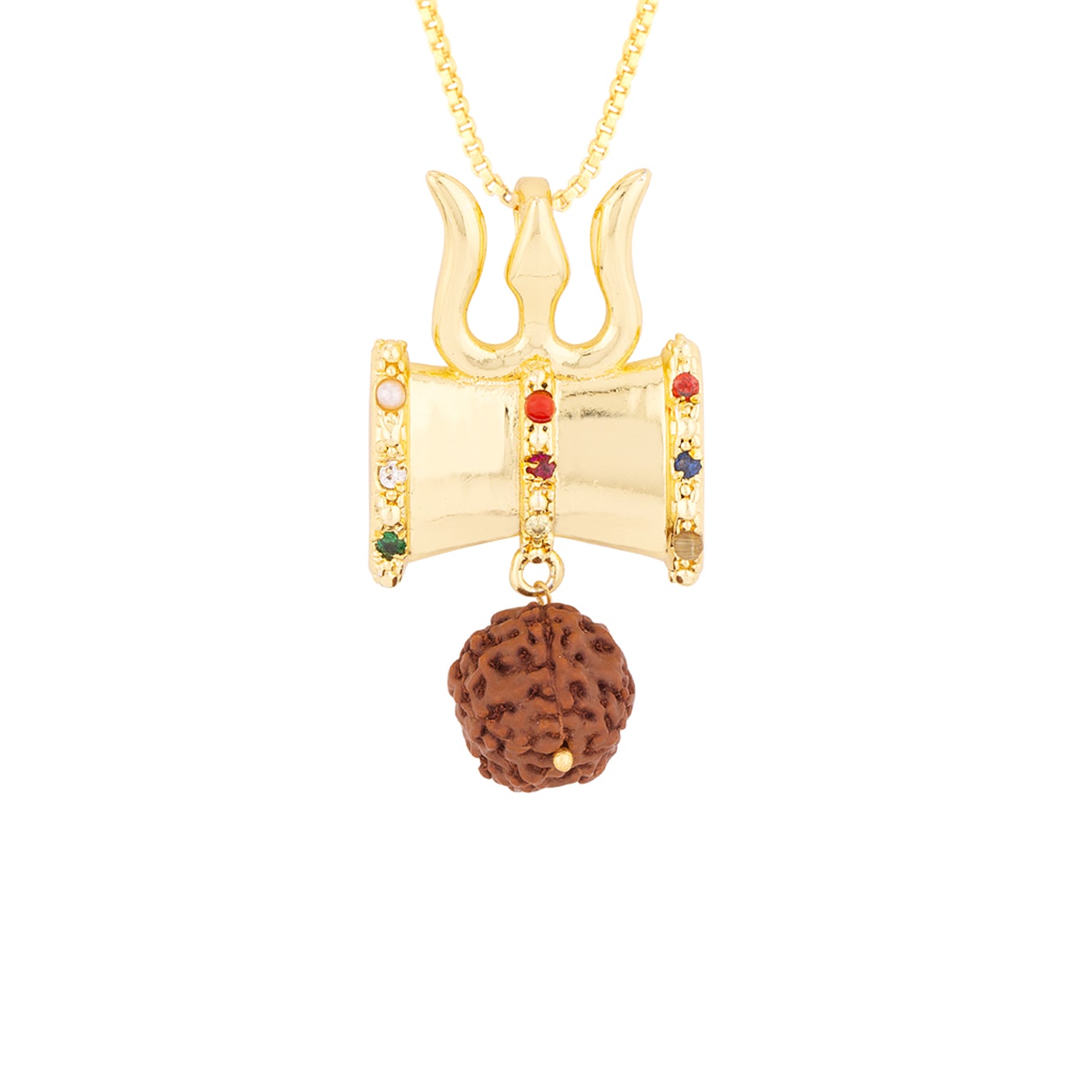 Featuring a Rudraksha bead, this damru and trishul motifs pendant has been fashioned out of brass. Yellow gold plated and threaded in a thin chain. Pair with formal ethnic looks.
