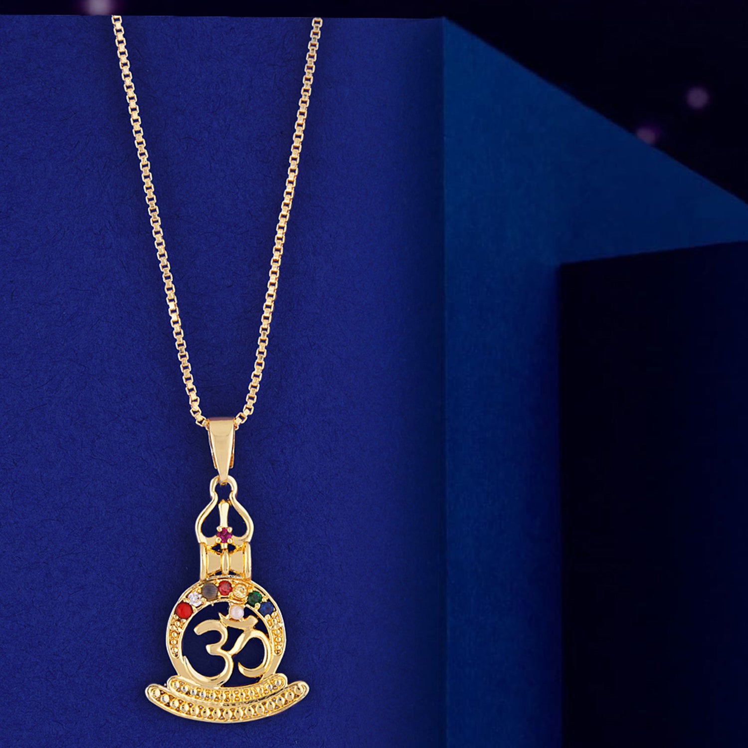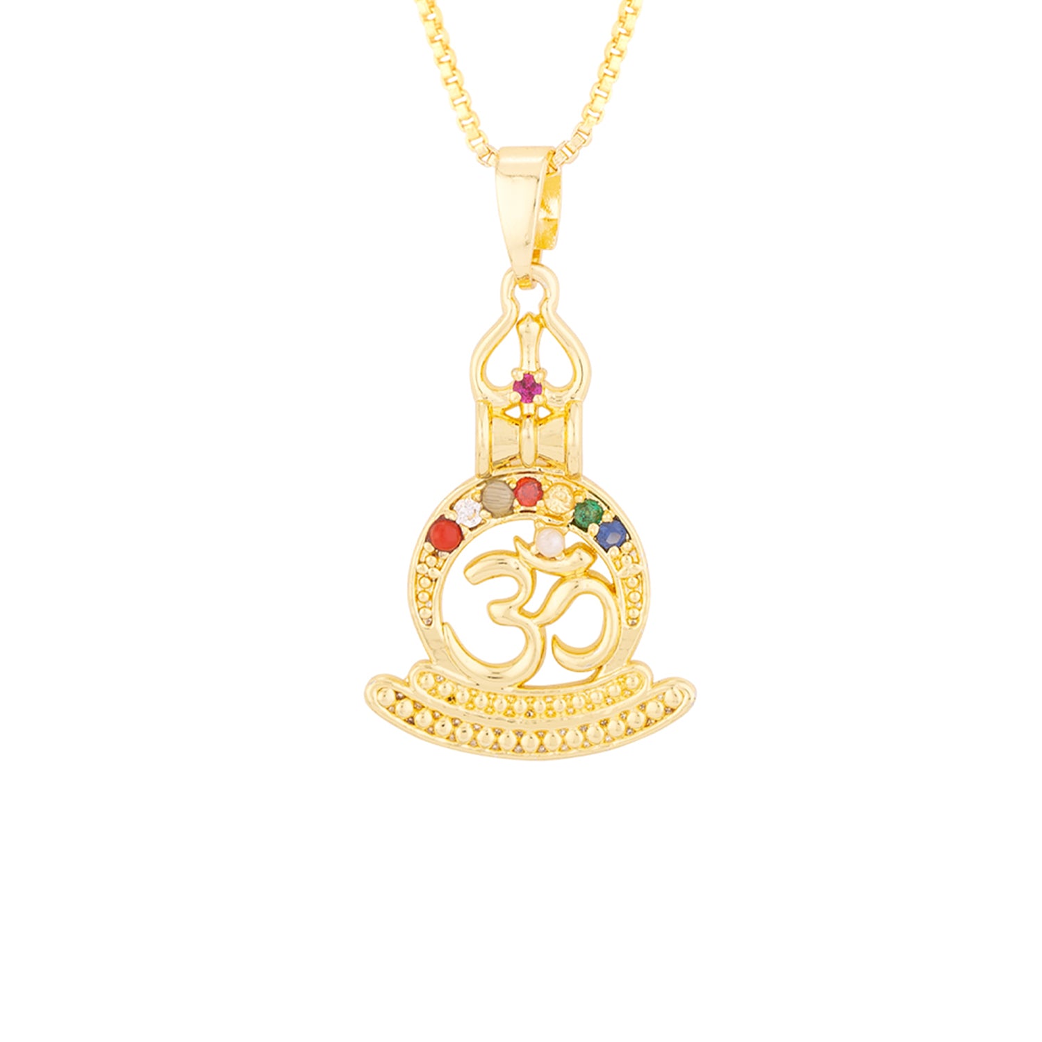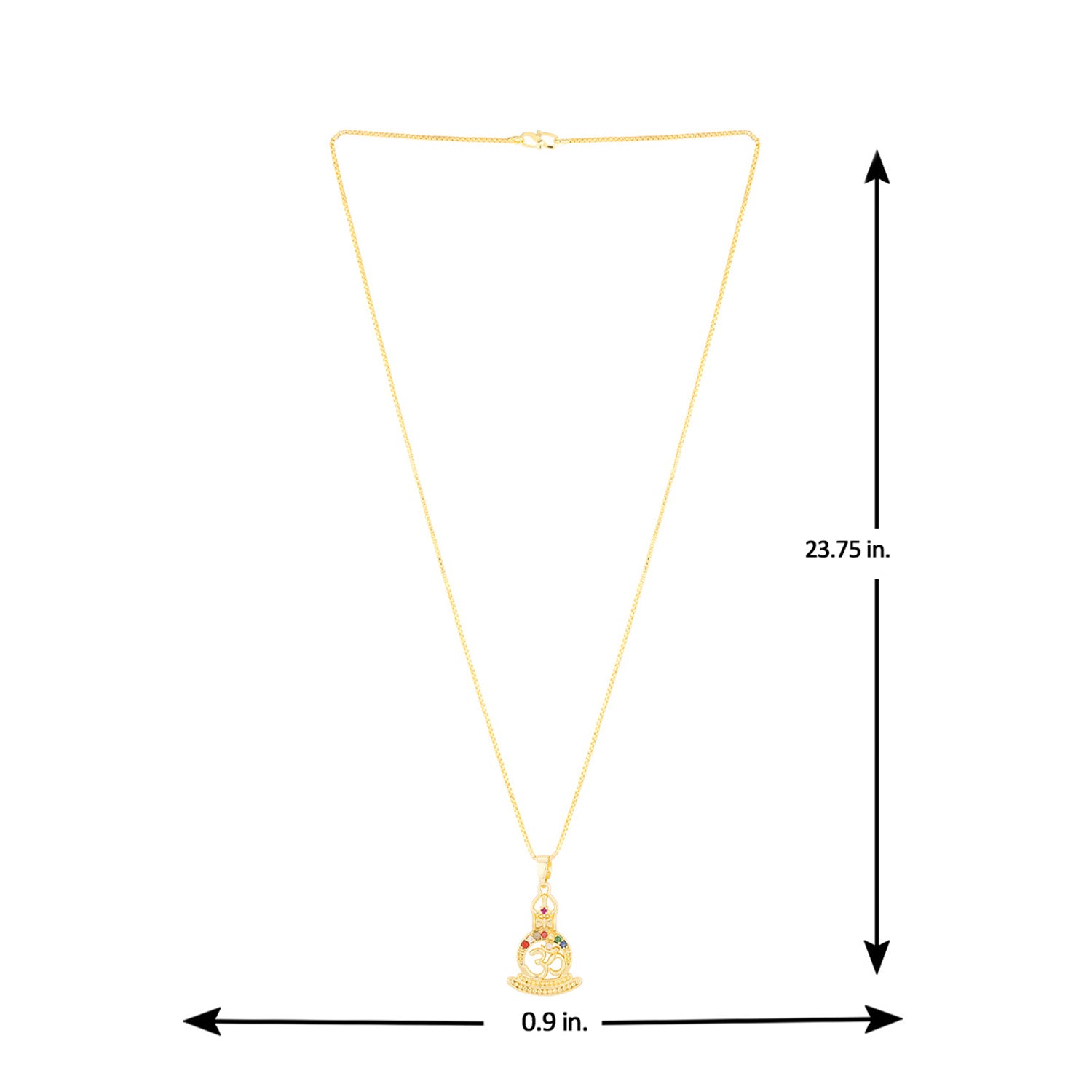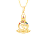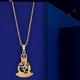 Zircon gemstones adorned OM inscription pendant. Made from brass and yellow gold plated. Threaded in a rope chain and can be paired with formal attire.