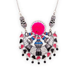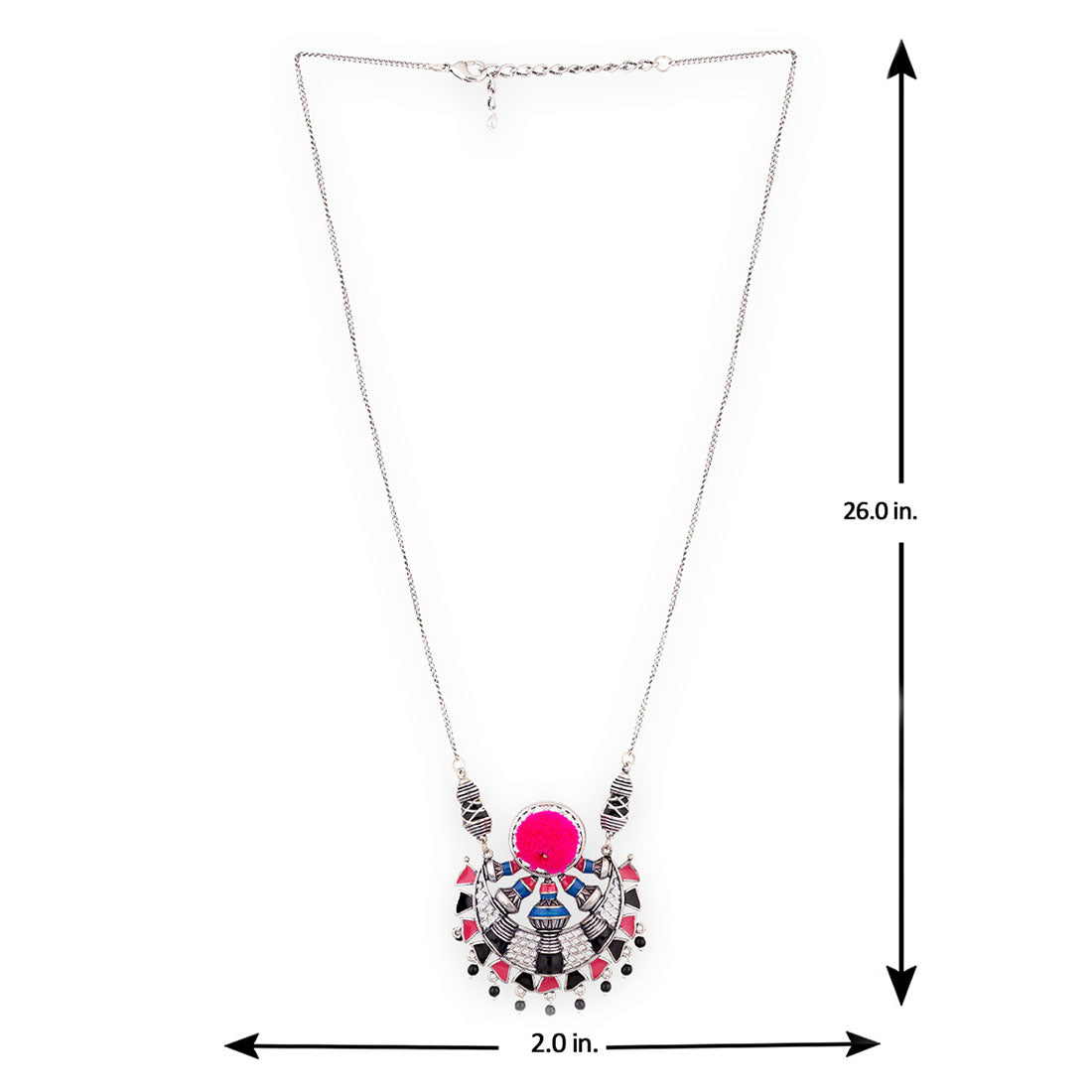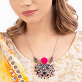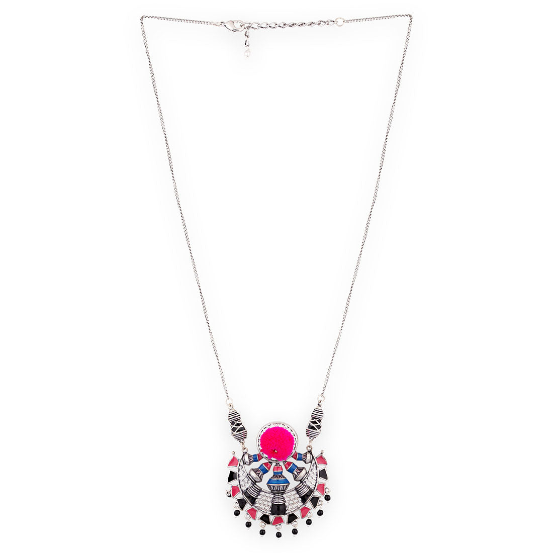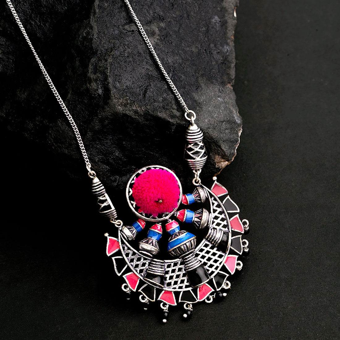 This Kalbelia inspired statement necklace has been fashioned out of brass. Beautifully enameled with black beads and pink pom pom, this oxidized silver-plated necklace can be paired with a saree or suit.