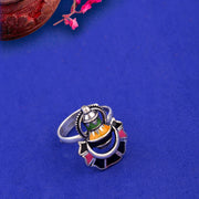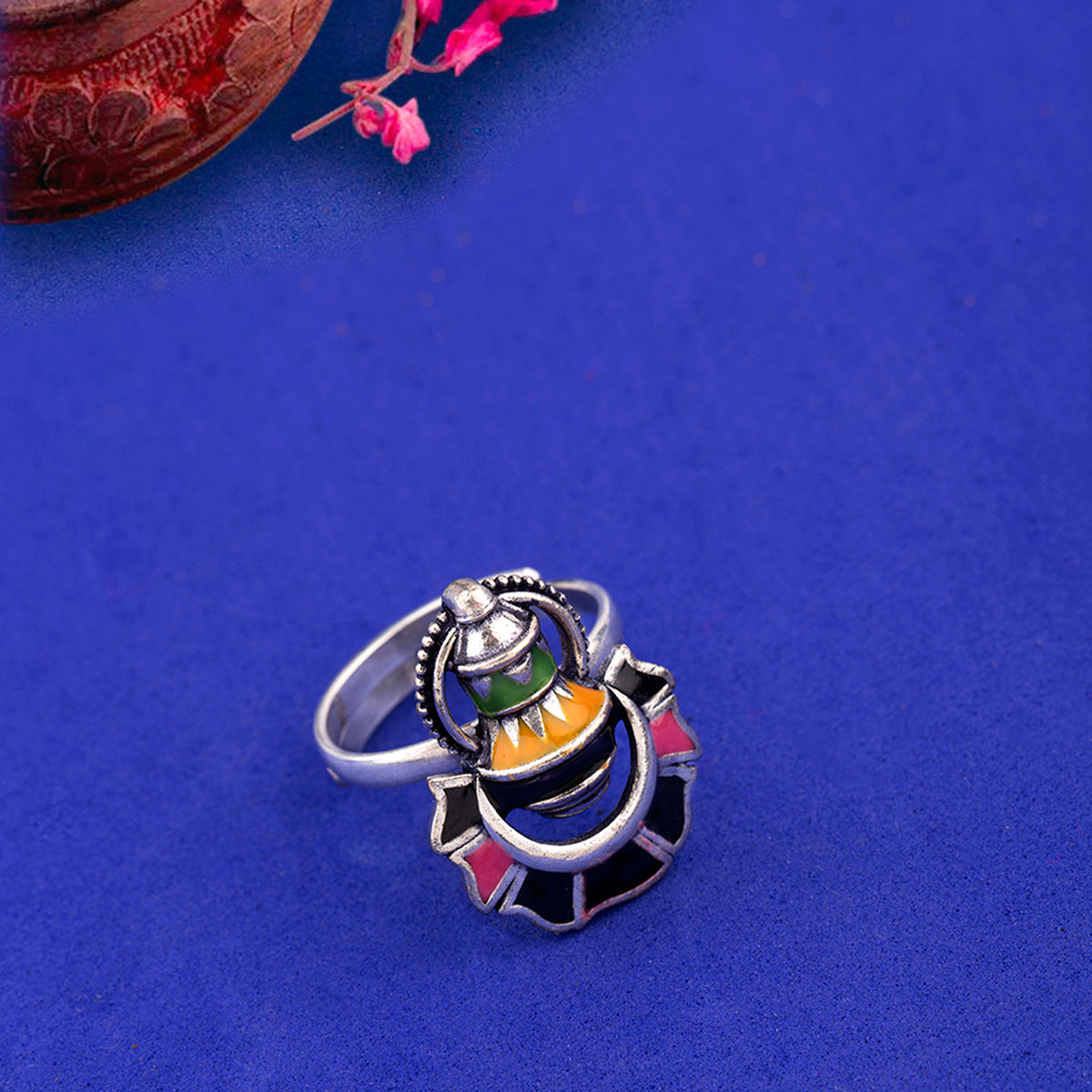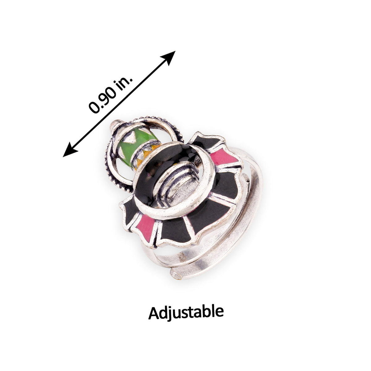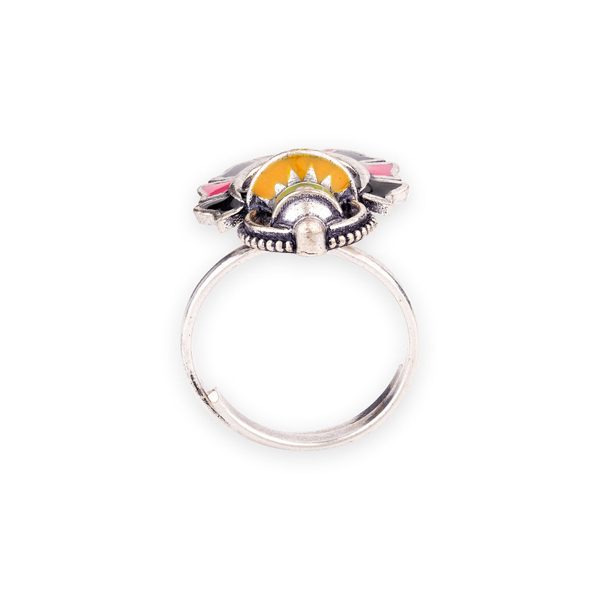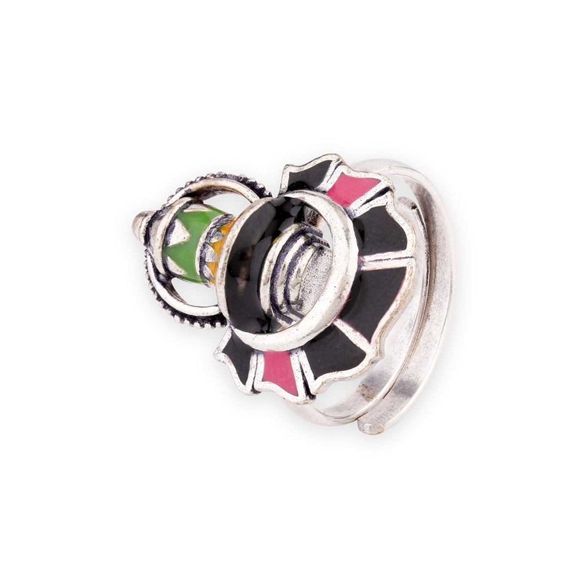 Inspired by a colorful glimpse of Kalbelia attire, This beautiful enamel statement ring is fashioned out of brass. Oxidized silver-plated, lightweight and good for ethnic and Indo-Western looks.