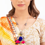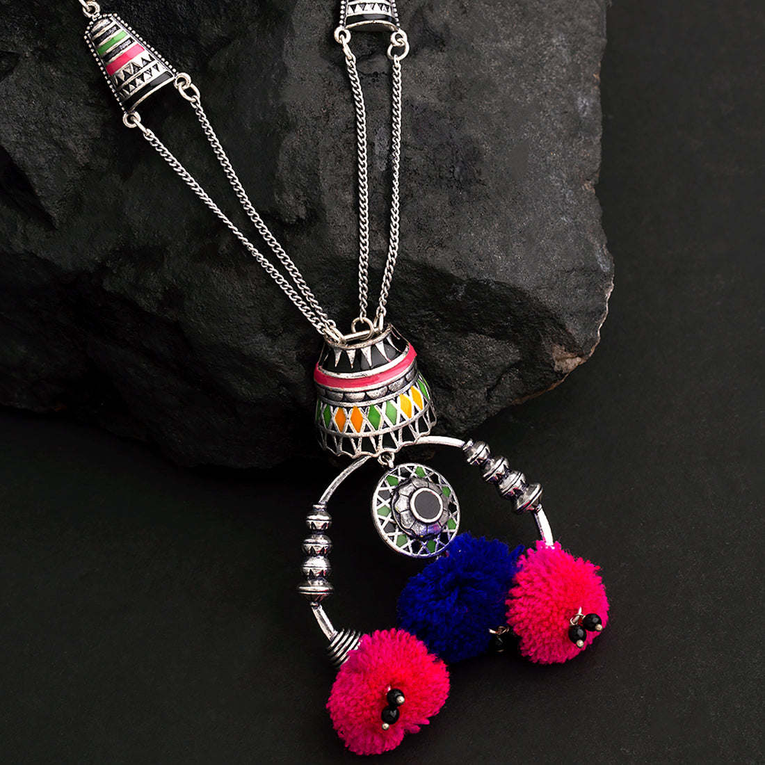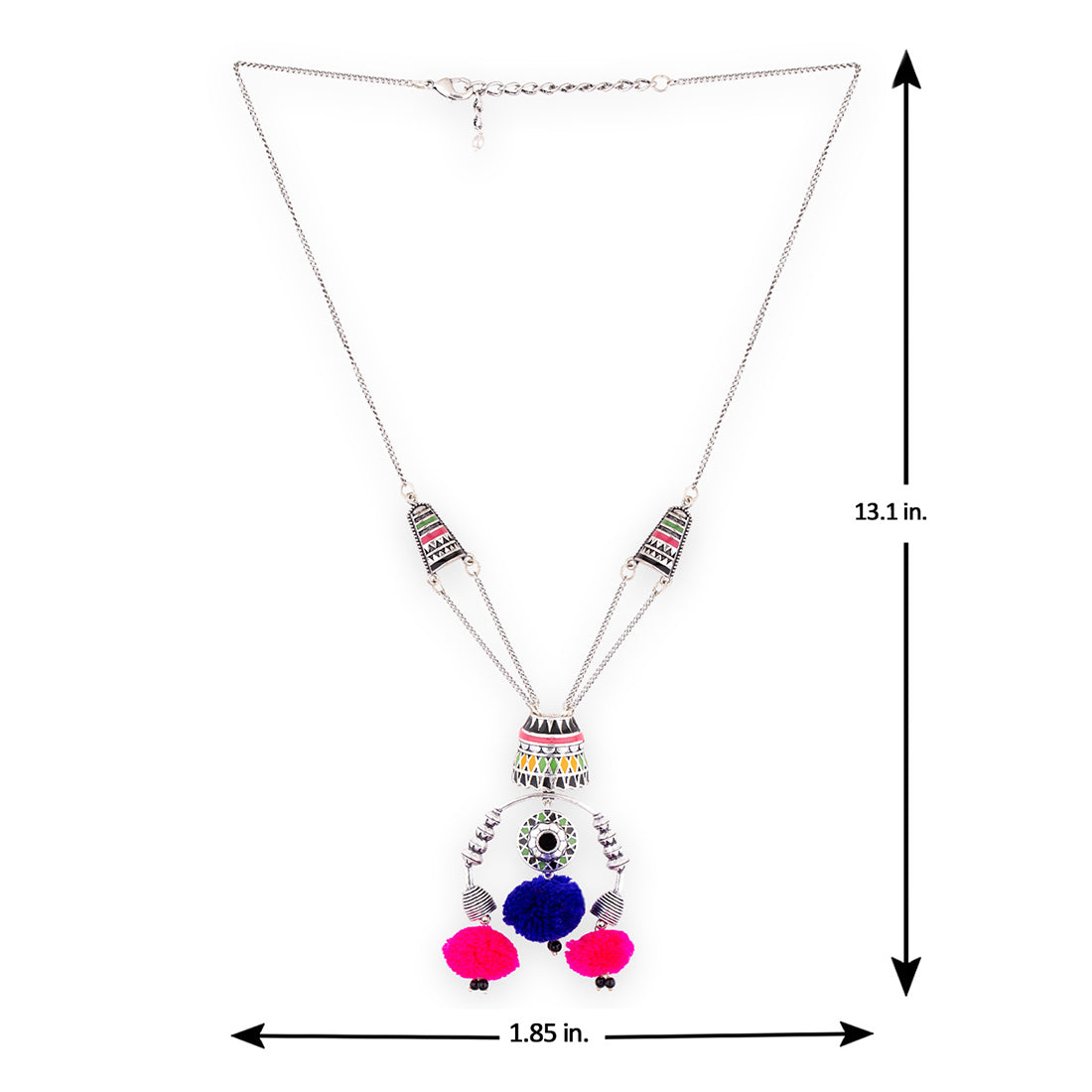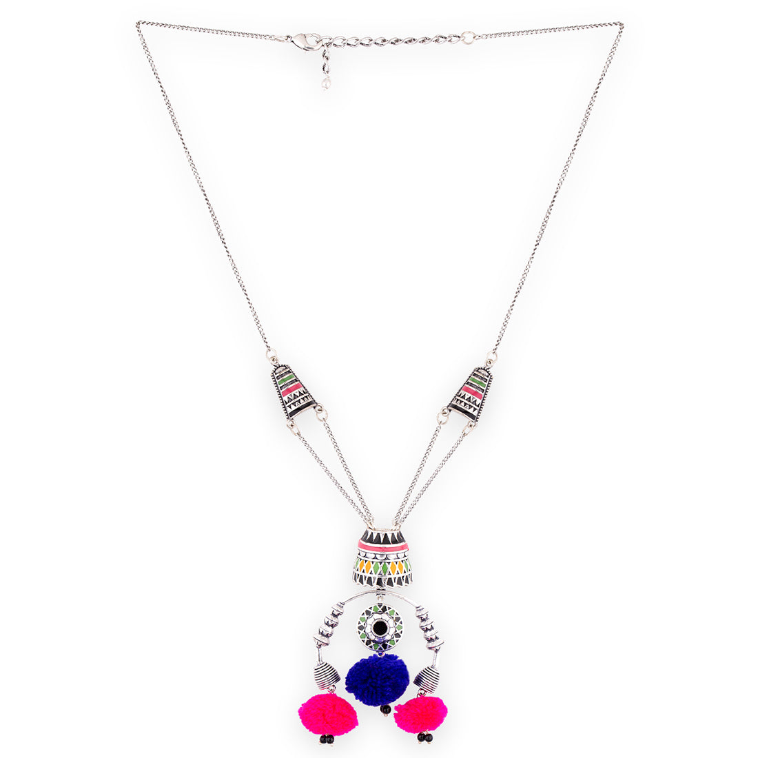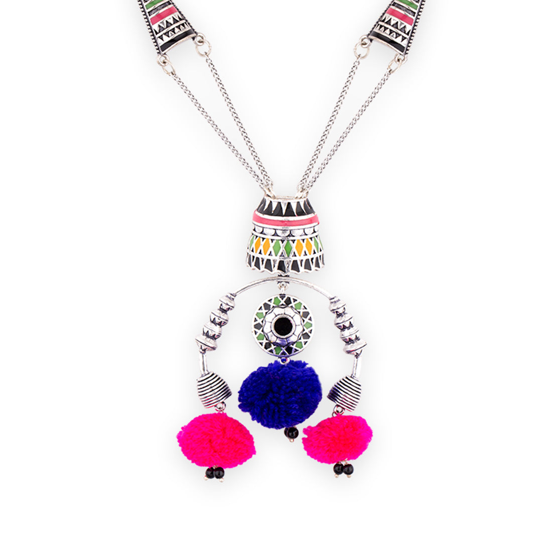 Belongs to the tribe of the Kalbelia, this necklace has been made up of brass with pink and blue pompoms on cotton thread. Lightly enameled and oxidized silver-plated. You can pair it with Indian and Indo-Western attires.