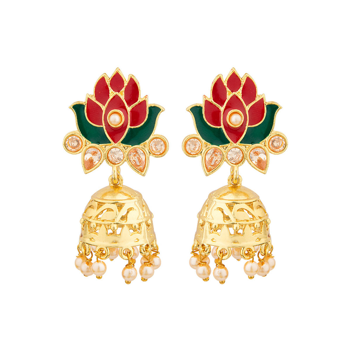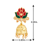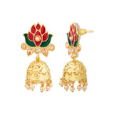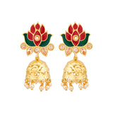 Featuring motifs fashioned after a lotus, the jhumki earrings have been made from zinc alloy. Yellow gold plated and embellished. Match with a red kurta.