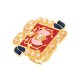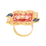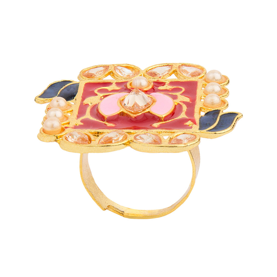 Zinc alloy ring featuring meenakari work and lotus motif. Embellished with faux pearls and gems. Wear the yellow gold plated ring with ethnic attire.