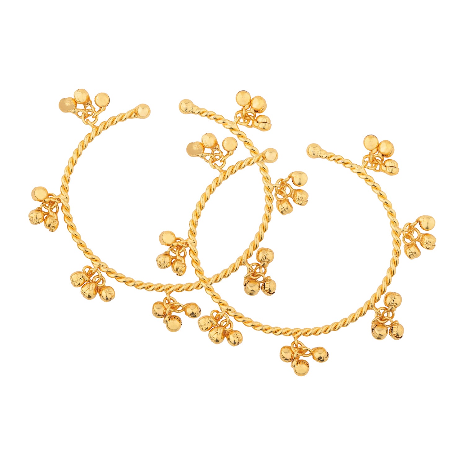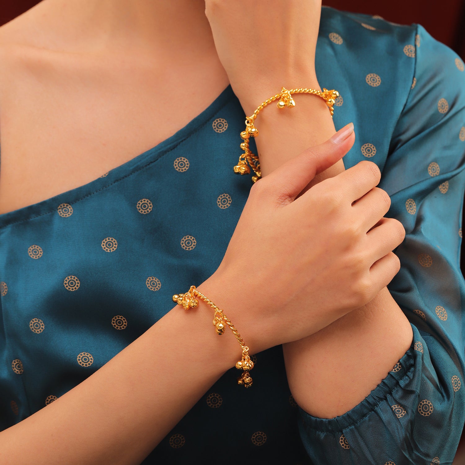 Adorn your wrist with the timeless charm of our Kashmiri Noor Ghungroo Kada, inspired by the rich heritage of Kashmiri jewelry. This beautifully crafted bangle features a twisted gold-tone base decorated with traditional ghungroo bells and delicate hanging chains that create a soft musical jingle with every movement. Made from high-quality brass and finished with luxurious yellow gold plating, this Kashmiri bangle offers a royal antique-gold look while being lightweight and comfortable for daily or festive wear. Its elegant design blends traditional and modern styles, making it perfect for ethnic as well as Indo-western outfits. Whether you’re dressing up for a festival, wedding, or a romantic evening, this Kashmiri ghungroo bangle adds grace and charm. It also makes a beautiful gift for your wife, girlfriend, or loved one for Valentine’s Day, anniversaries, birthdays, and special occasions.