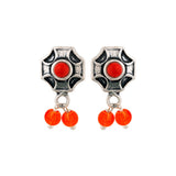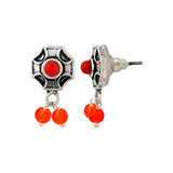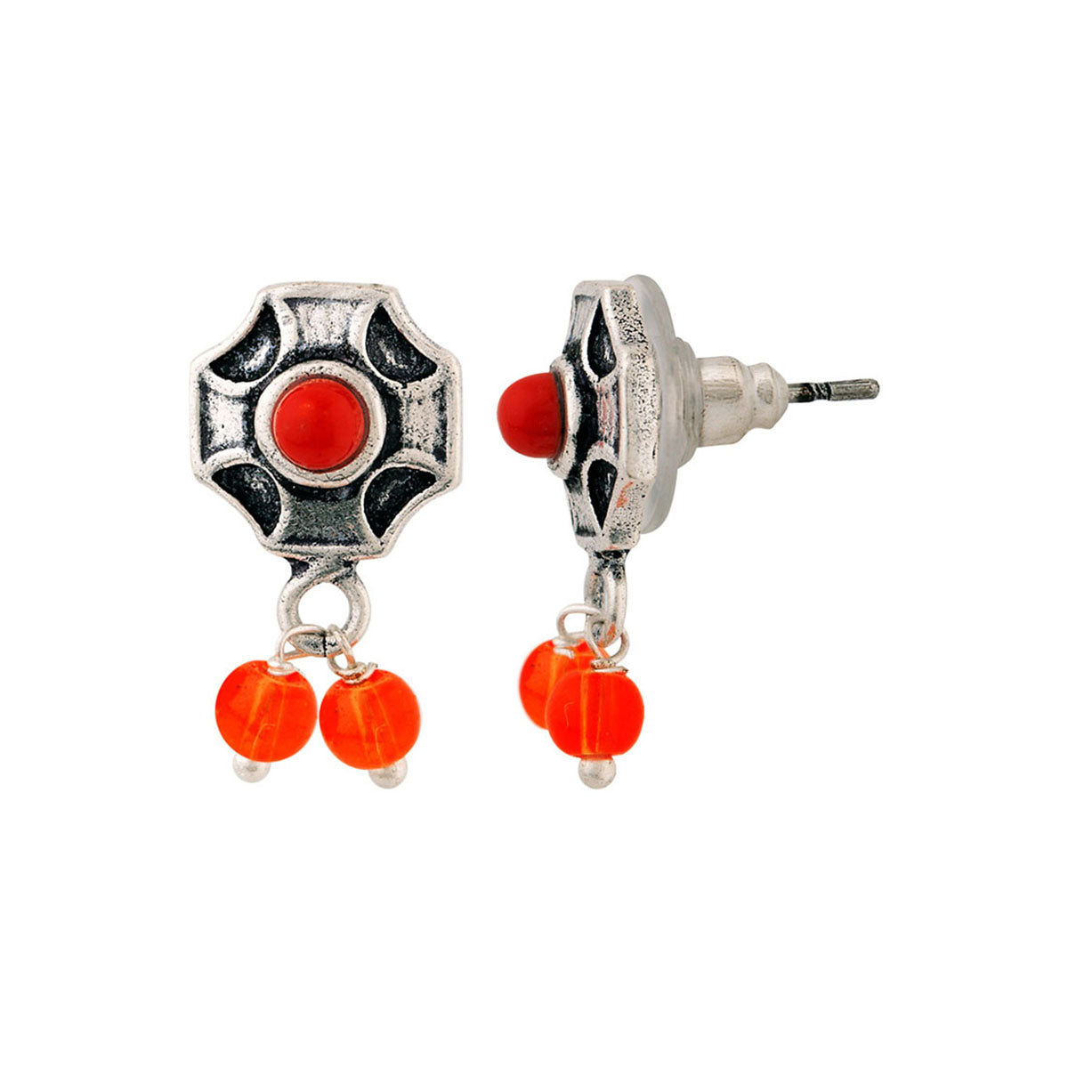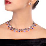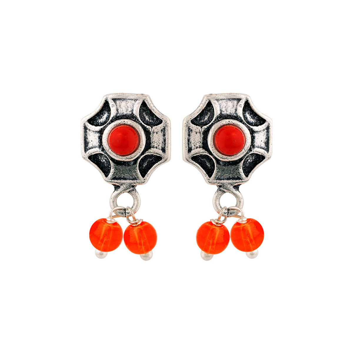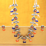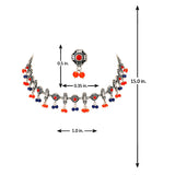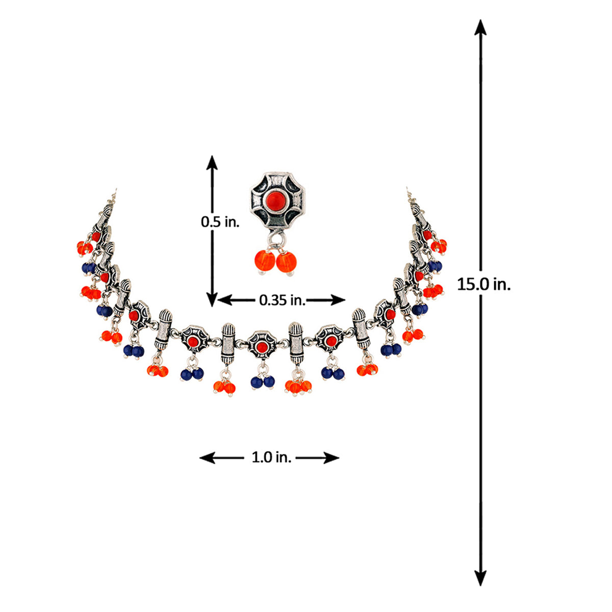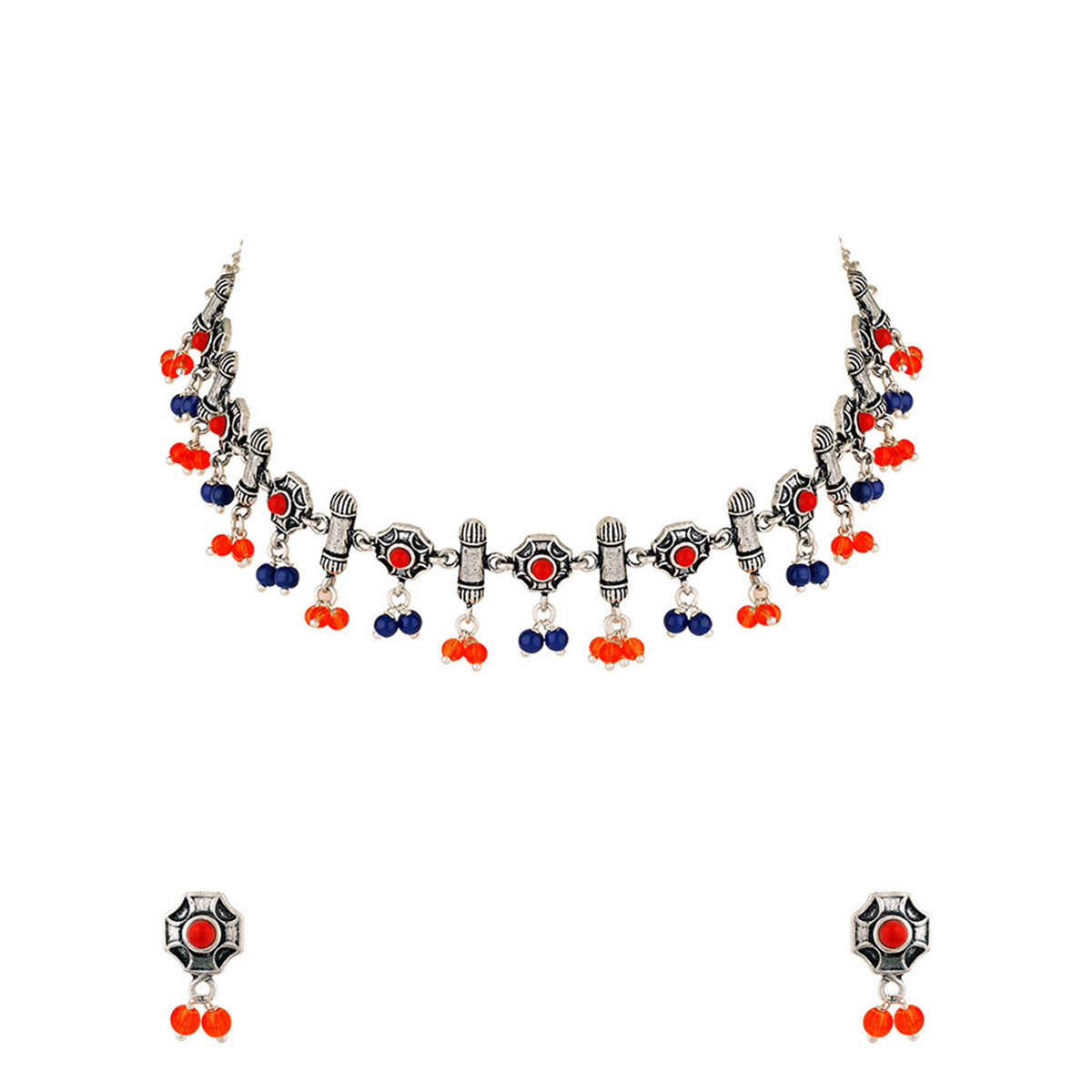 Brass necklace set, embellished with orange and blue beads. Oxidised silver plated, lightweight and a good match for casual ethnic outfits.