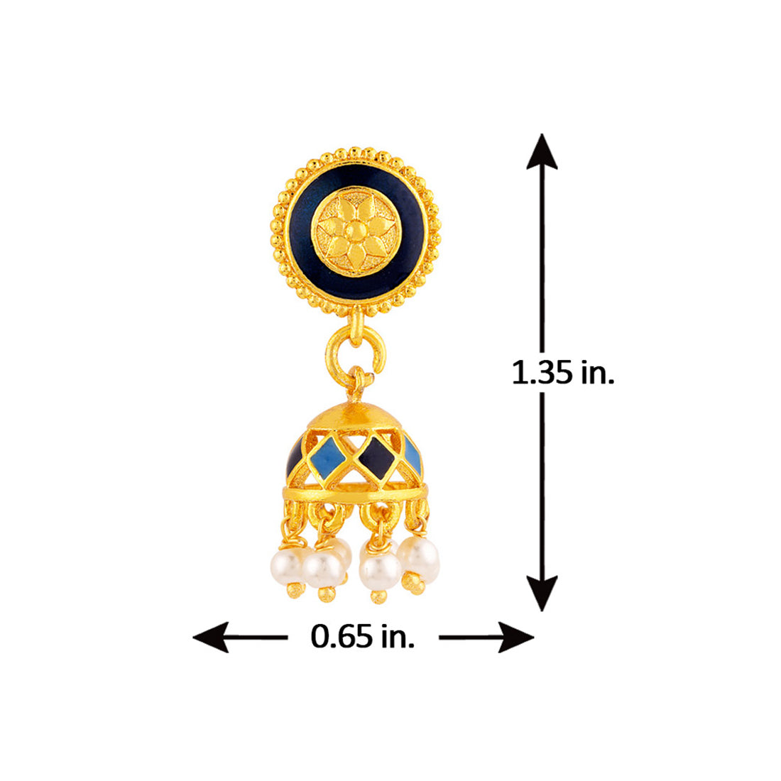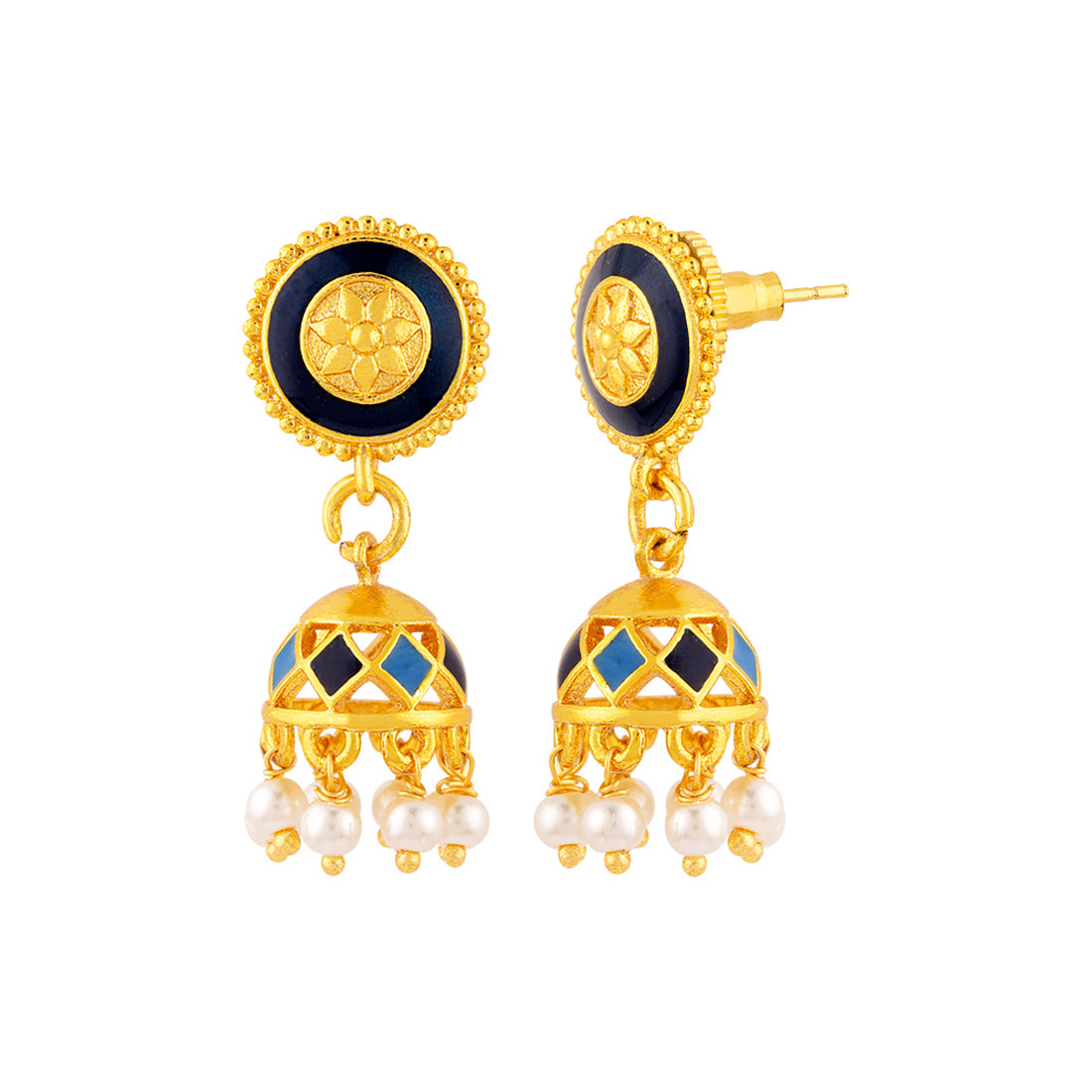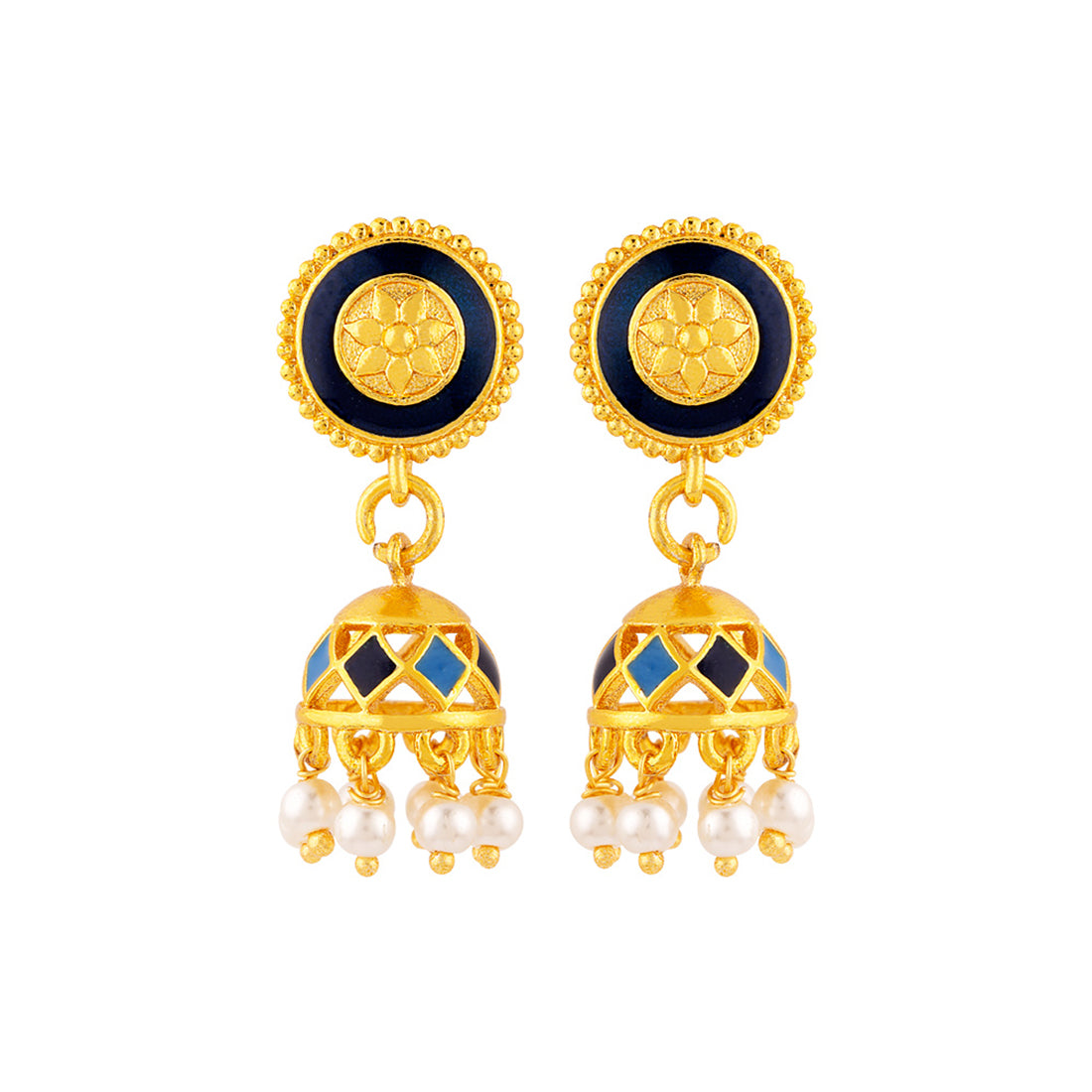 Jhumka drop earrings with faux pearls and yellow gold plating. Enameled and made from brass. Good for everyday wear.