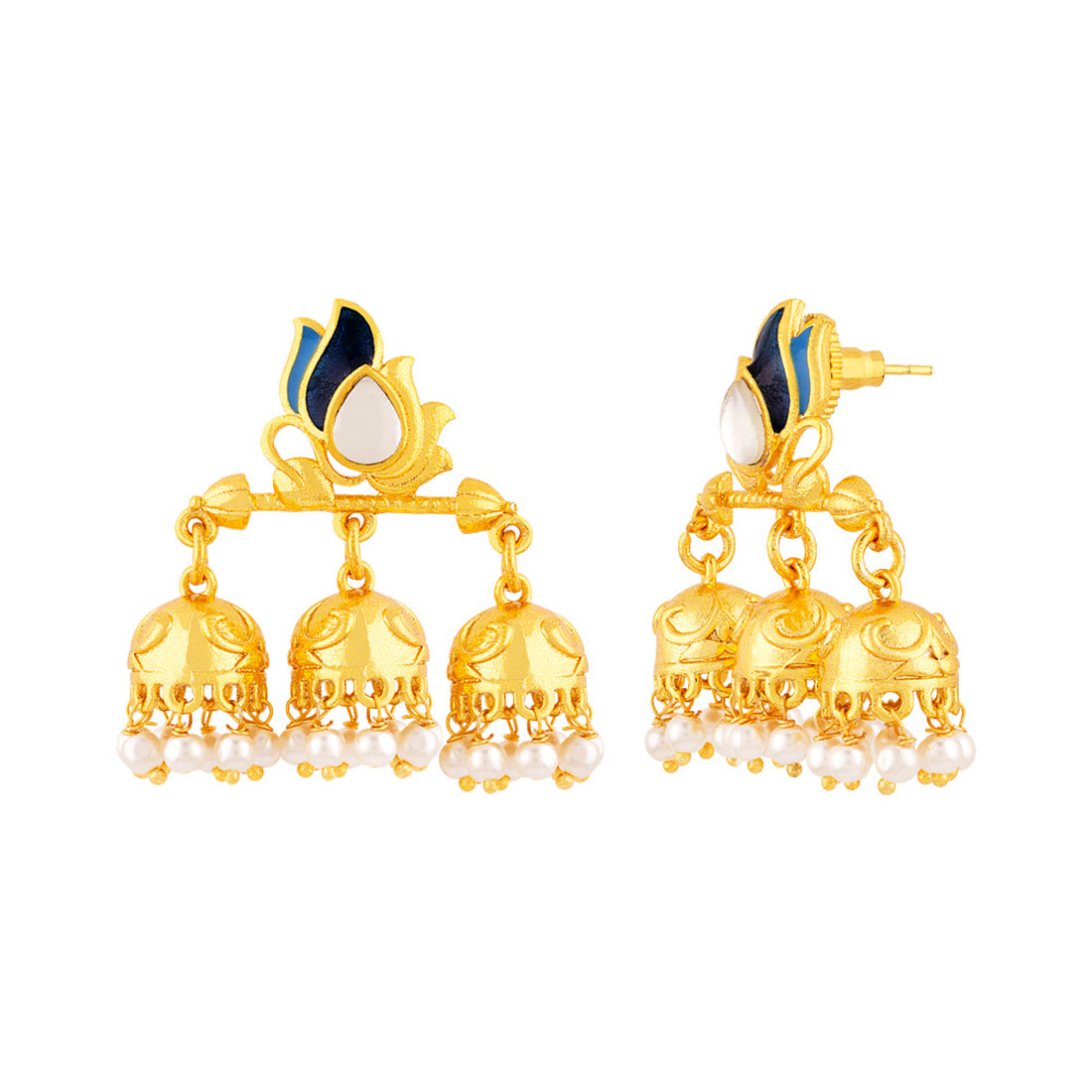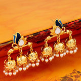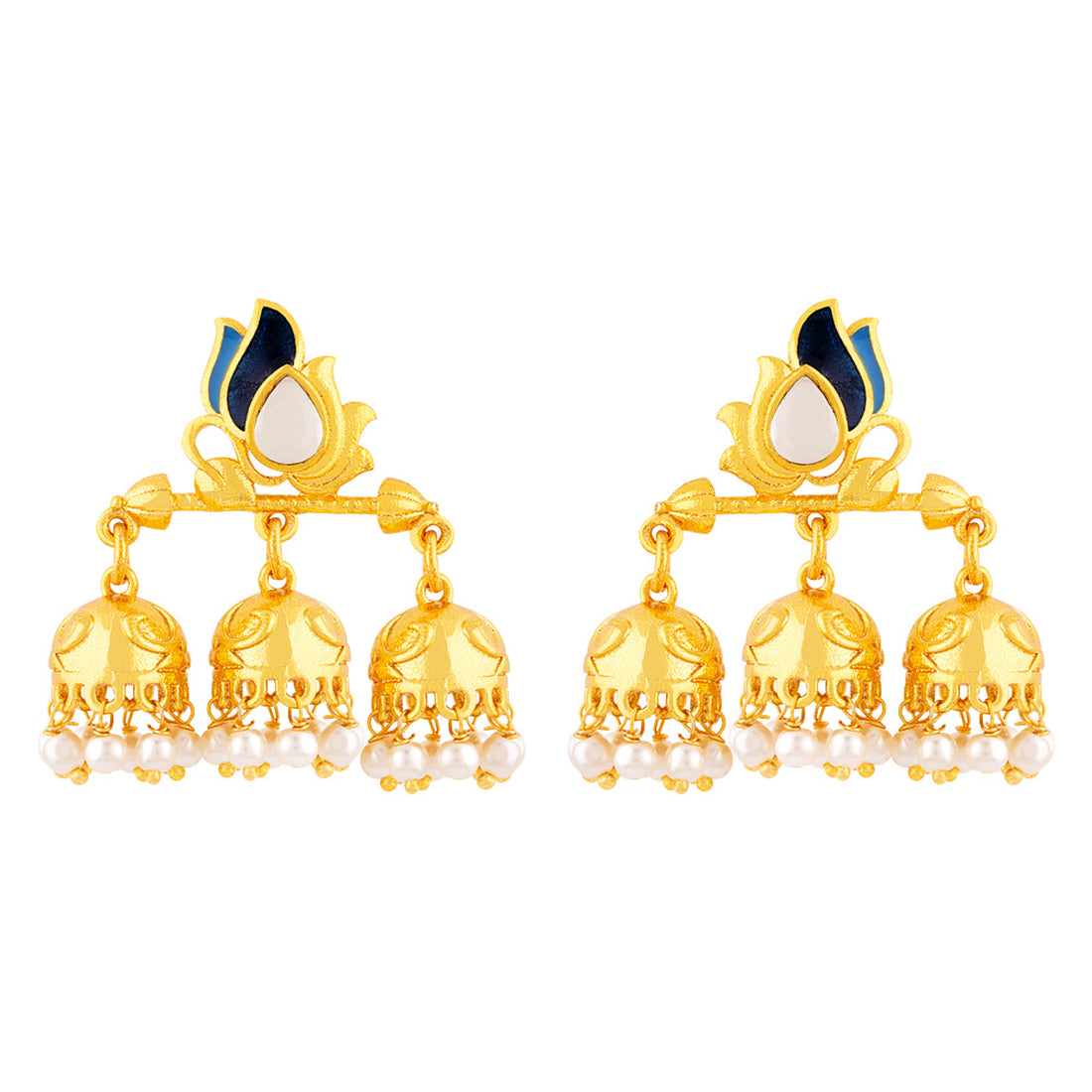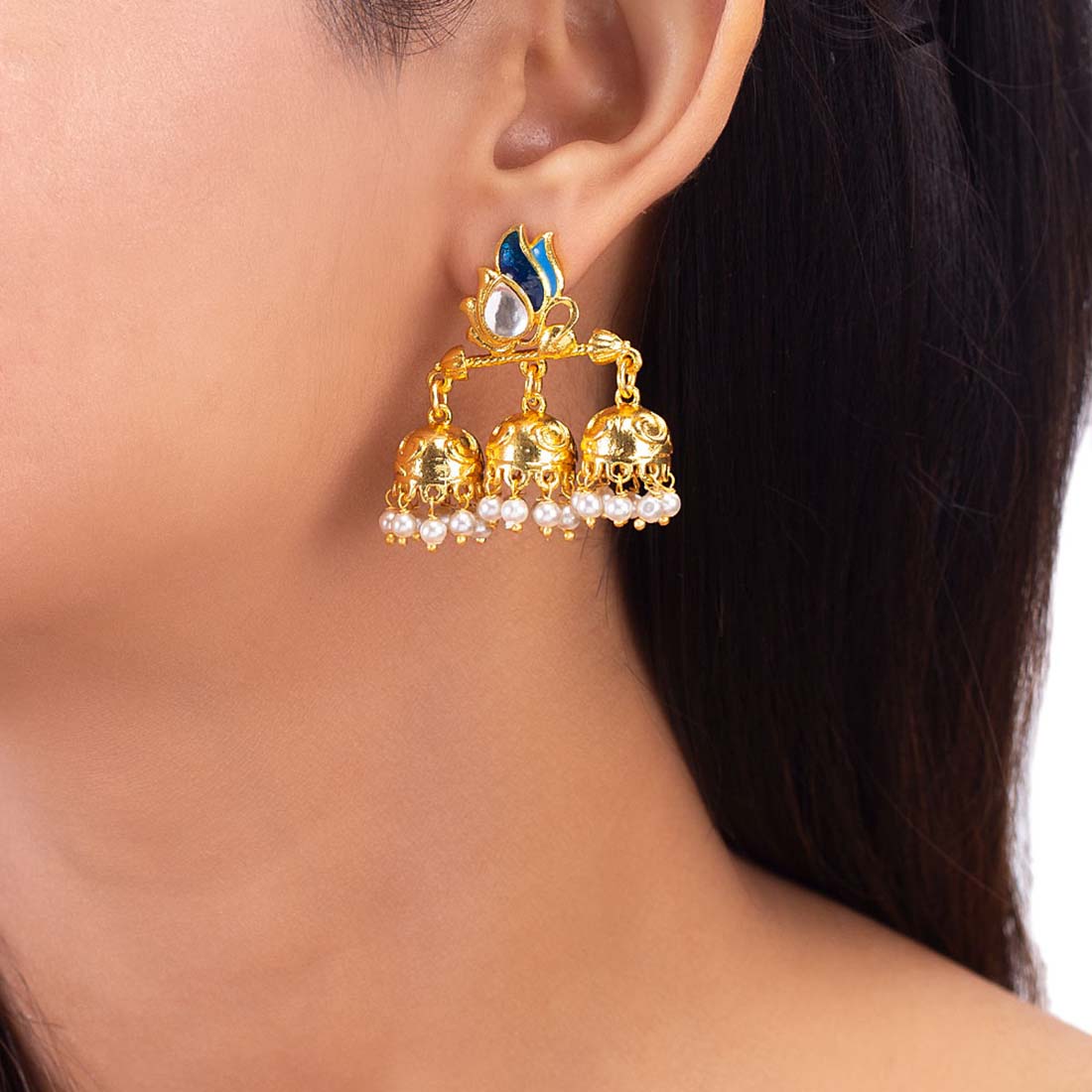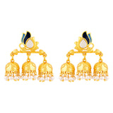 Layered style jhumka earrings with yellow gold plating. Enameled and made from brass. Wear with ethnic attire.