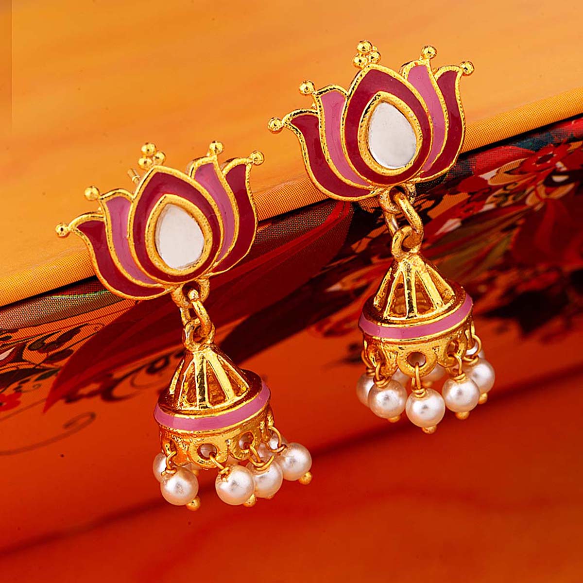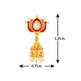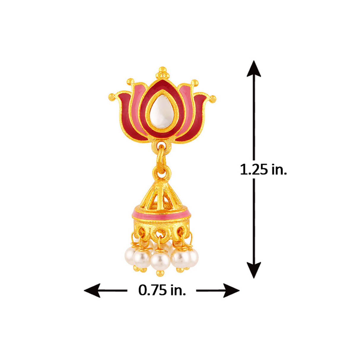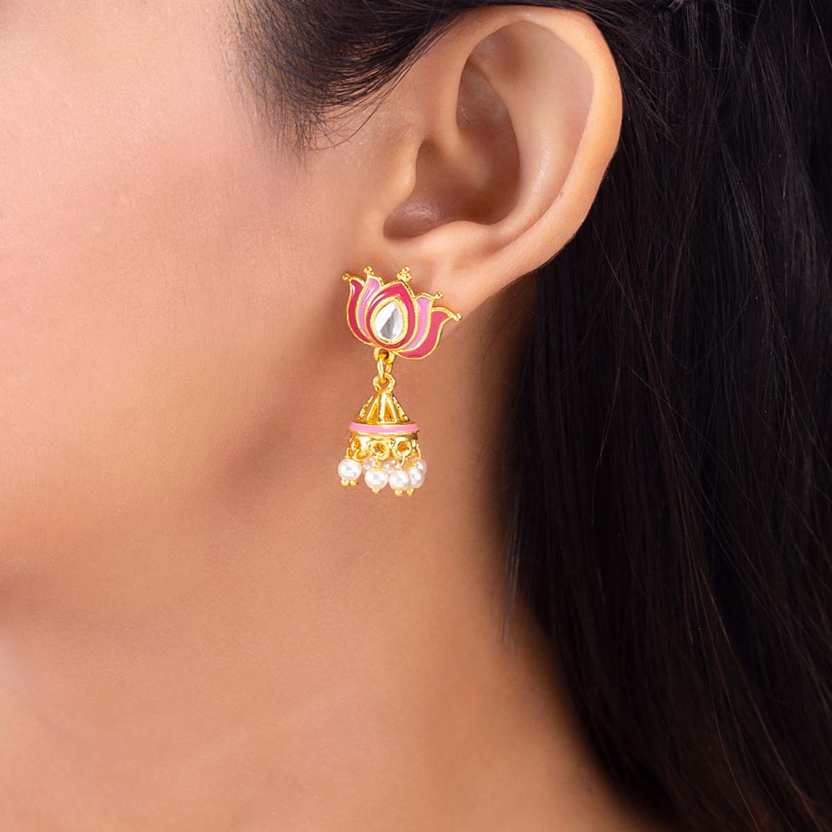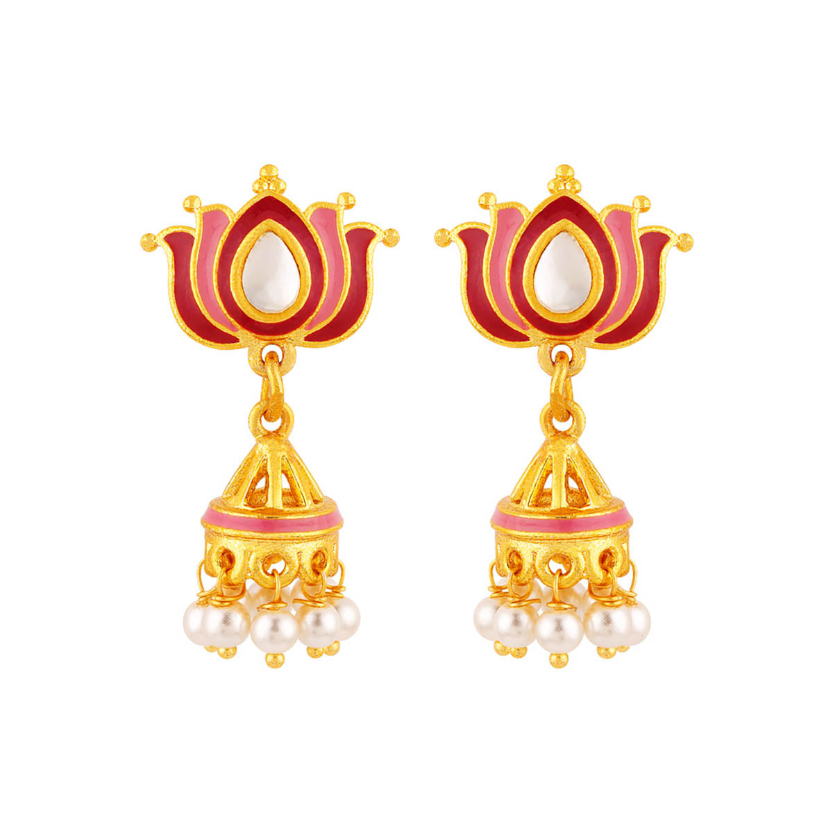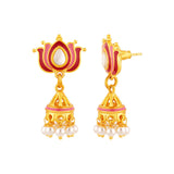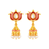 Lotus jhumka drop earrings made from brass and yellow gold plated. Enameled and faux pearls embellished. Wear with a casual saree.