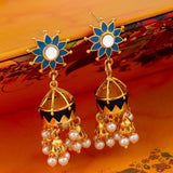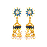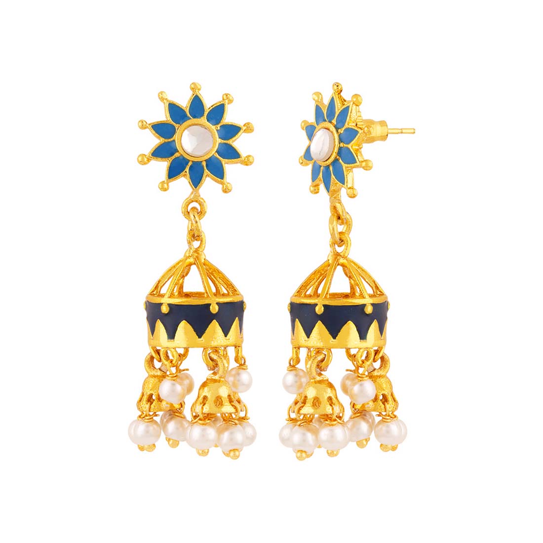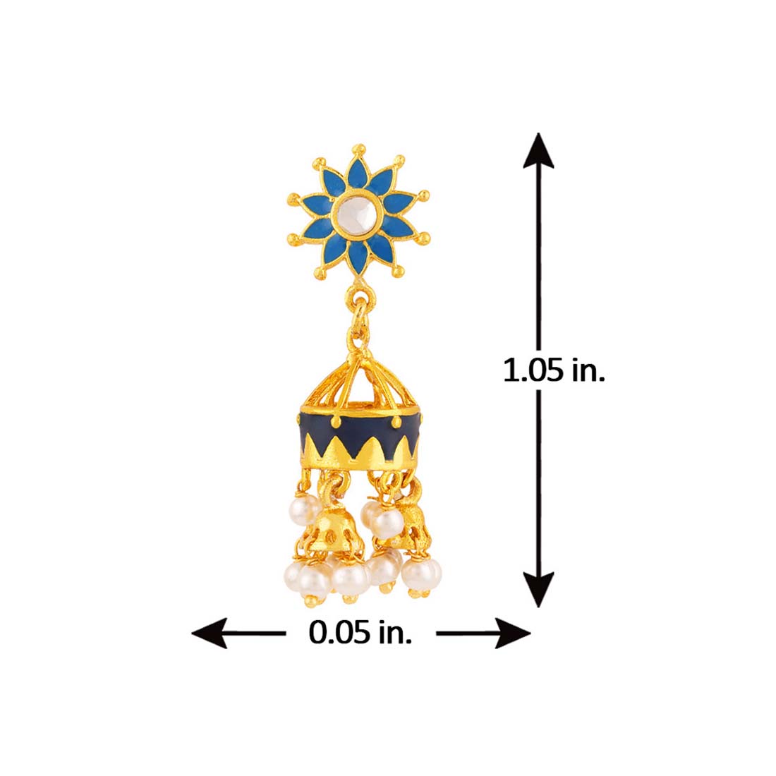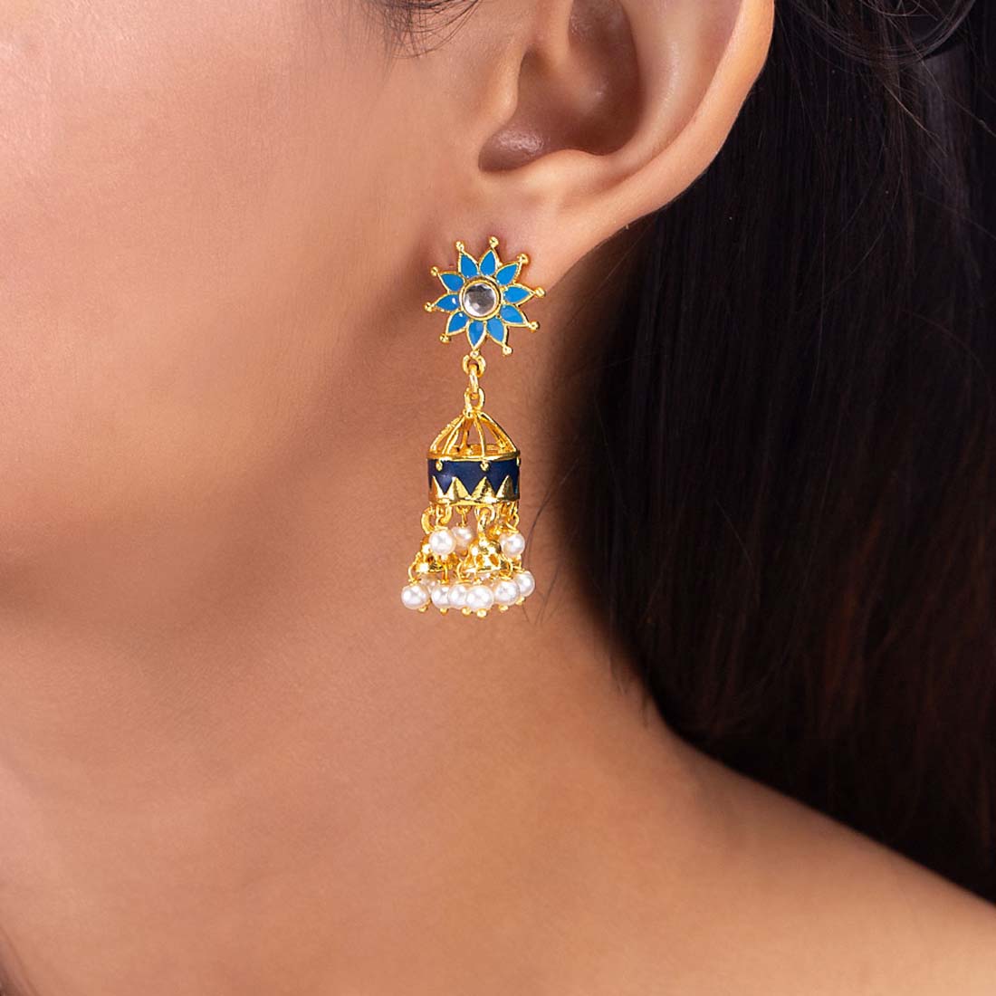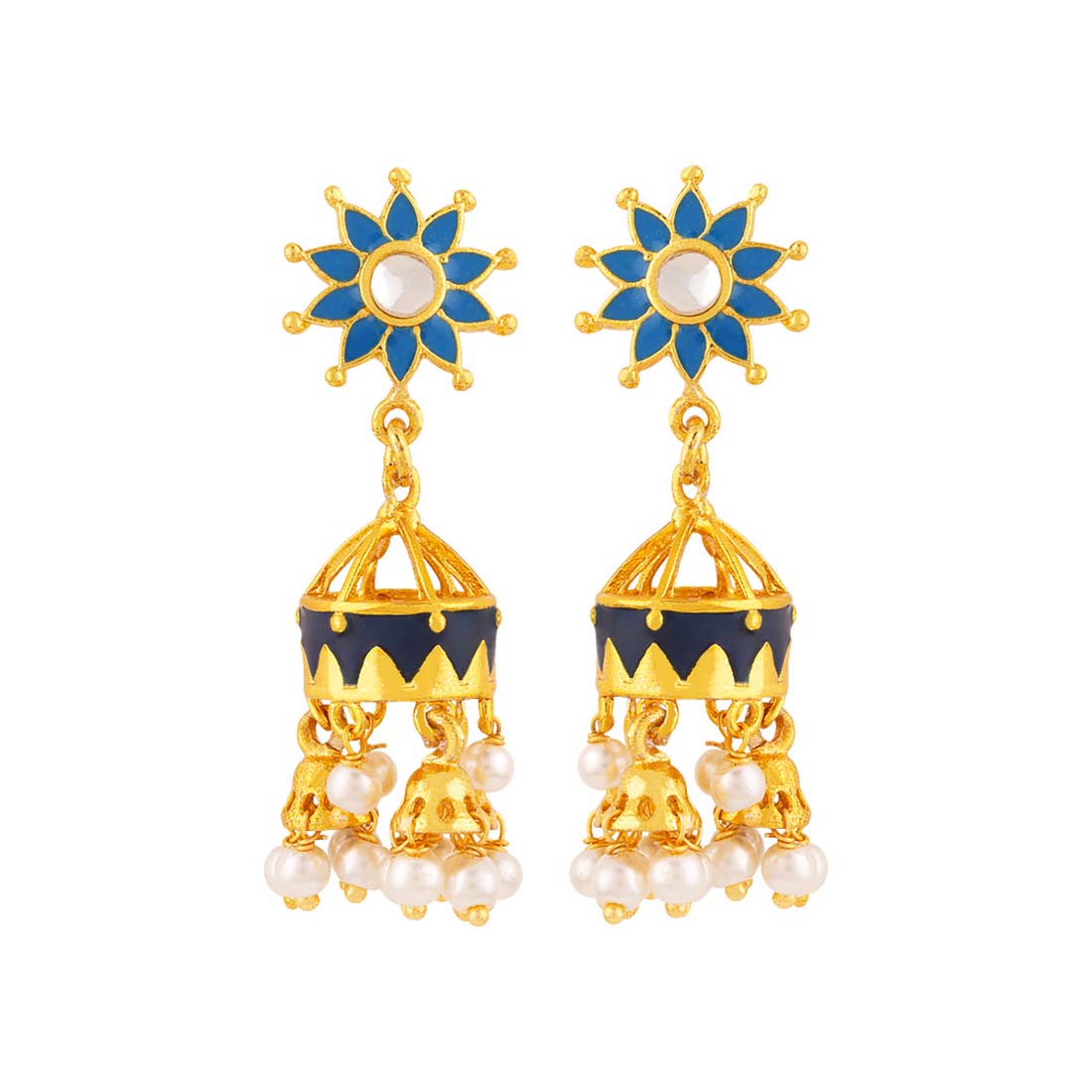 Tiny jhumka drop earrings made from brass and yellow gold plated. Enameled and a good match for casual ethnic and Indo-Western looks.