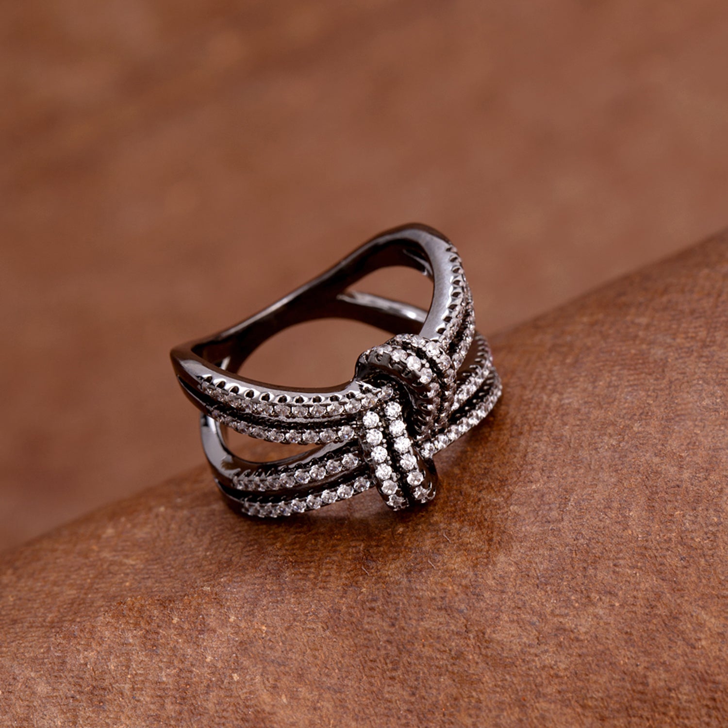 Knotted style brass ring with CZ gems. Black rhodium plated. Good for formal wear.