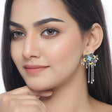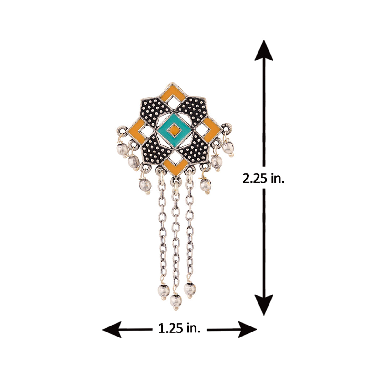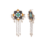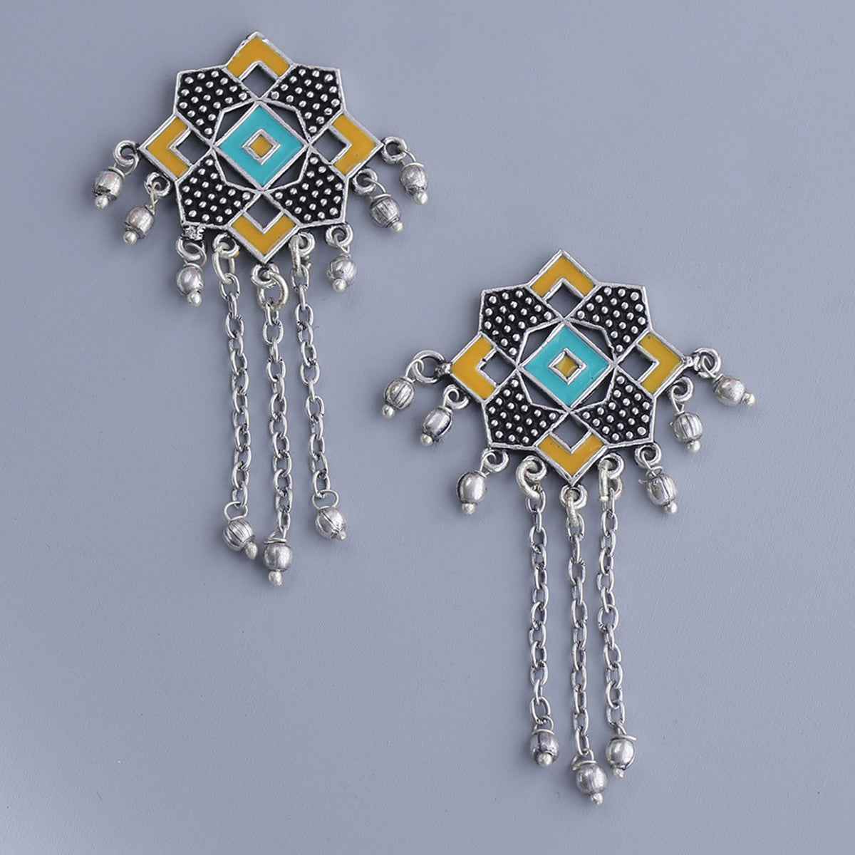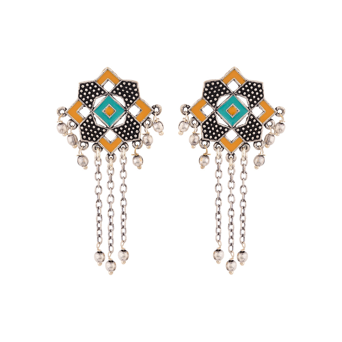 Geometric design tassels drop earrings, enamaled and oxidised silver plated. Fashioned out of brass. Pair with a summer dress.